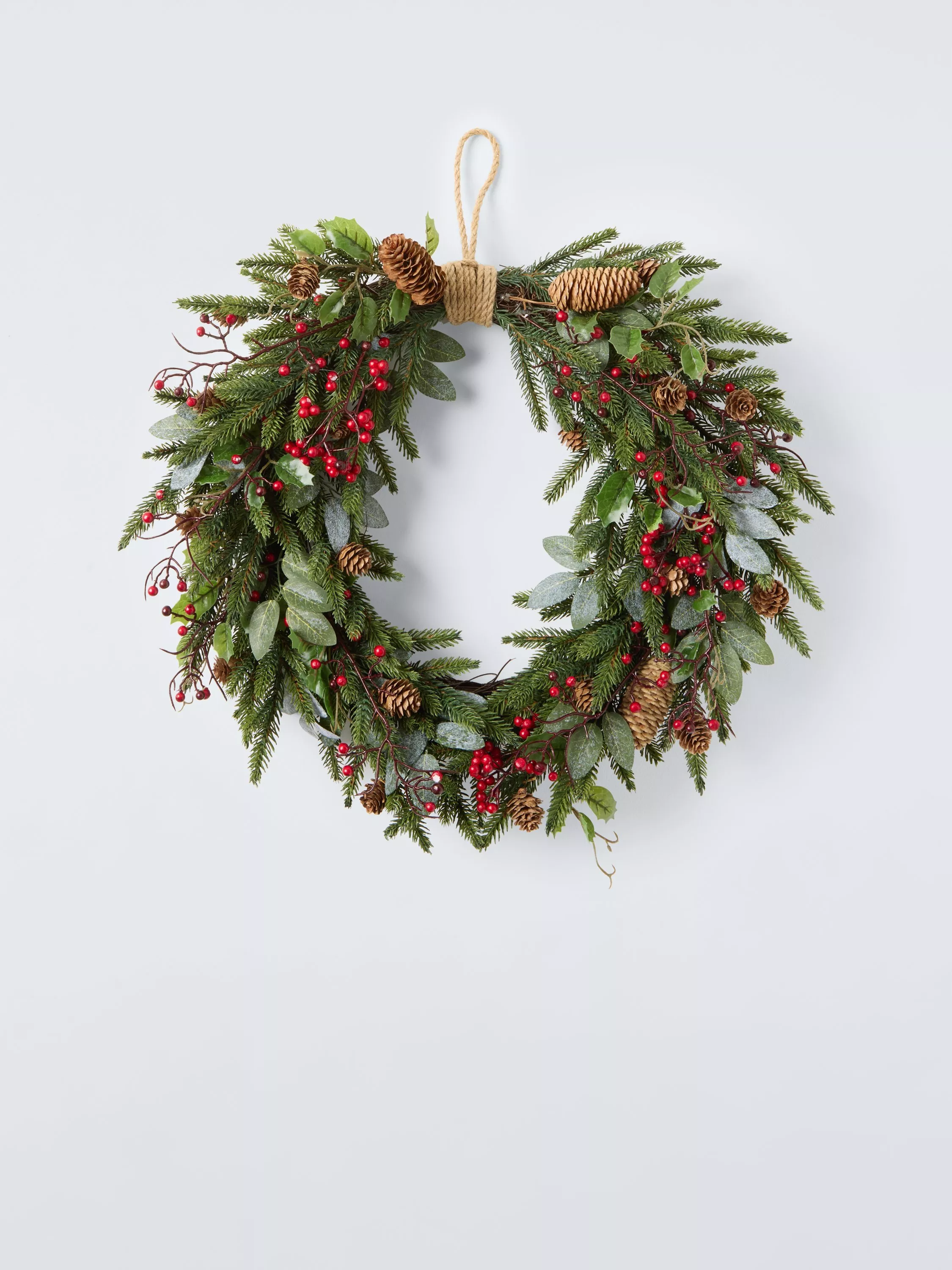 Decorate your door with this festive wreath, which features lightly frosted leaves, faux berries and real pine cones.