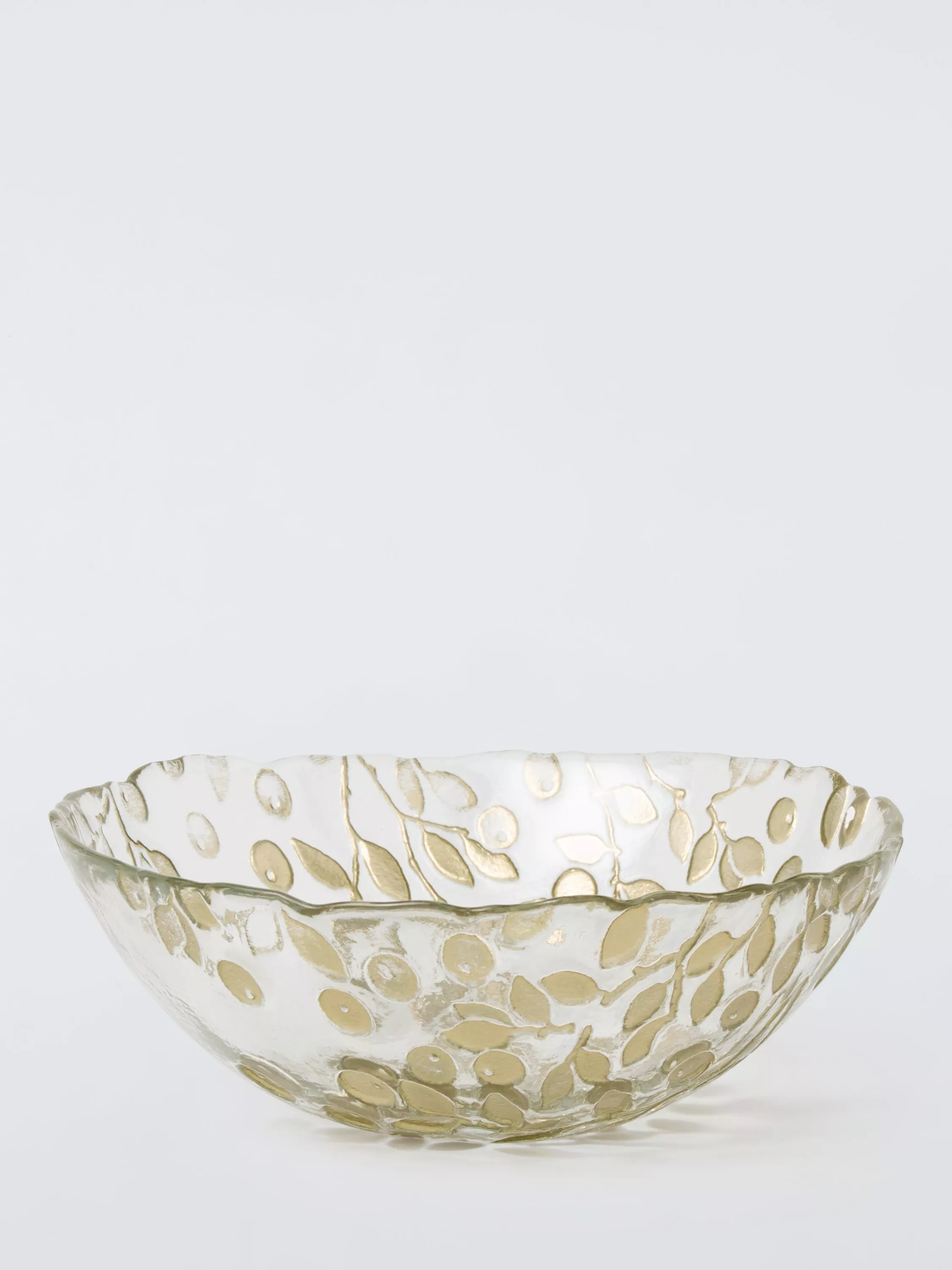 Festive berry-patterned and textured deep glass serving bowl with a scalloped edge.