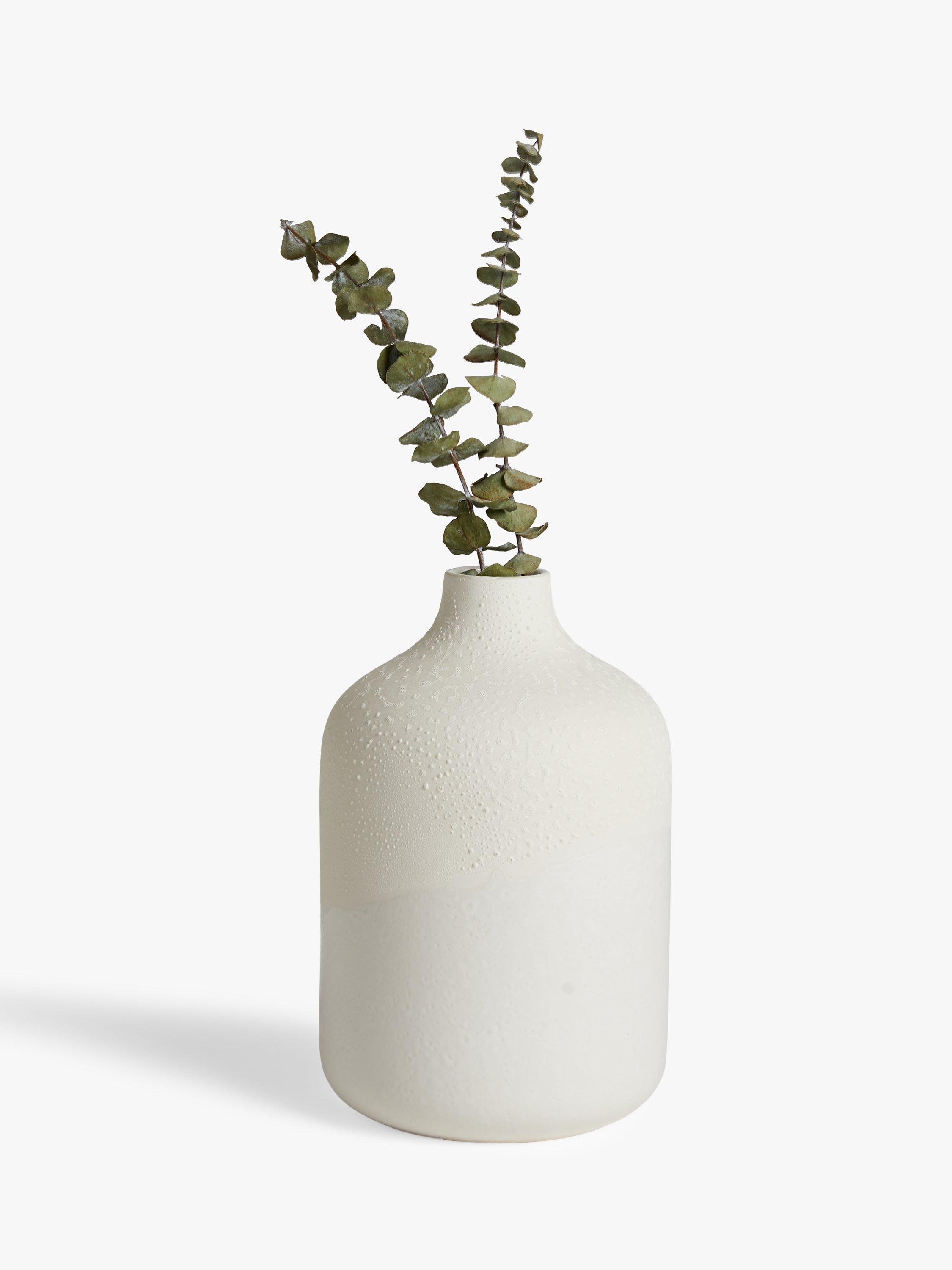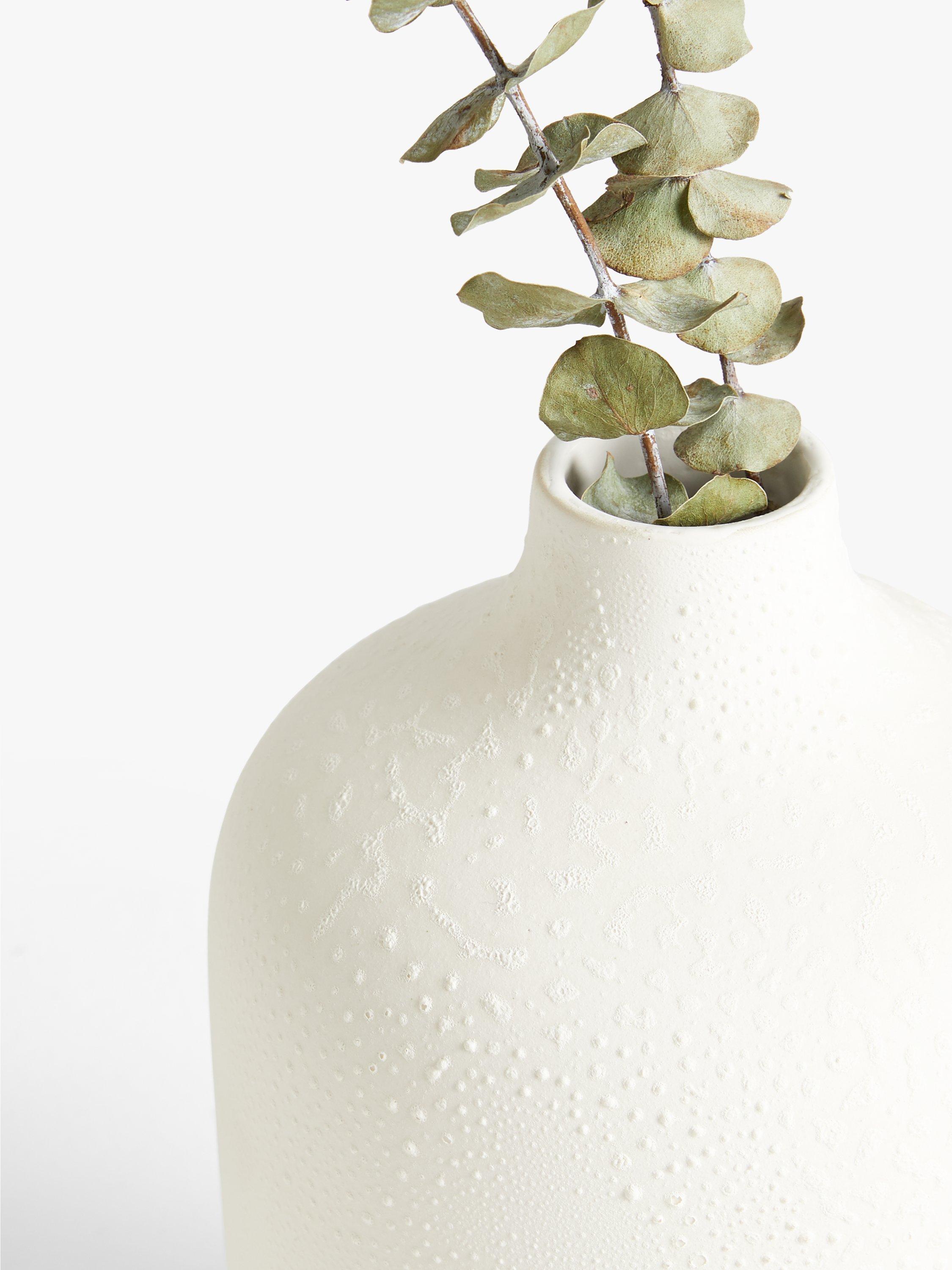 A subtly textured design in an unusual shape, this vase will fit right into a calm and cosy home space. The narrow mouth means it's suited for a single stem or branch.