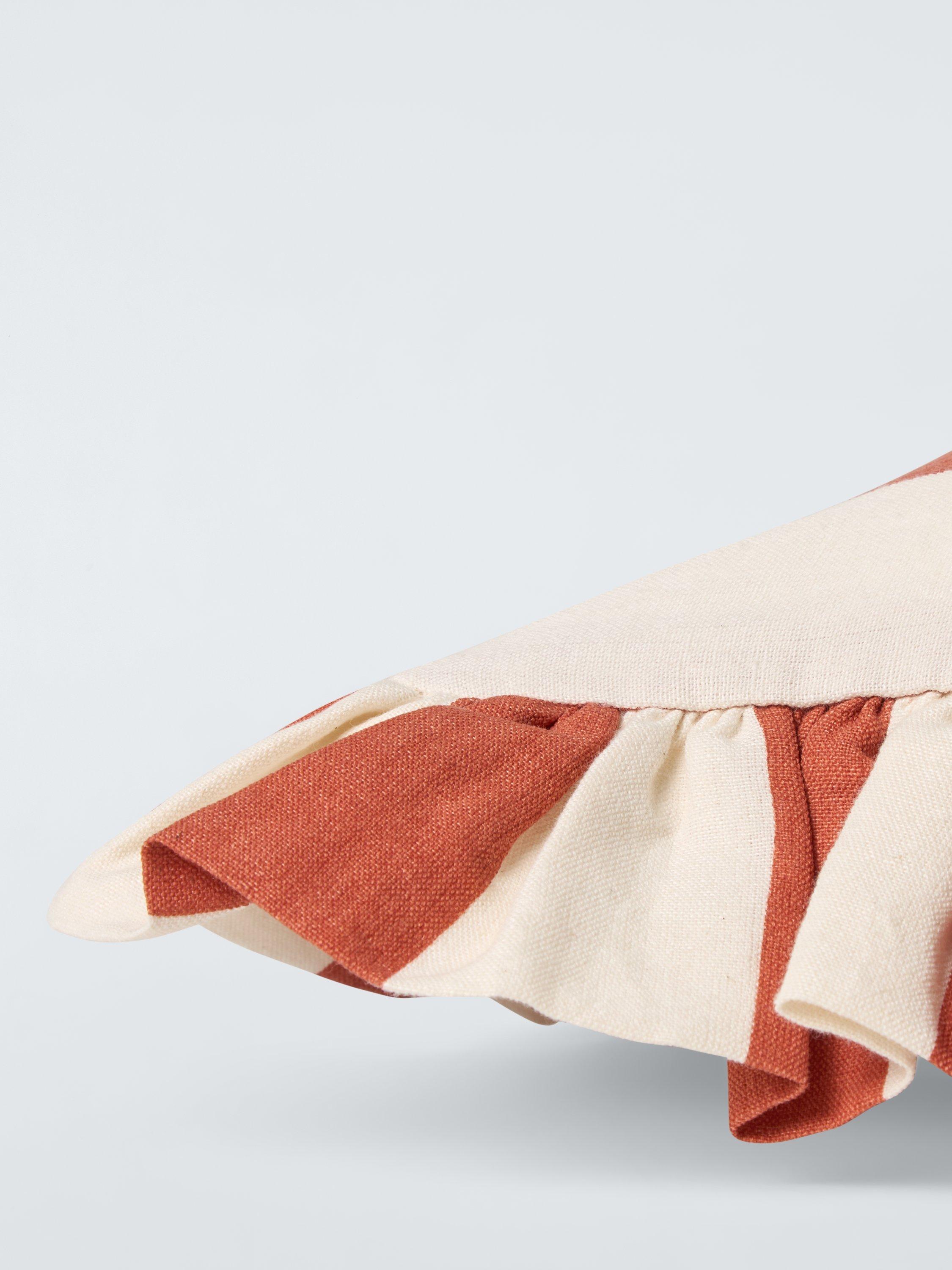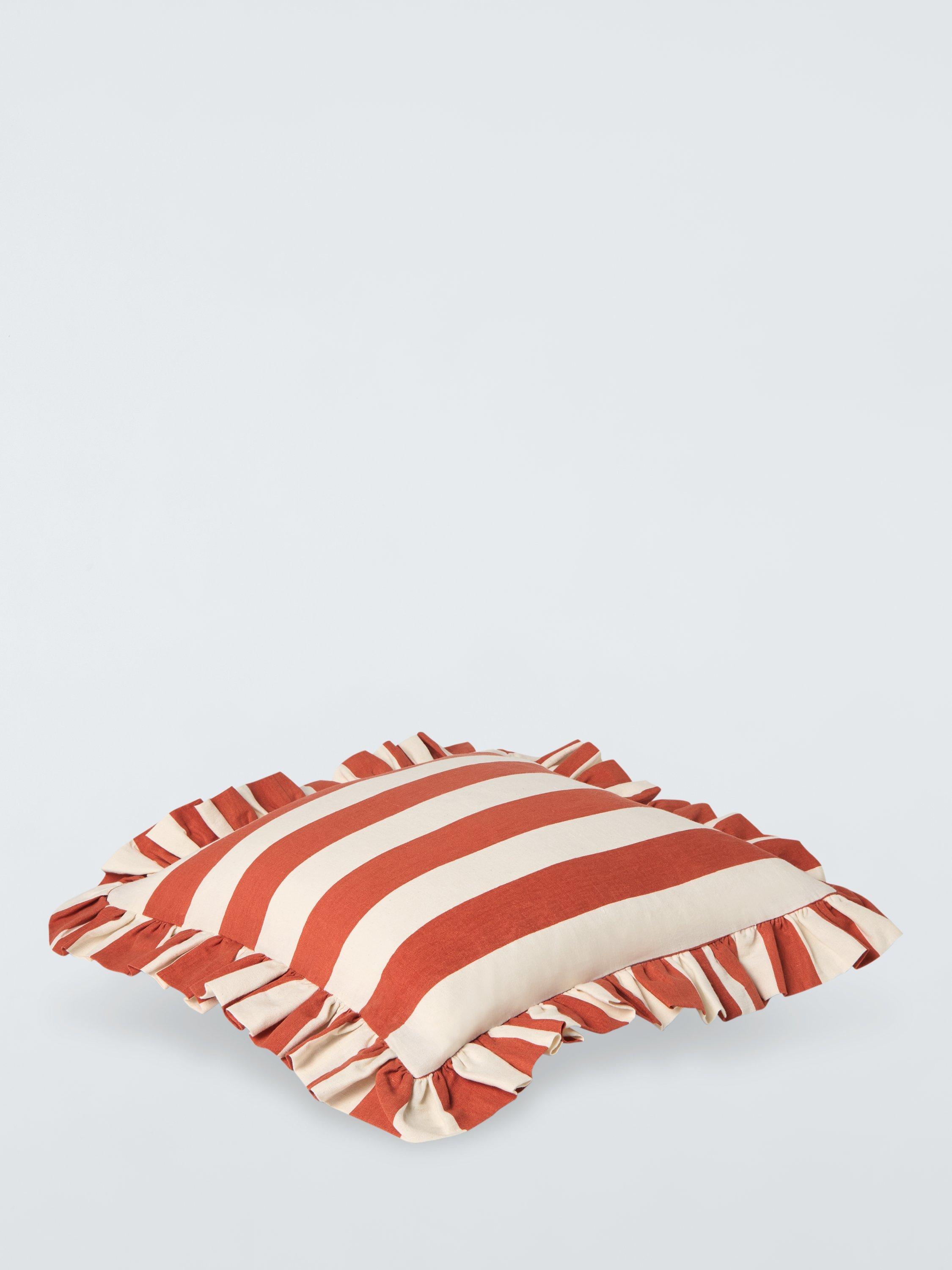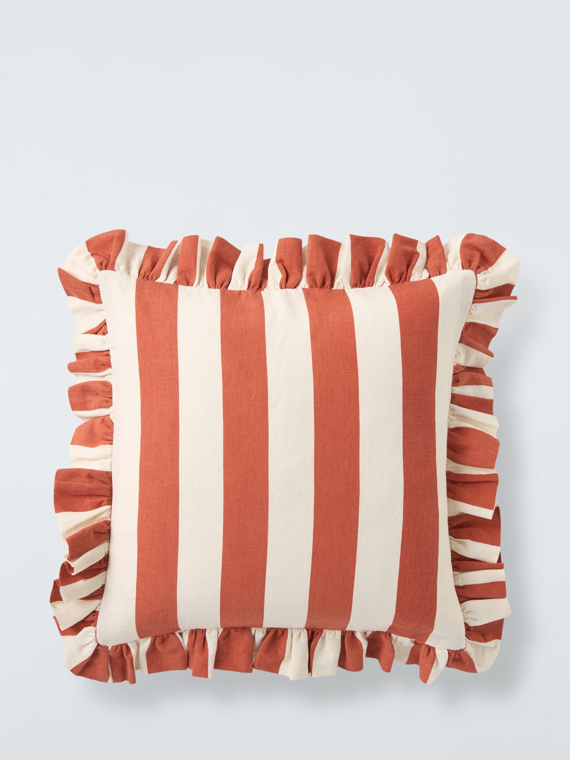 Frilled cotton and linen blend stripe cushions in a variety of summery shades to give any room a swift seasonal update.