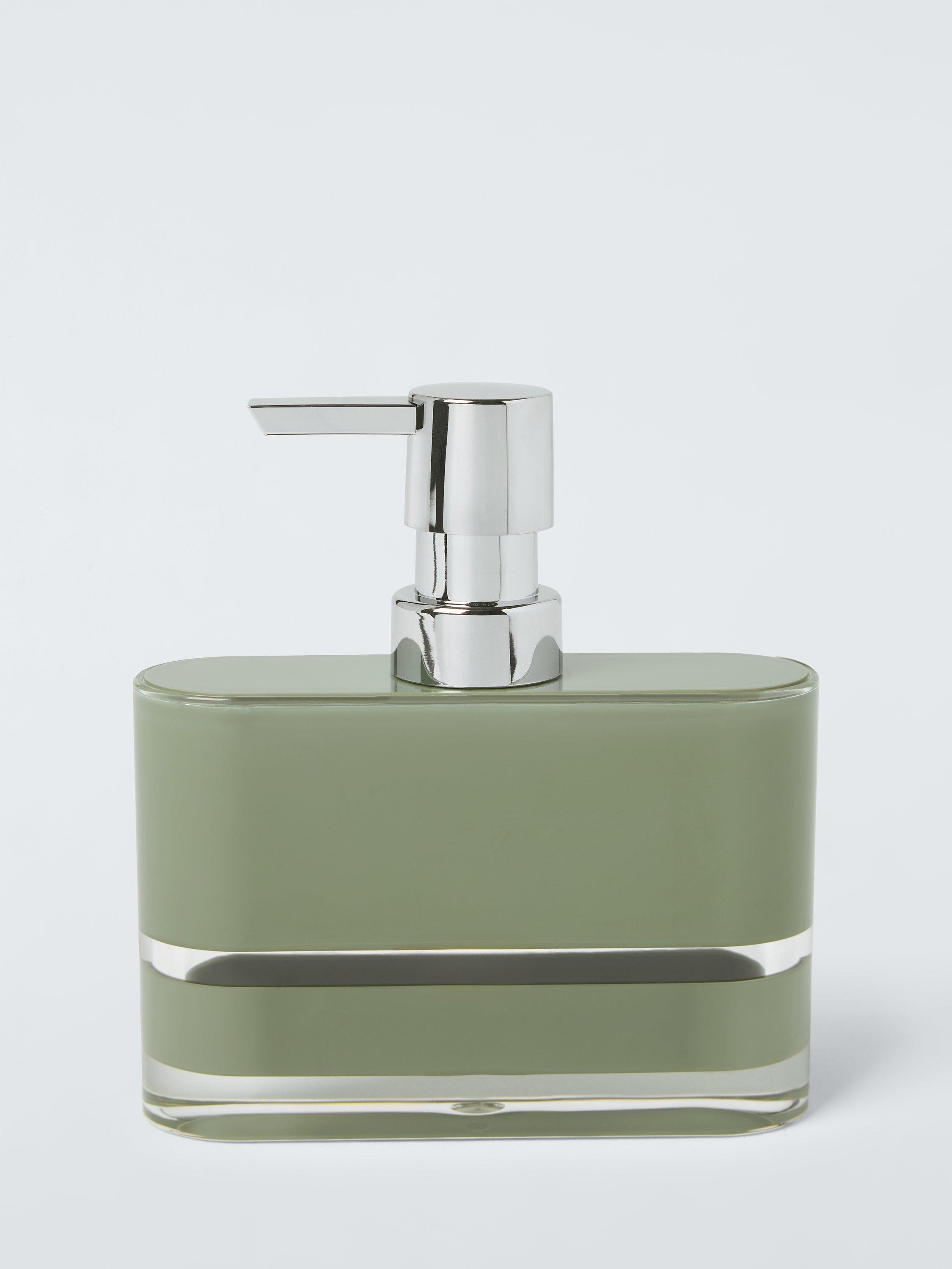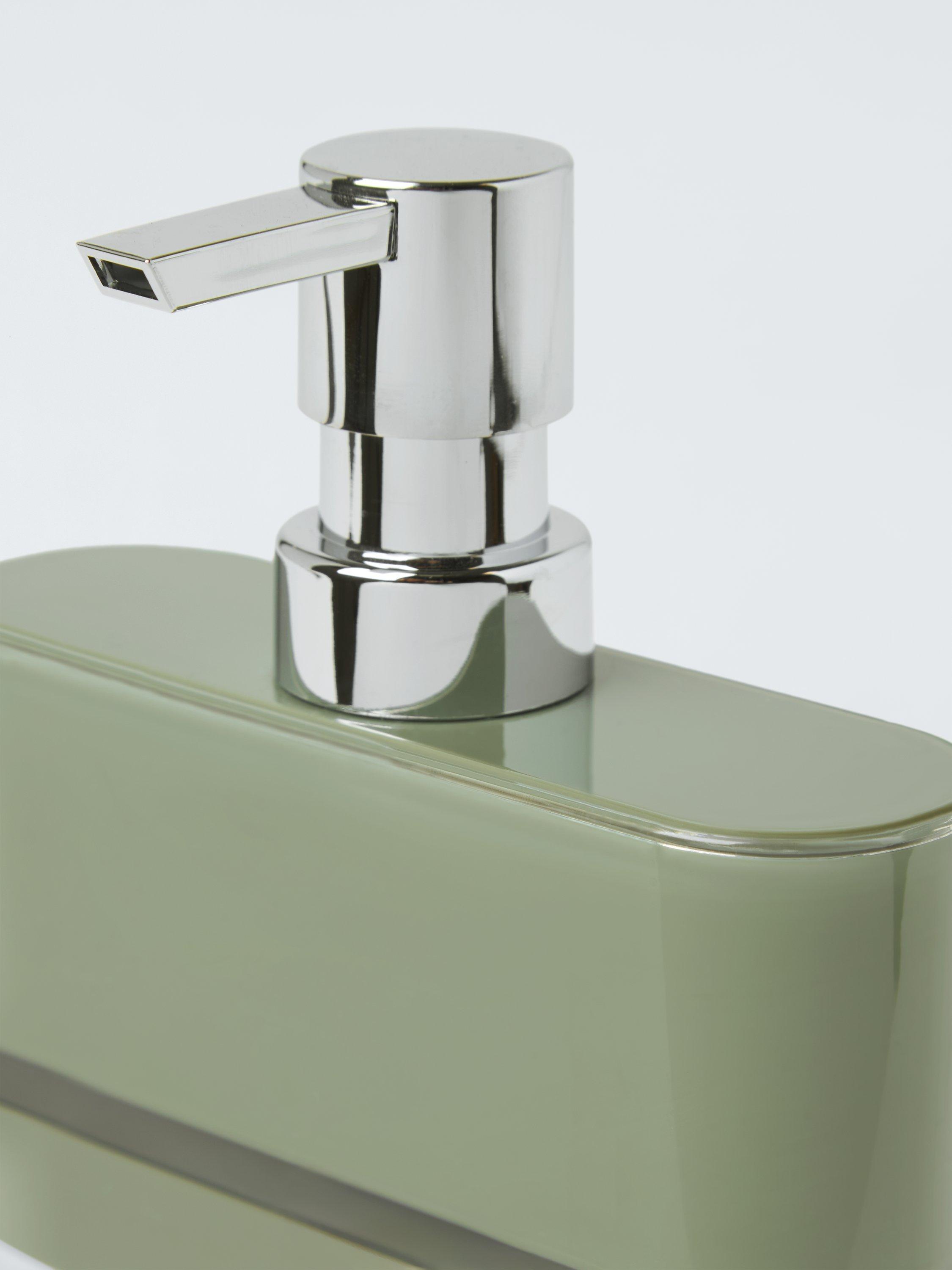 A simple soap dispenser with pastel teal colouring.