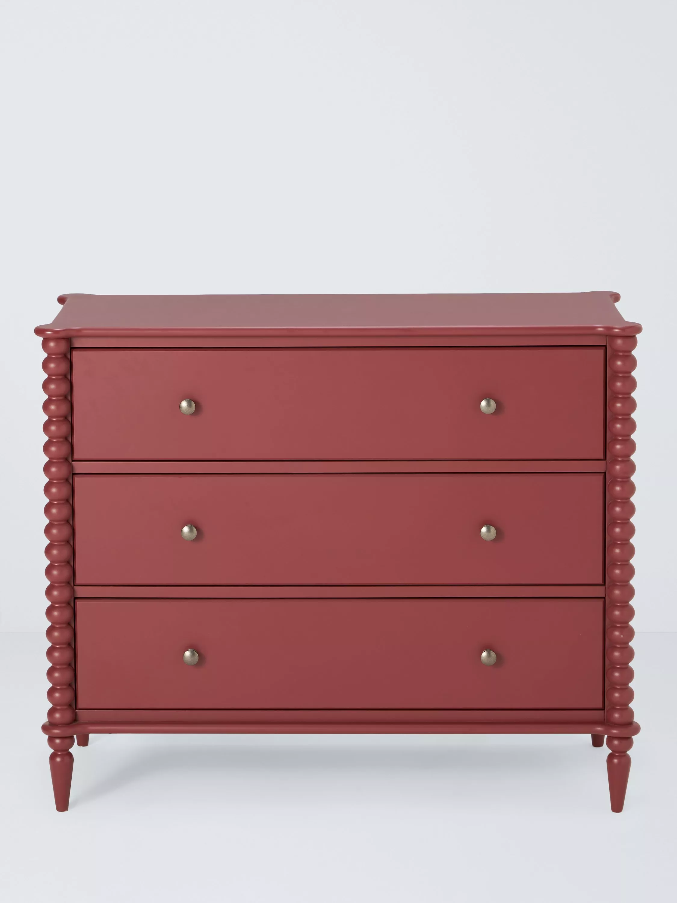 A revival of eclectic 17th century designs, our Bobbin range of furniture will bring a heritage feel back into your home. Decorative design points are awarded for this painted chest's round bobbin legs and shapely frame, which adds character and charm, and it's also impressively sturdy thanks to a combination of high-quality rubberwood and MDF. Complete with three deep drawers, who said storage had to be boring? This one is practically sized and a perfect amount of playful.