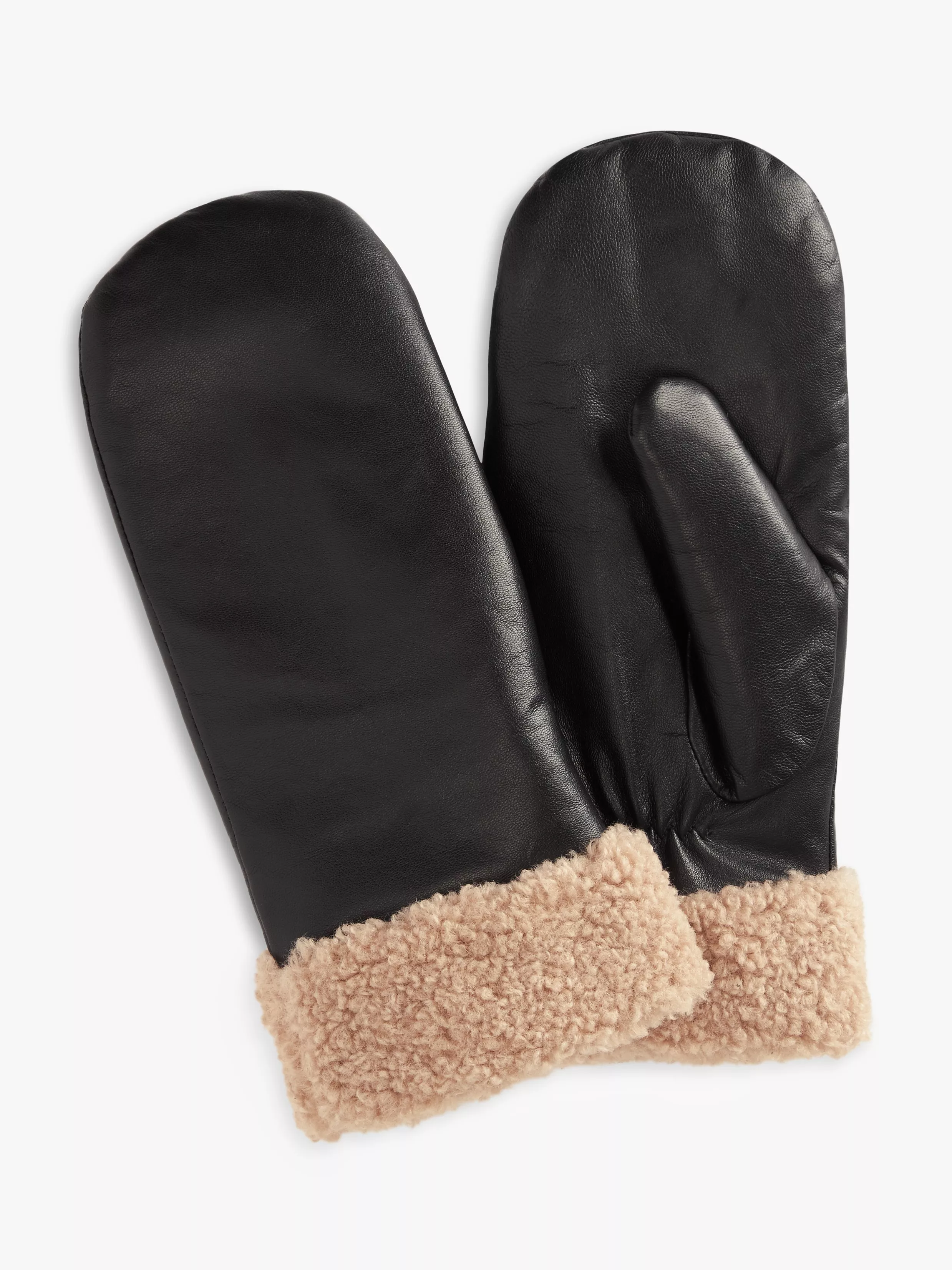 John LewisBorg Cuff Leather Mittens, Black/Natural