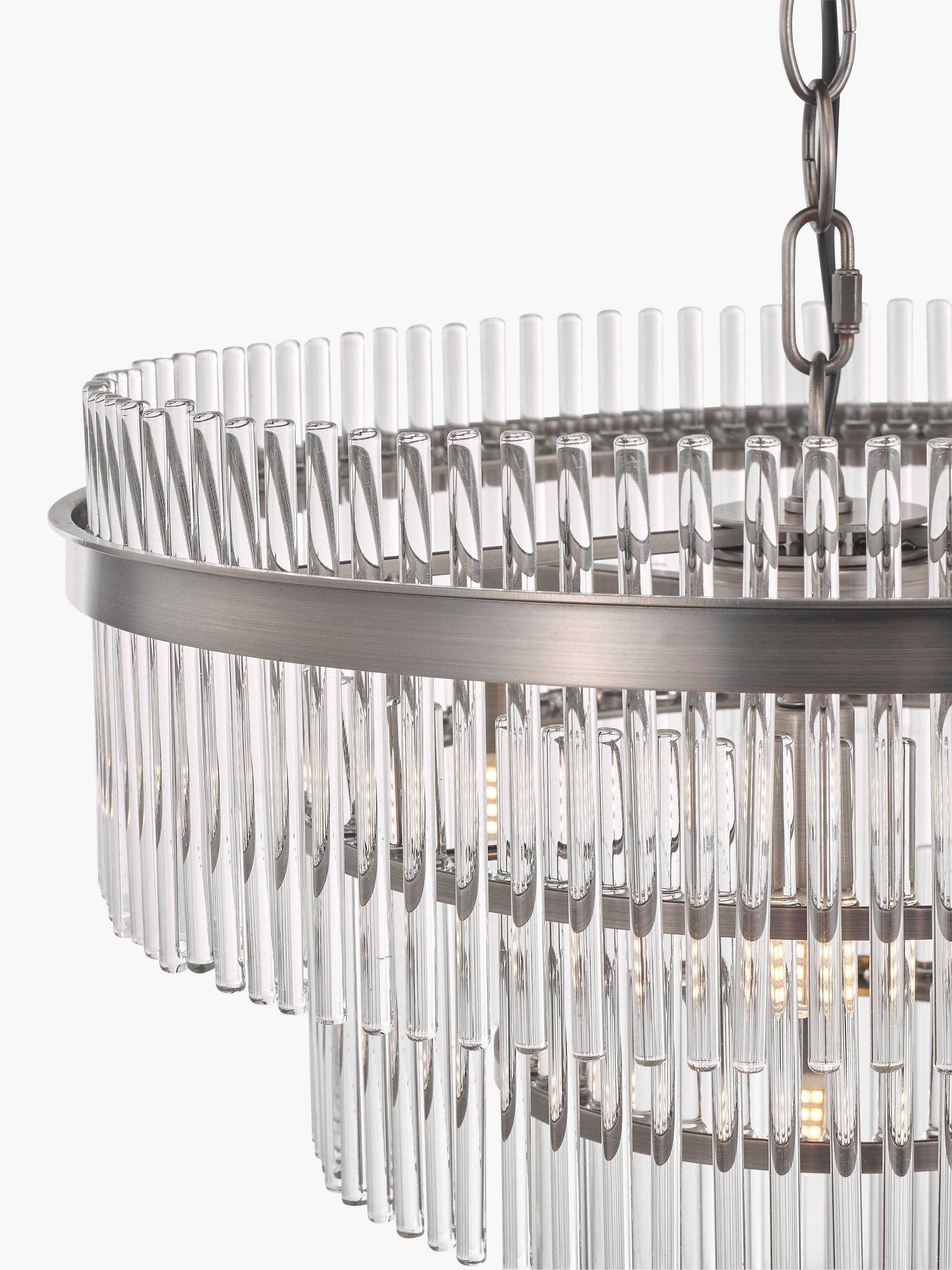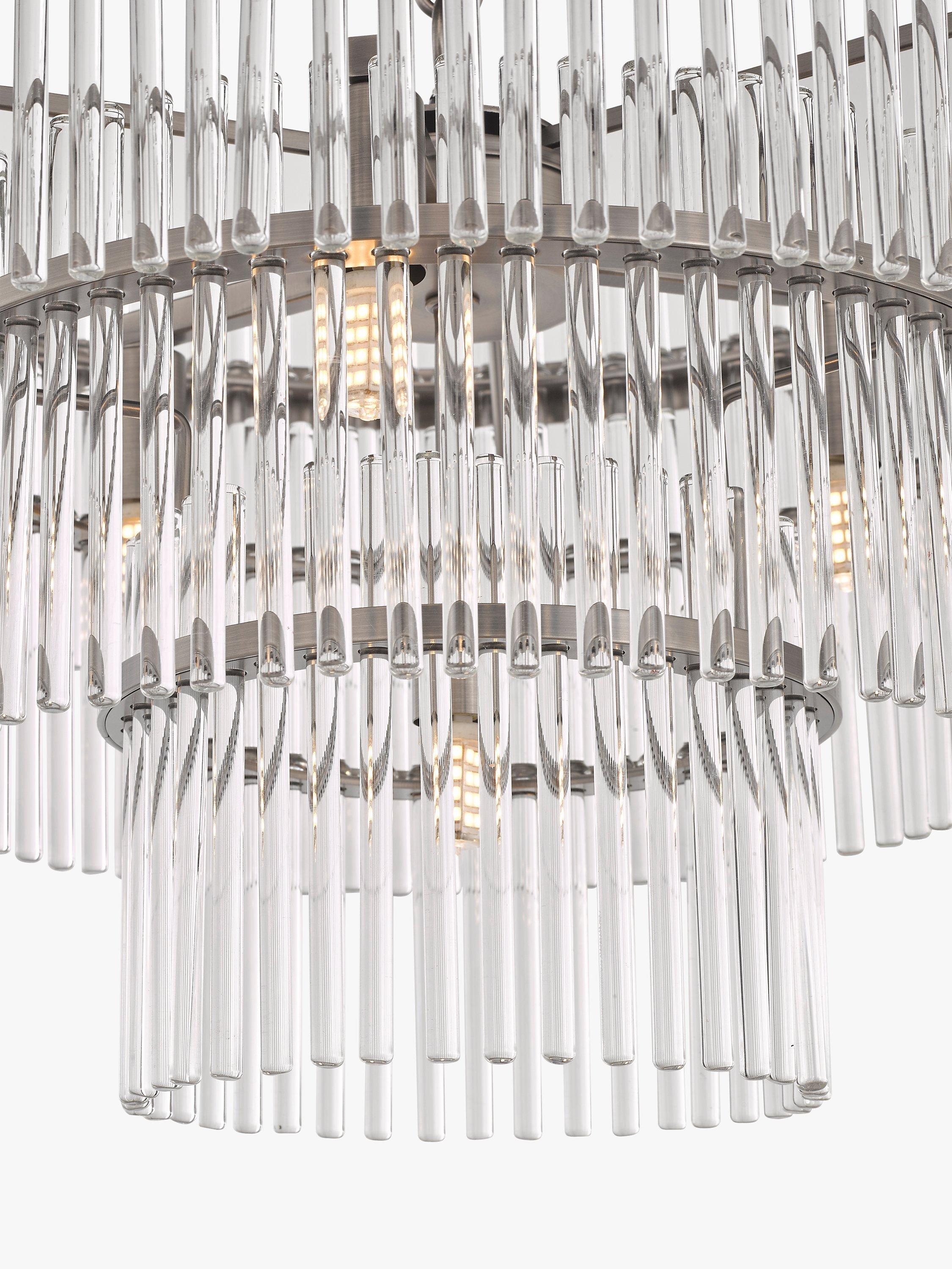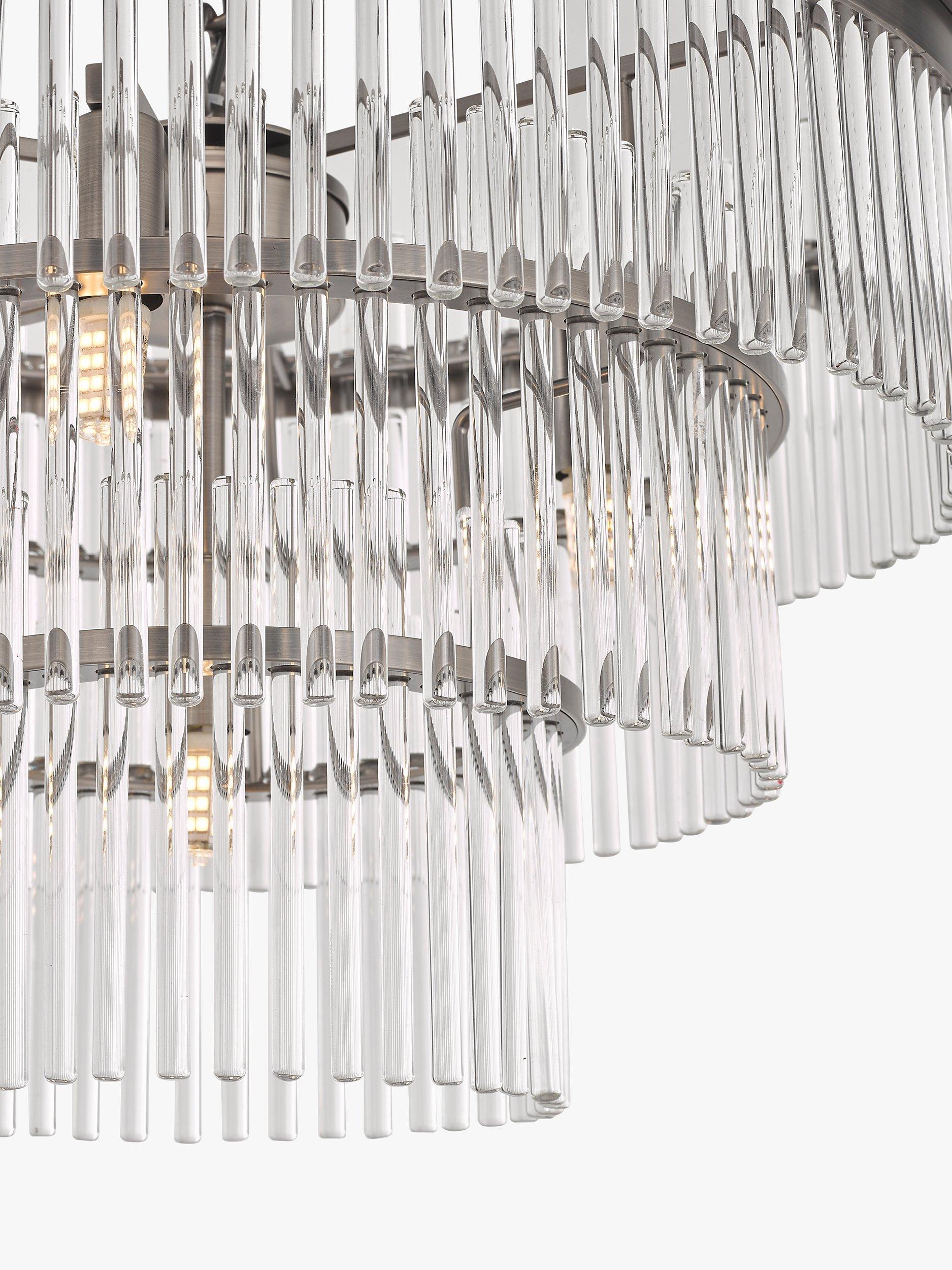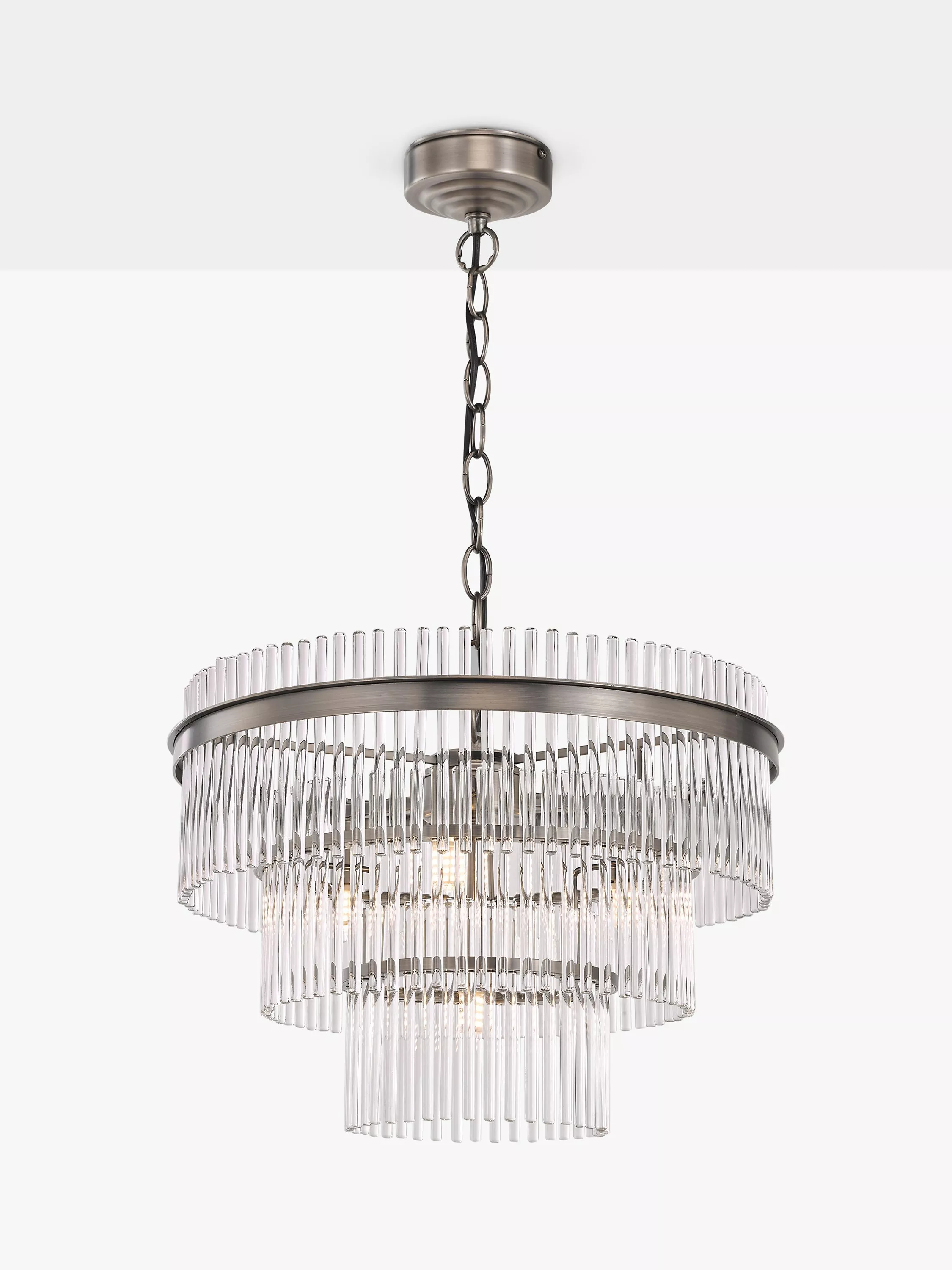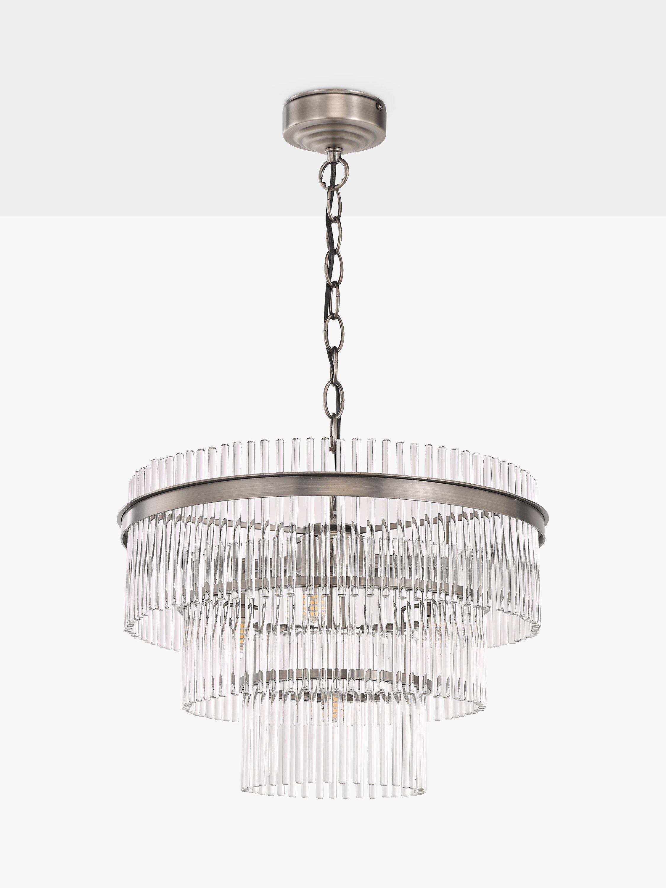A contemporary re-design of the classic crystal chandelier. We've made this ceiling light with a triple tier of rod glass, designed to refract light and enhance a bright glow when the light is switched on, but look equally as impressive when the light is off. Supported by a robust chain, the pendant is height-adjustable for perfect positioning.
