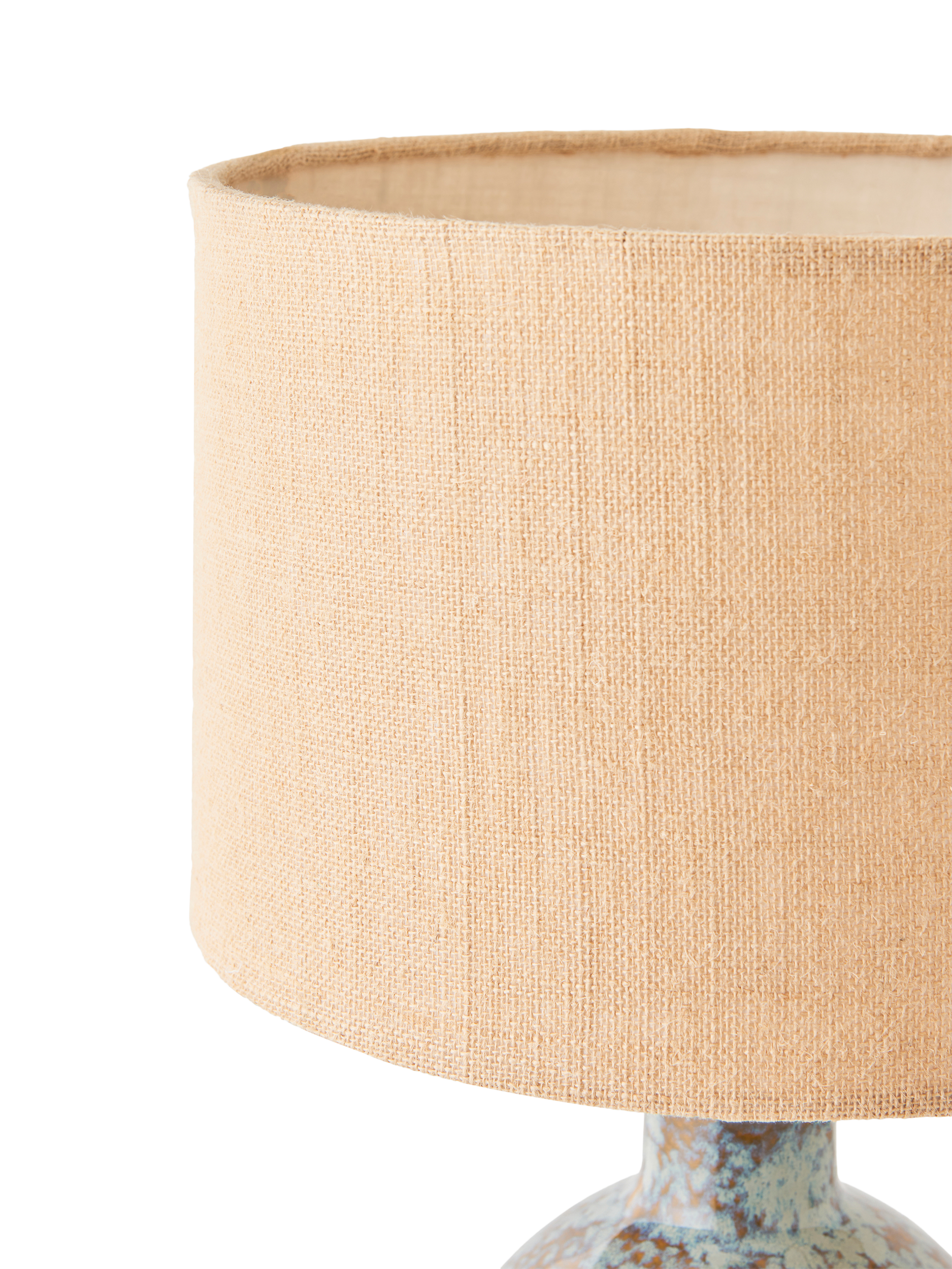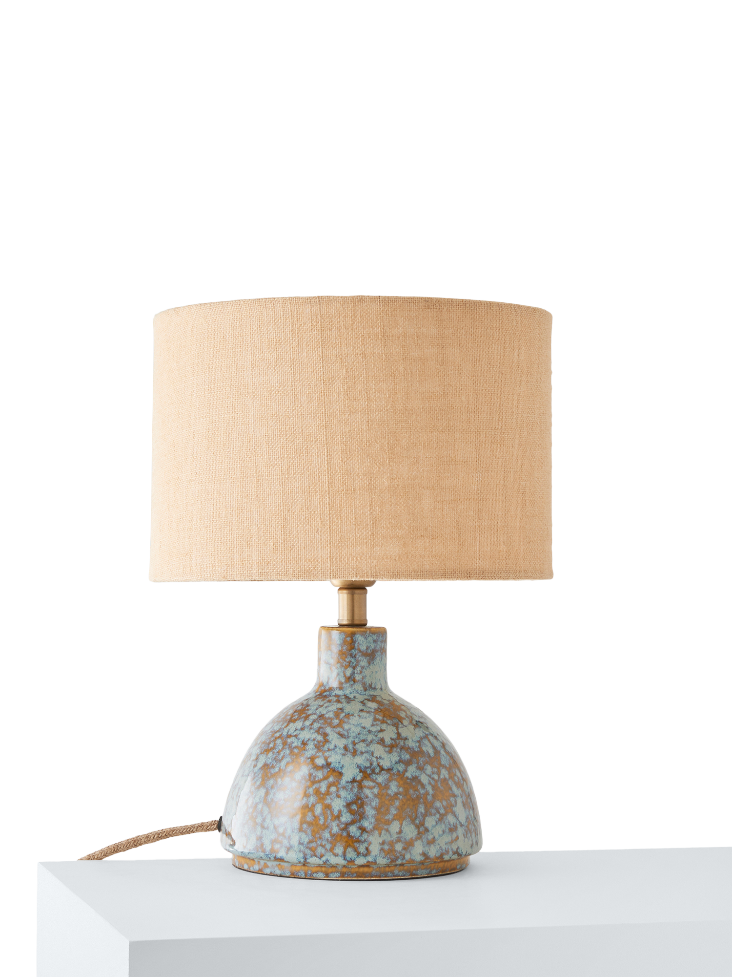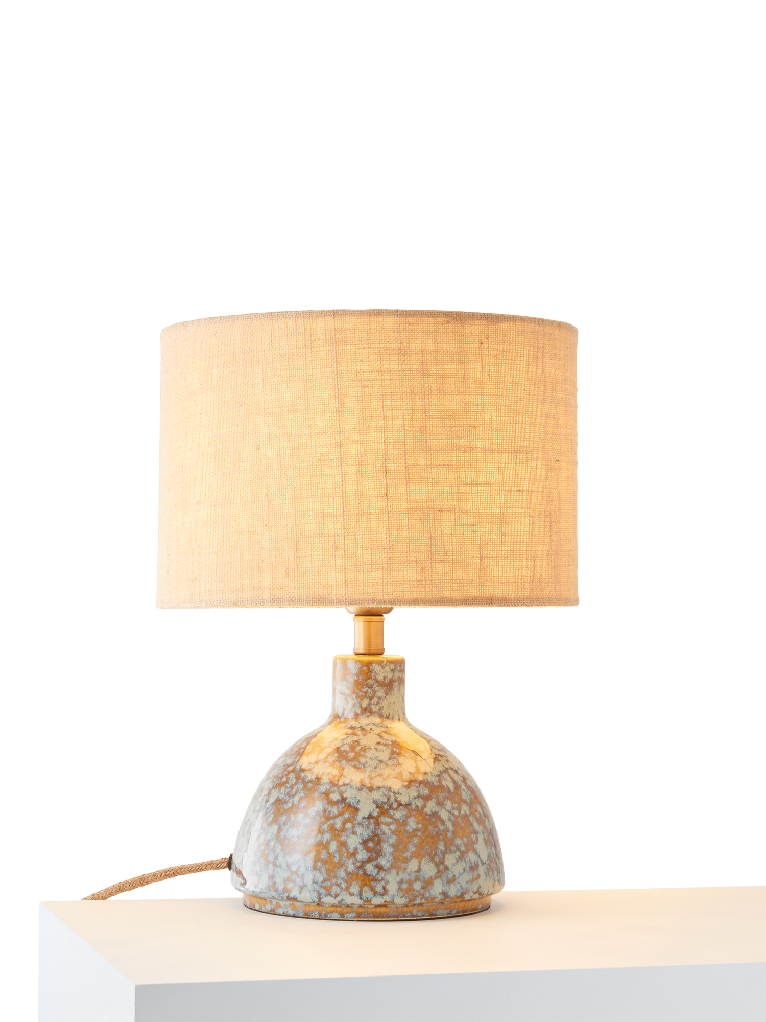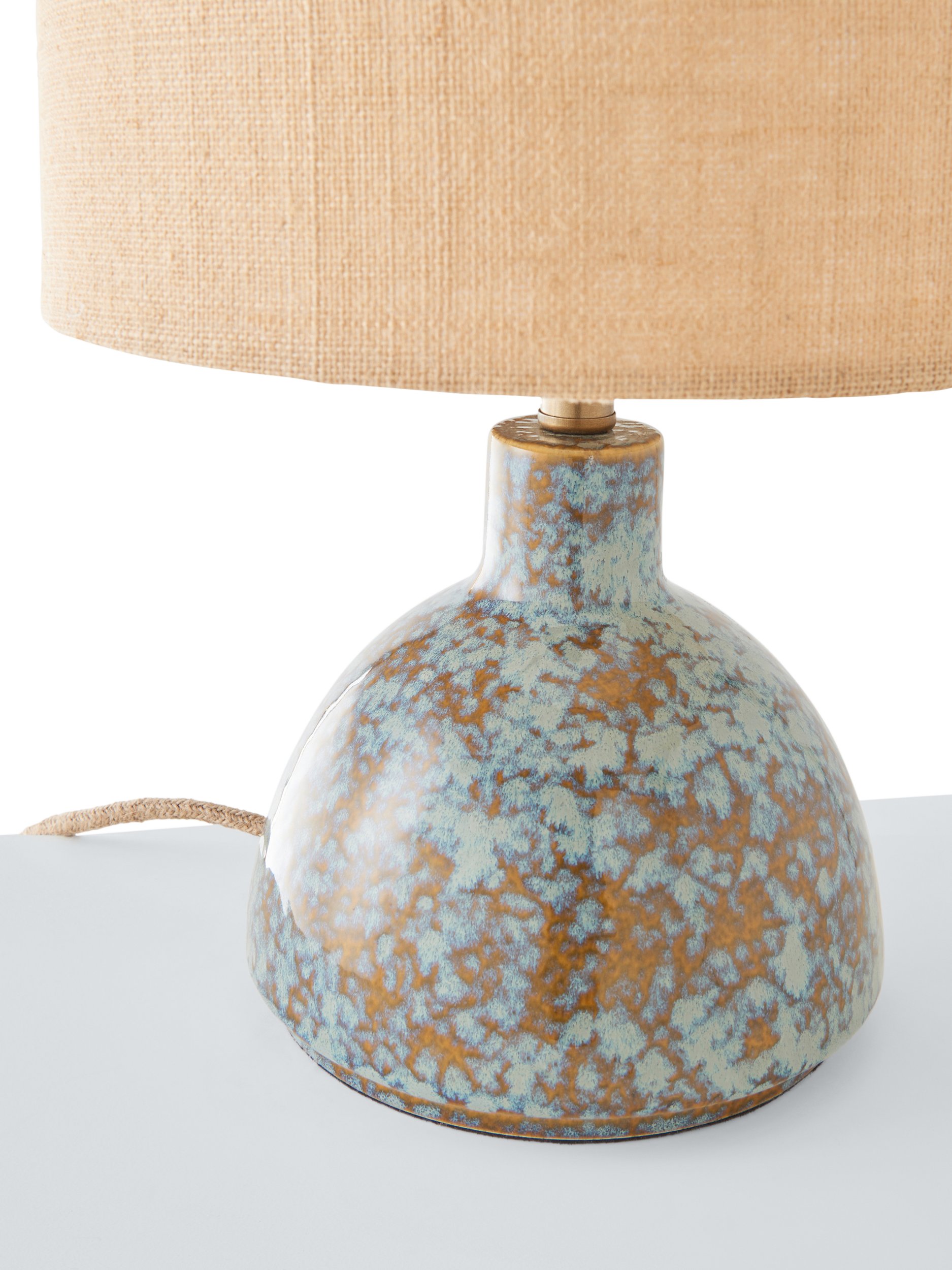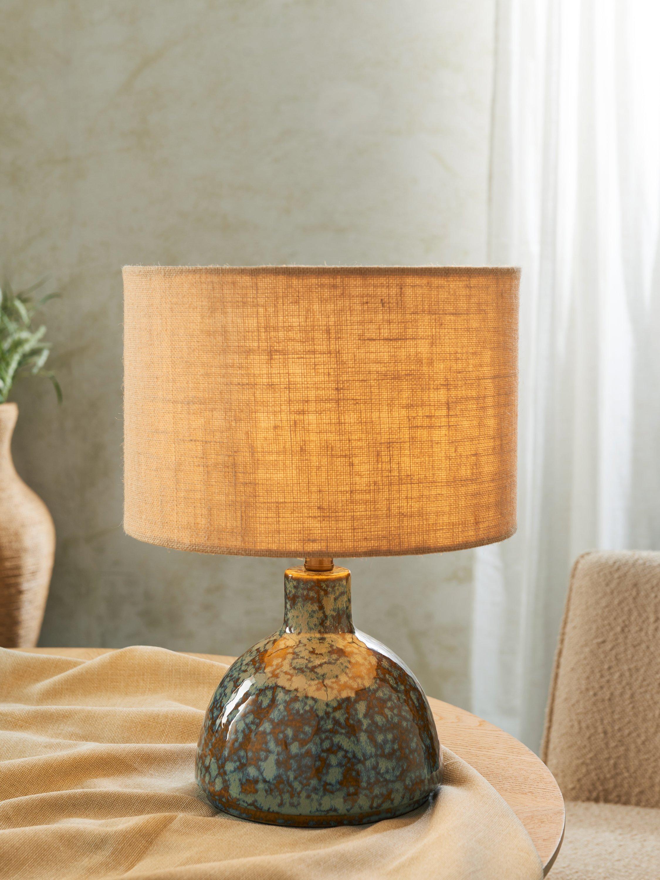 The Botal table lamp has a glossy reactive glaze, which creates a symphony of hues. Paired with a caramel jute shade to diffuse a soft glow of light, it also features a natural jute flex and warm brass accents. Crafted by hand, the distinctive glaze variations are integral to the design, creating a practical lamp that's also a ceramic art piece for your home.