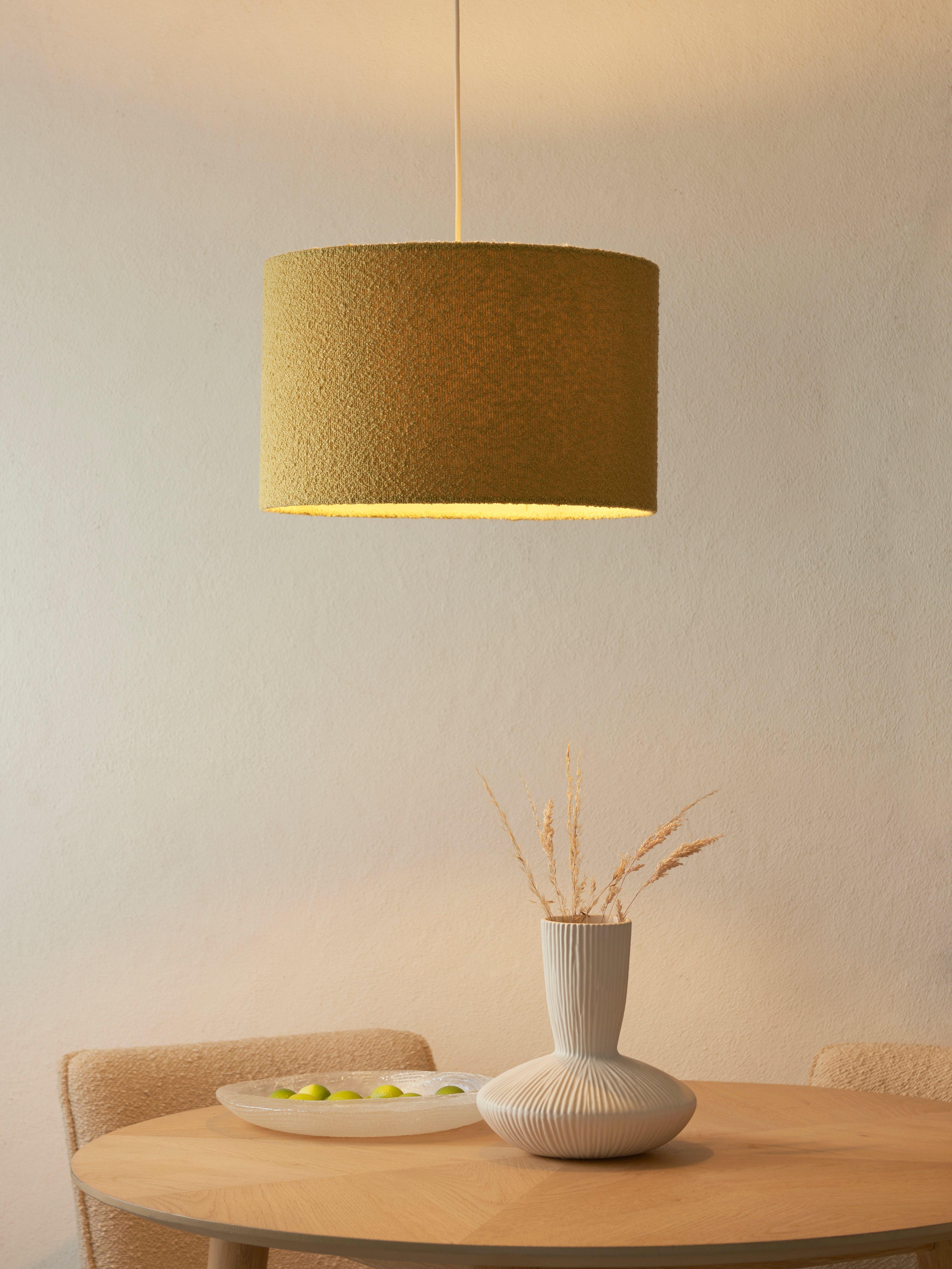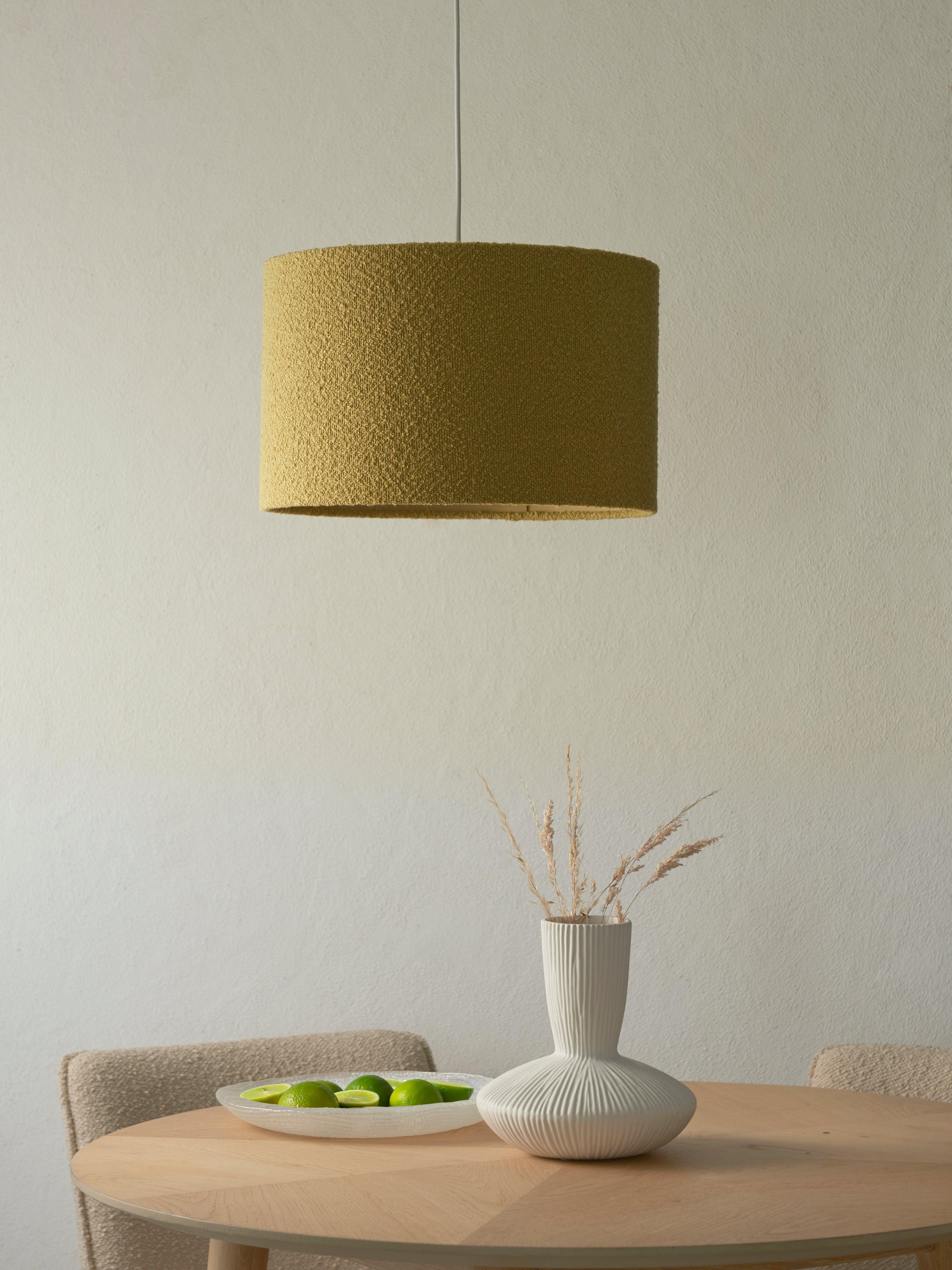 Drum lampshade, designed for a modern look that complements most ceiling fittings in both living rooms and bedrooms. Its trendy boucle fabric brings a sophisticated and warm texture, adding depth and style to any room.