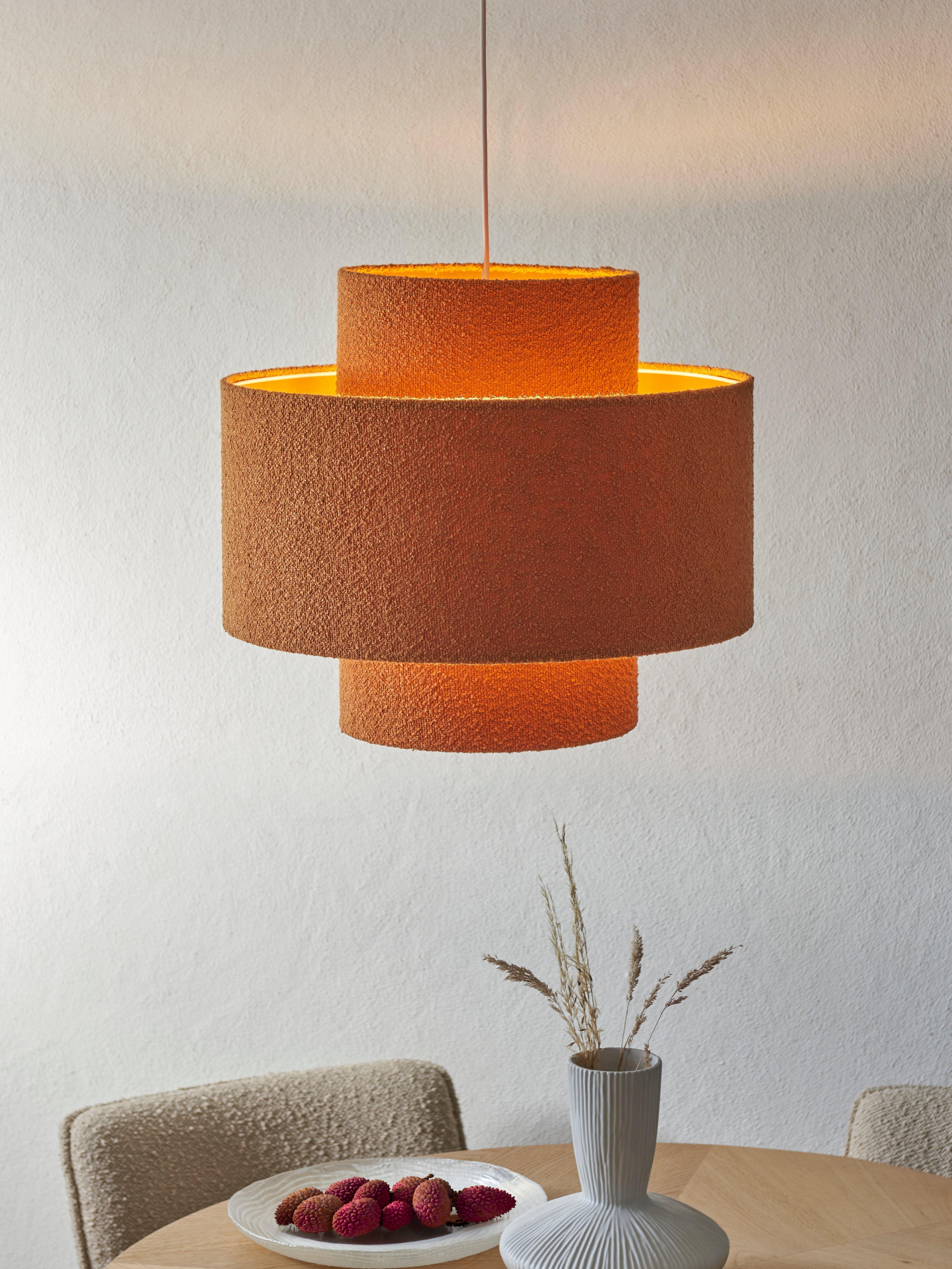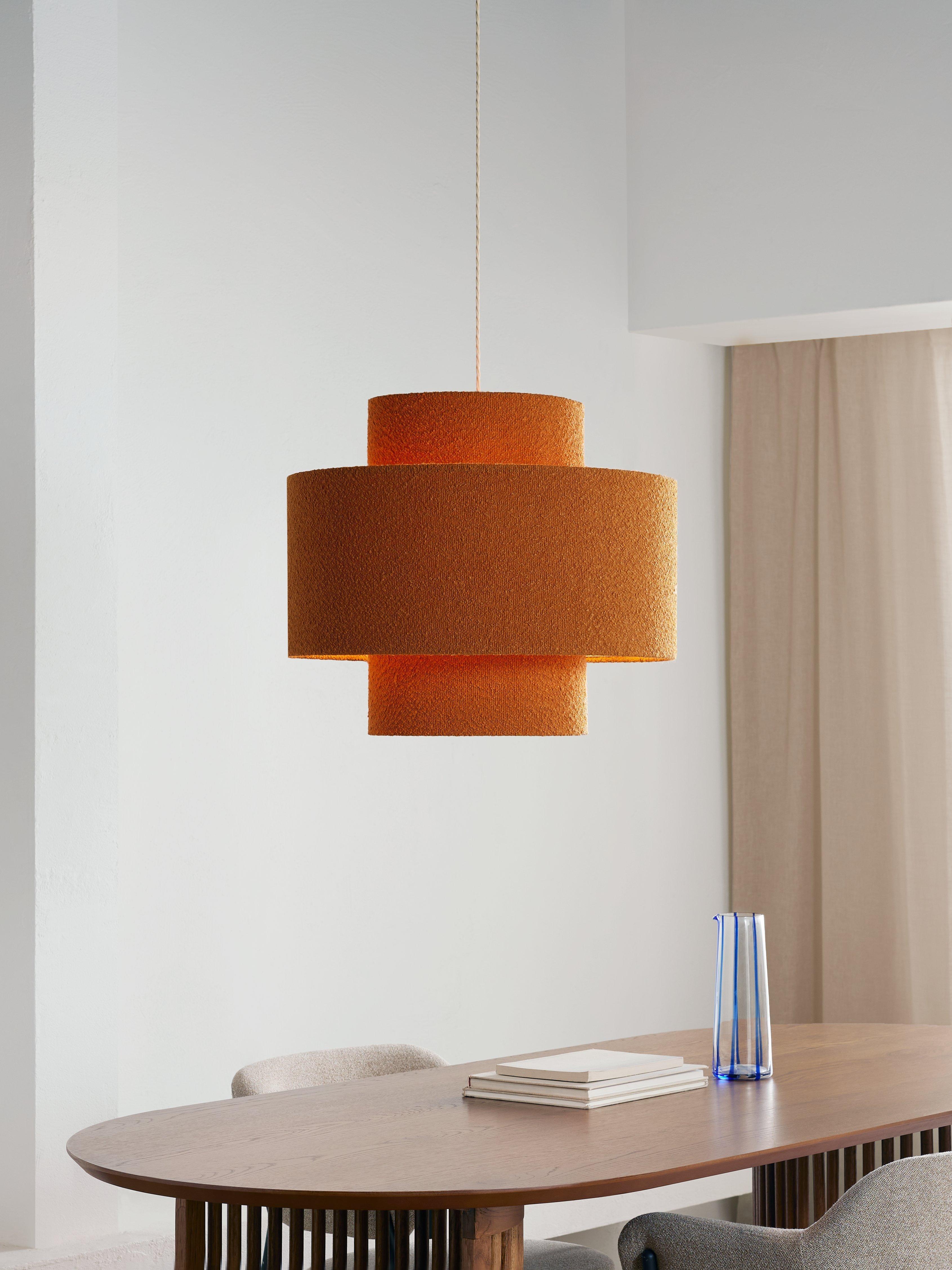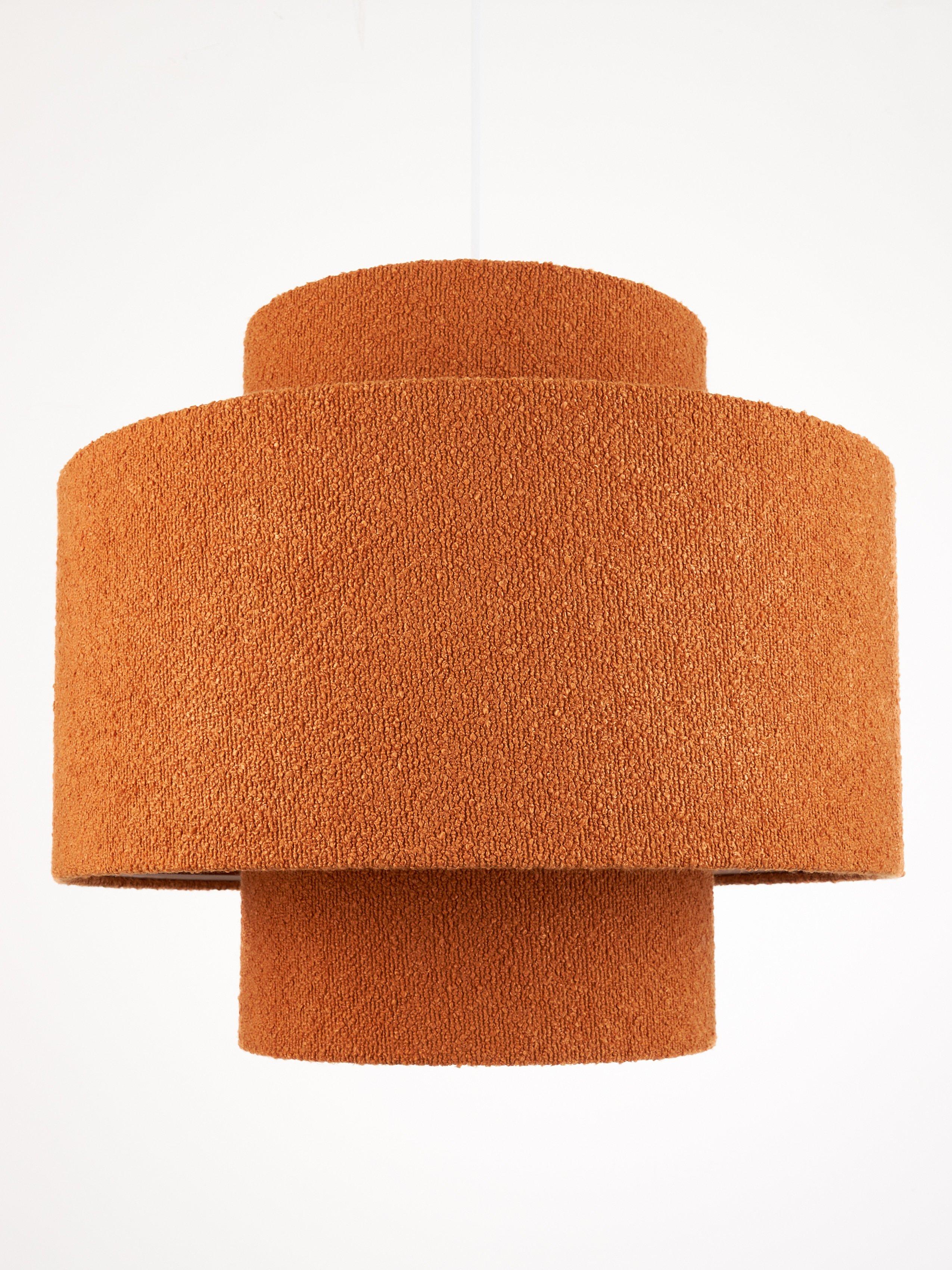 Layered lampshade, a contemporary look that suits most ceiling fittings in a living room and bedroom. The oversized profiles soften the glow of light and the on-trend boucle fabric adds texture to a room.