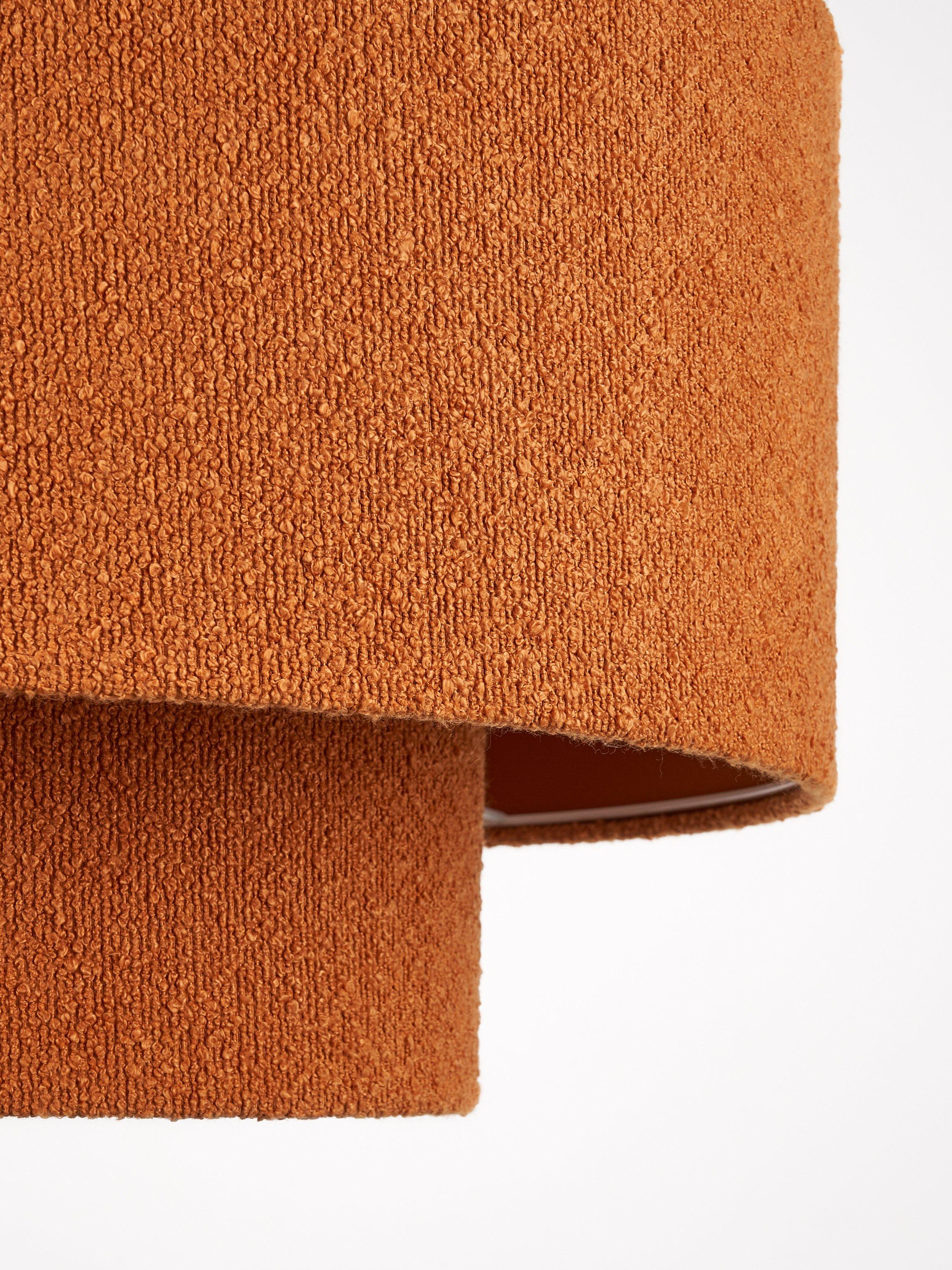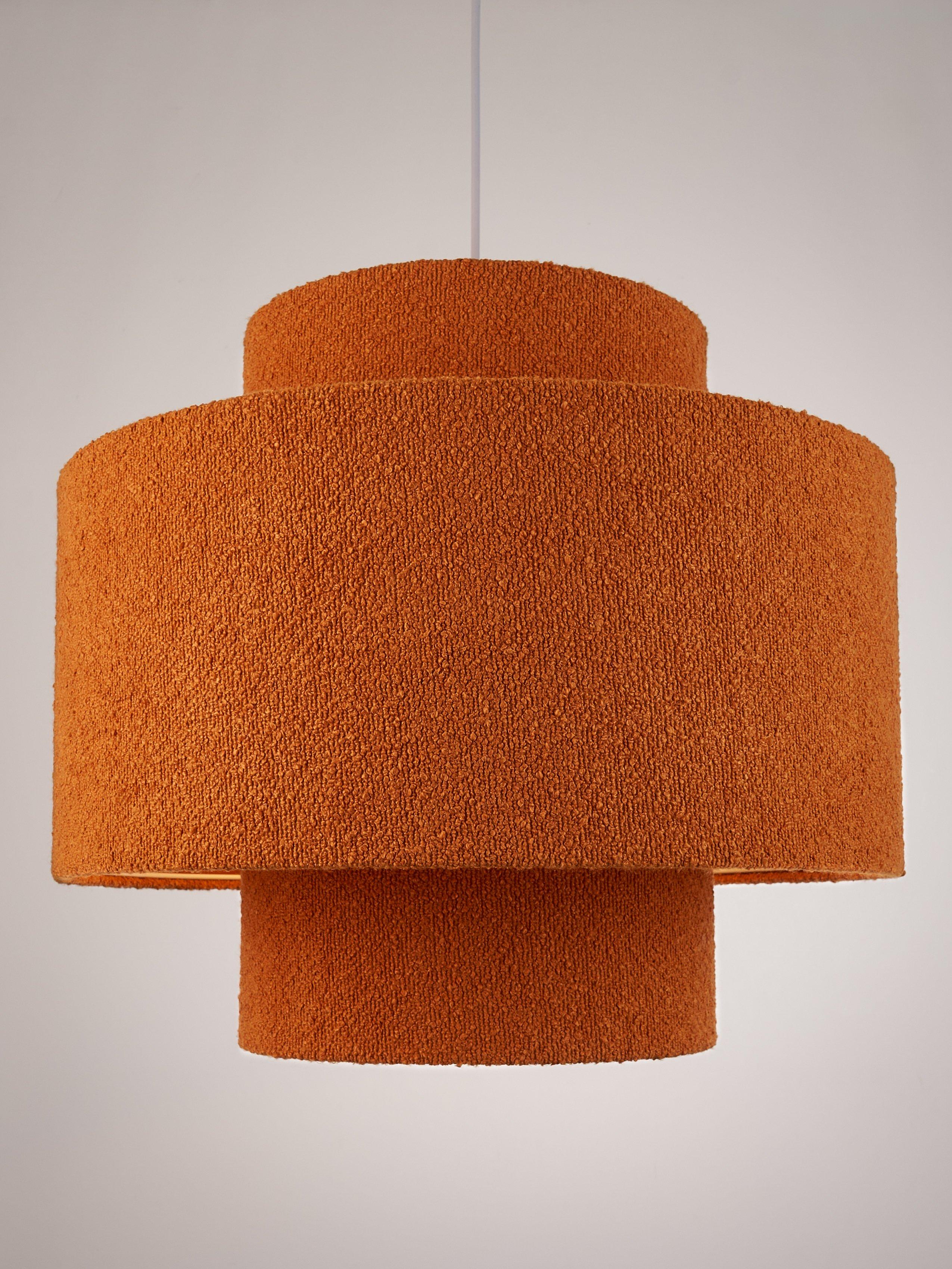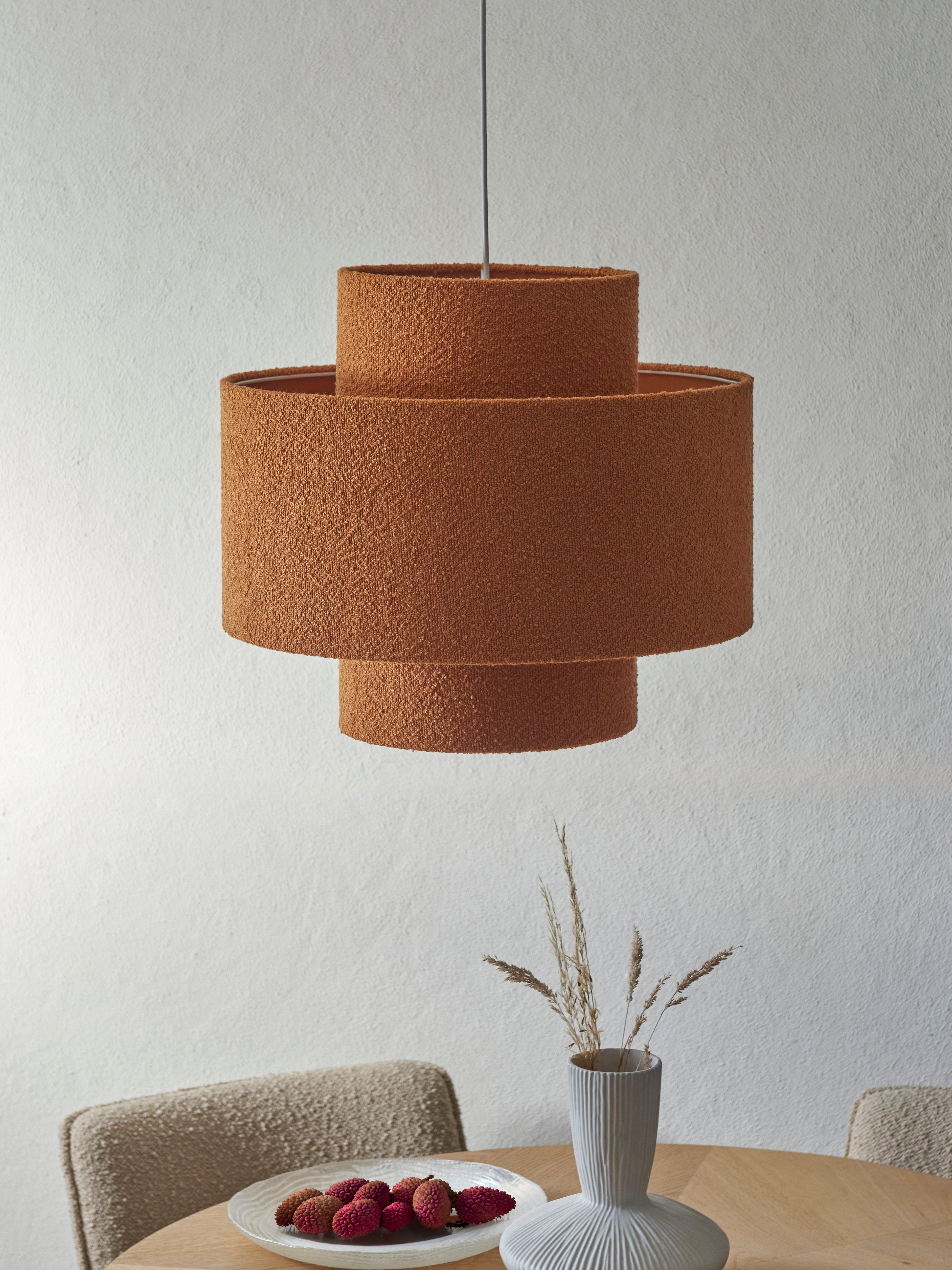 Layered lampshade, a contemporary look that suits most ceiling fittings in a living room and bedroom. The oversized profiles soften the glow of light and the on-trend boucle fabric adds texture to a room.
