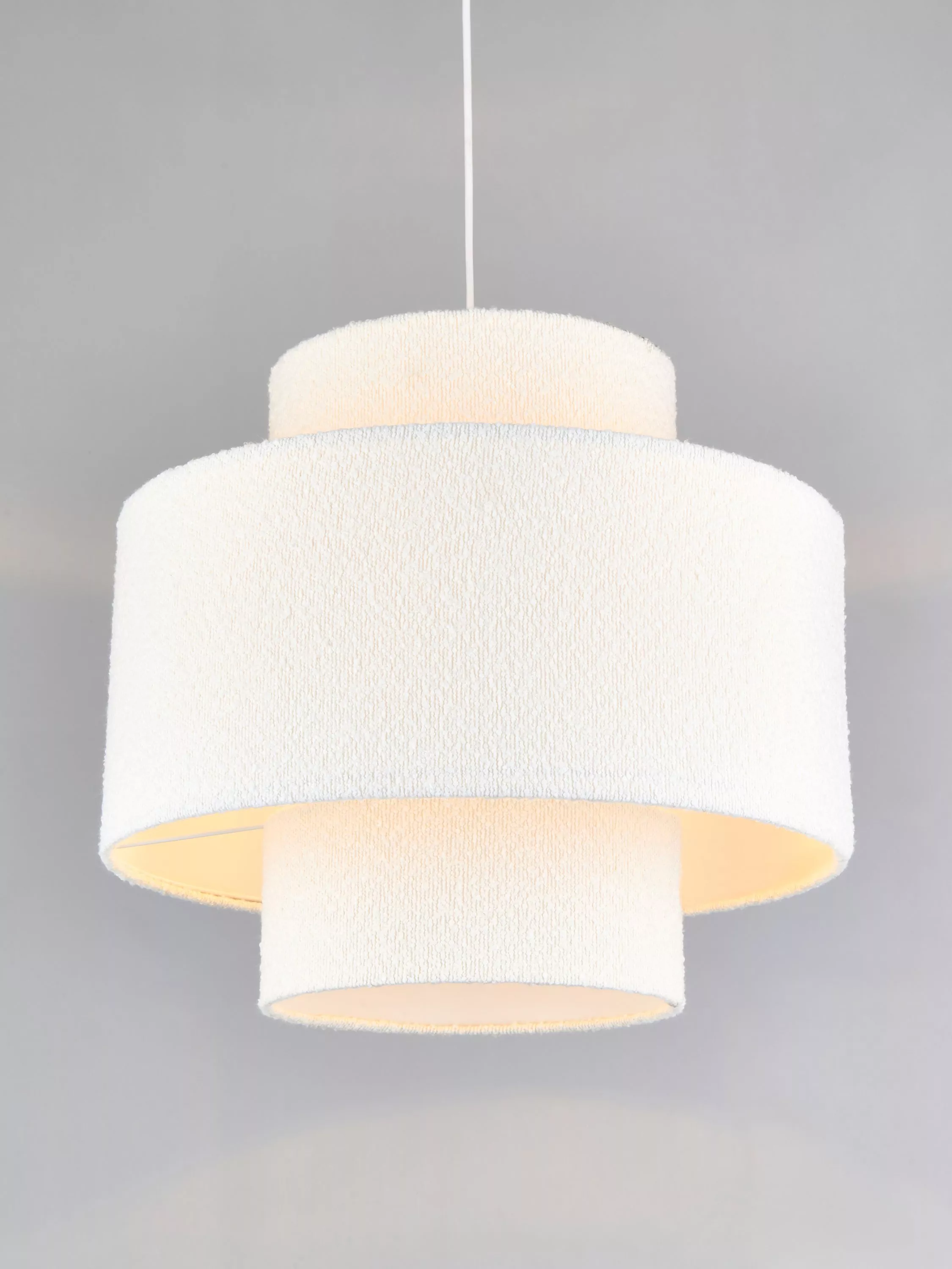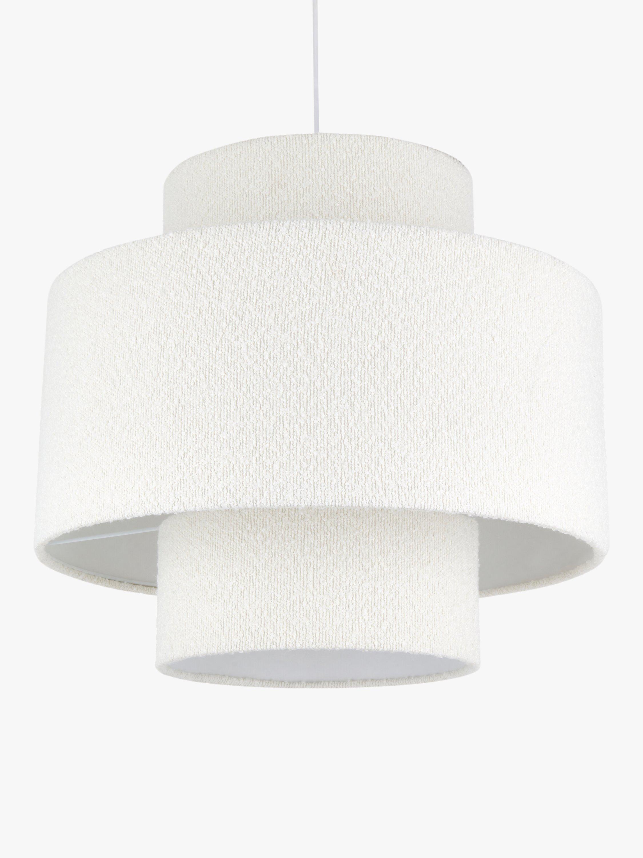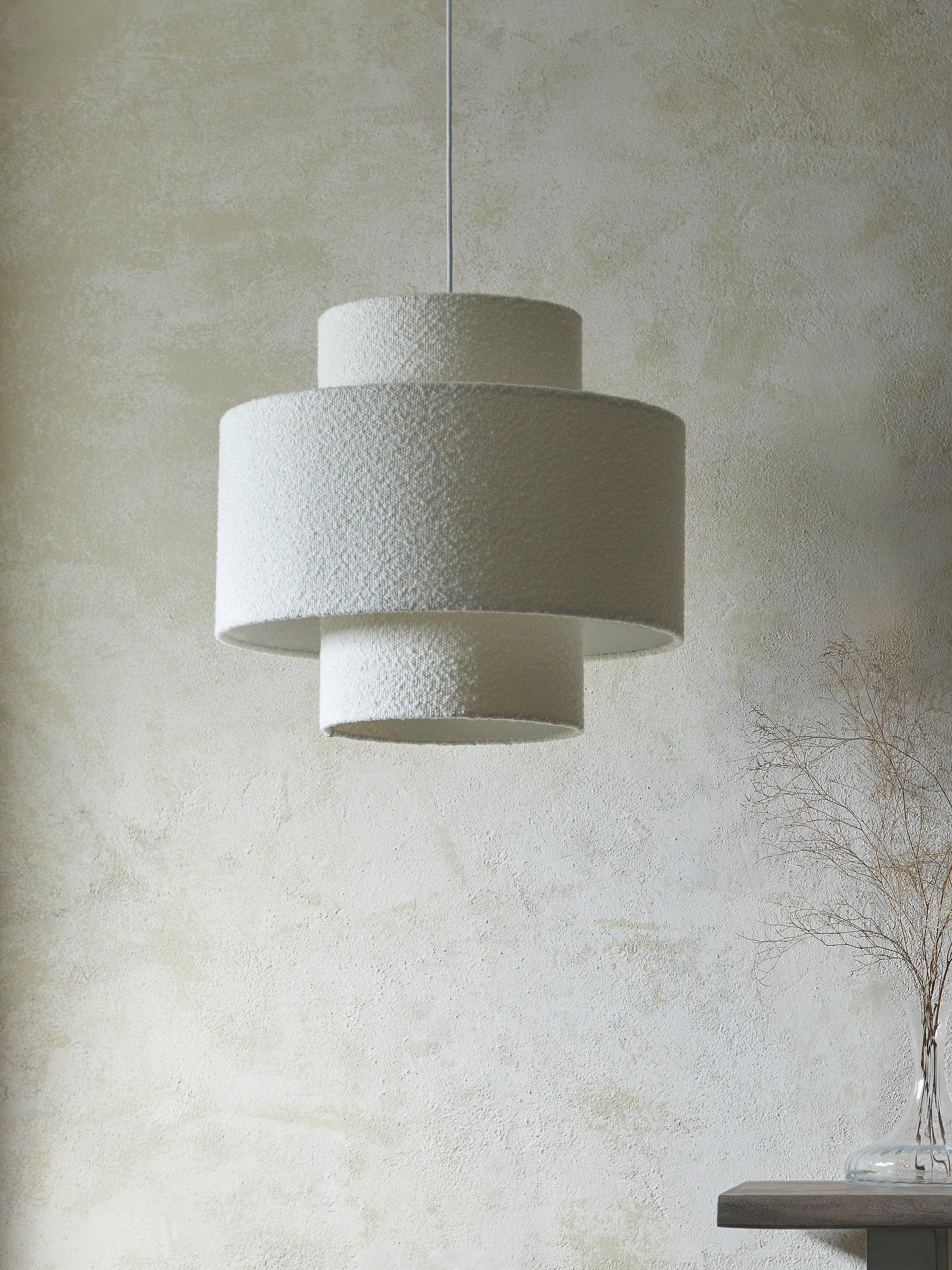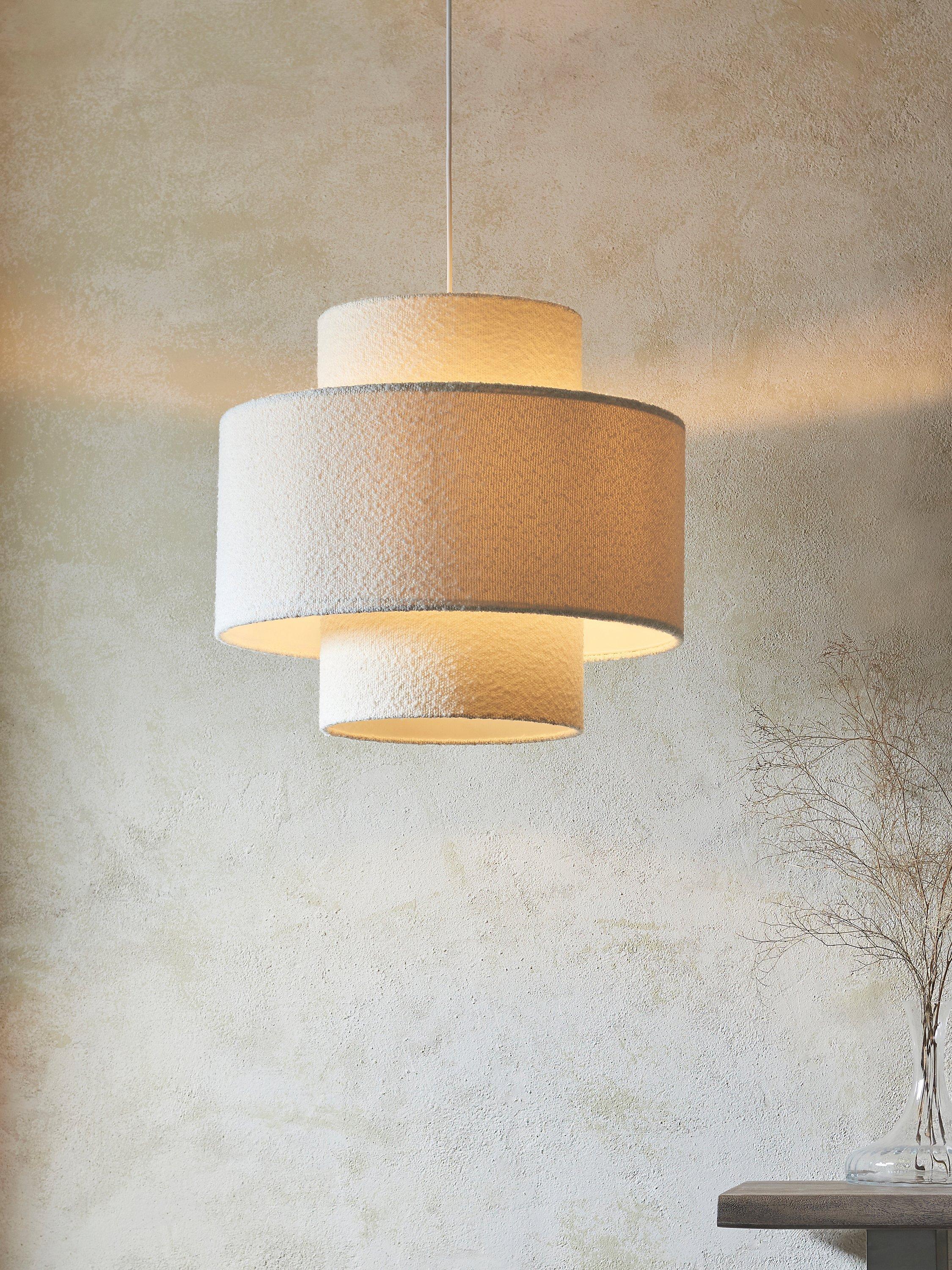 Layered lampshade, a contemporary look that suits most ceiling fittings in a living room and bedroom. The oversized profiles soften the glow of light and the on-trend boucle fabric adds texture to a room.