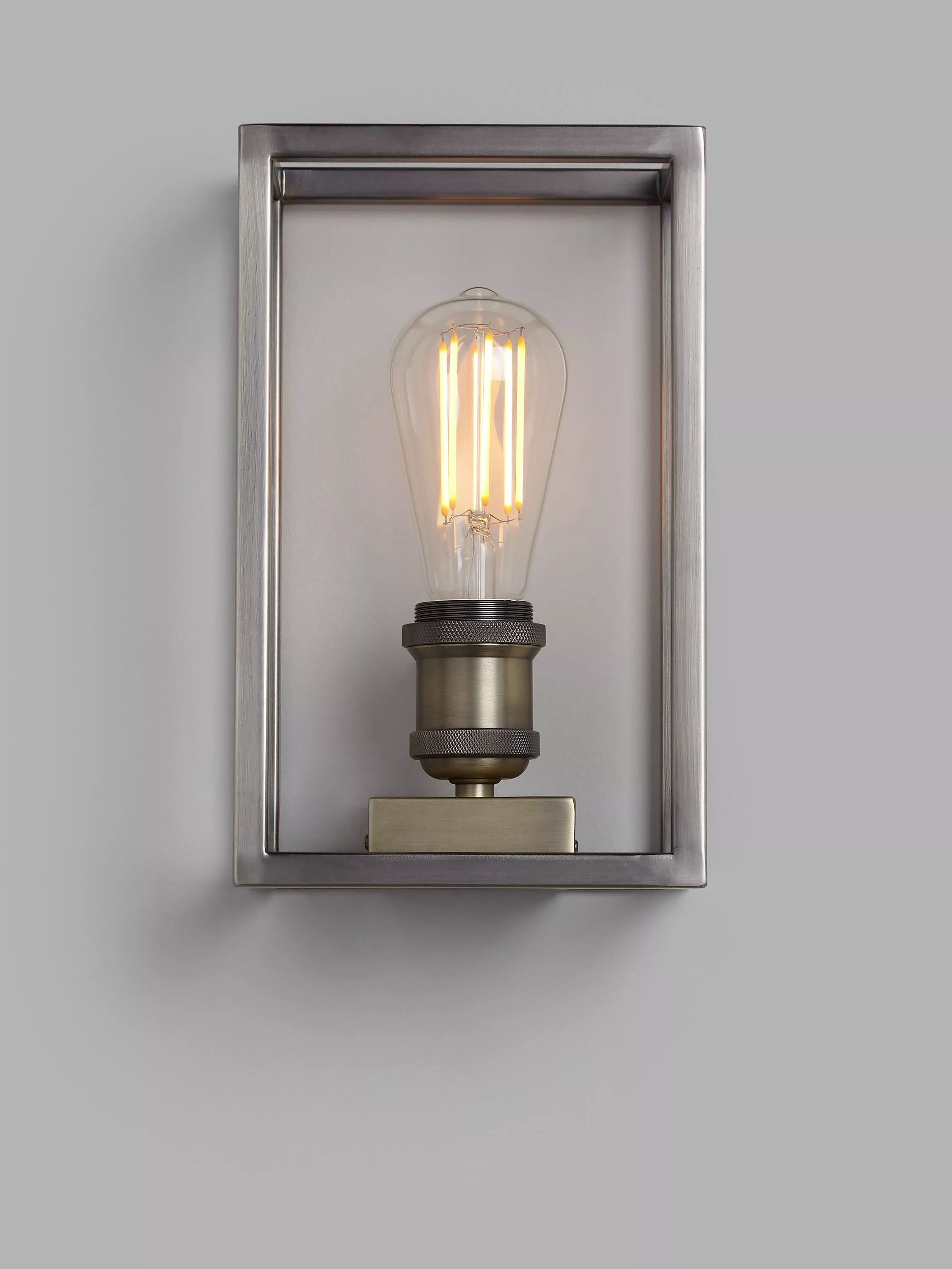 Our Boundary wall light offers a softer approach to industrial-style lighting, thanks to its two-toned finishes of antique brushed brass and pewter. The box lantern frame has a clean-lined, hollow structure and is well-paired with a vintage style bulb to enhance a restorative aesthetic and ambient wash of light.