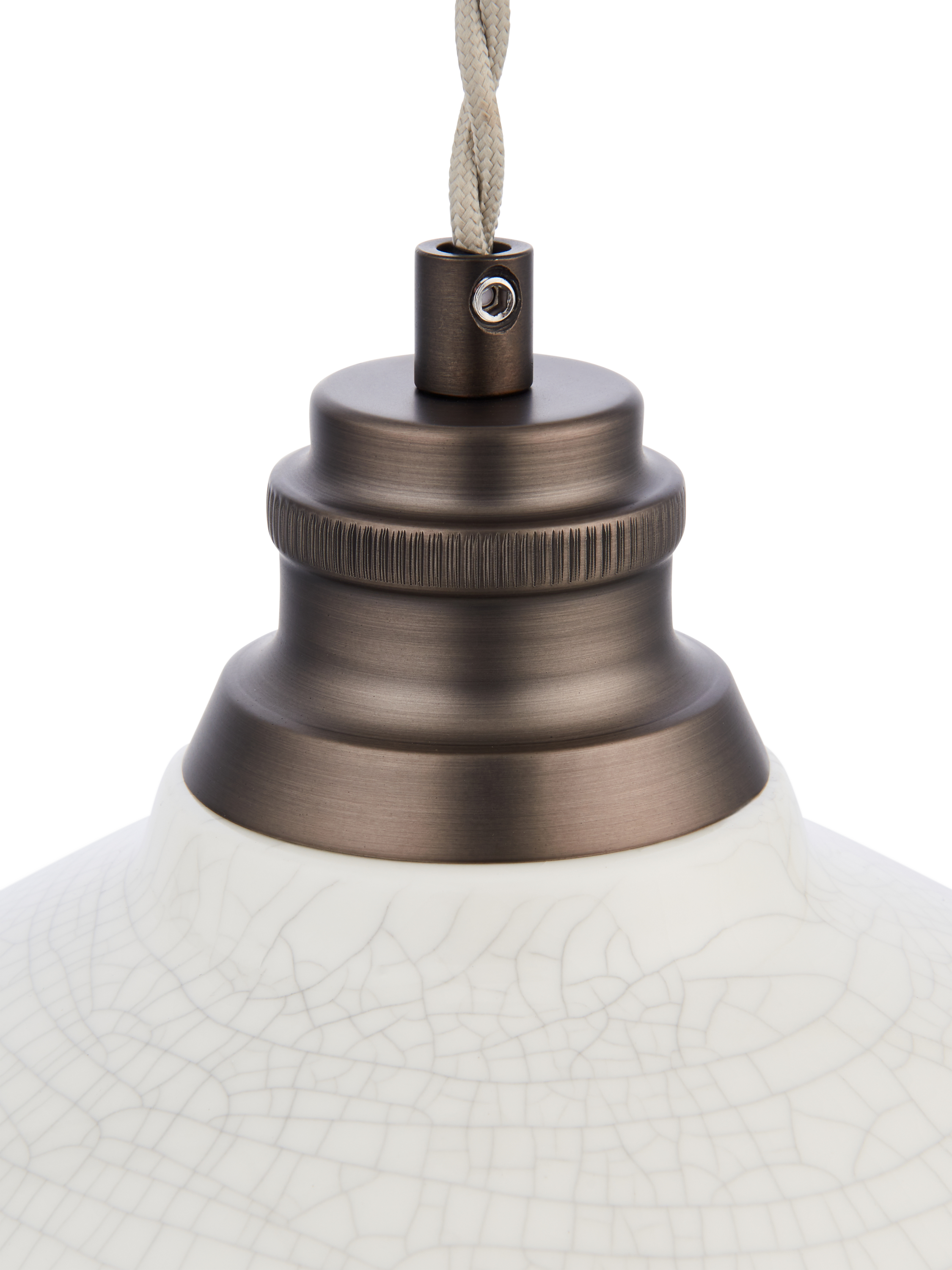 The Bourton pendant is crafted from earthenware and features a gloss crackle glaze, giving it a timeless, aged appearance. Its dark antique bronze-effect plate beautifully complements the putty crackle finish, creating an elegant rustic aesthetic.