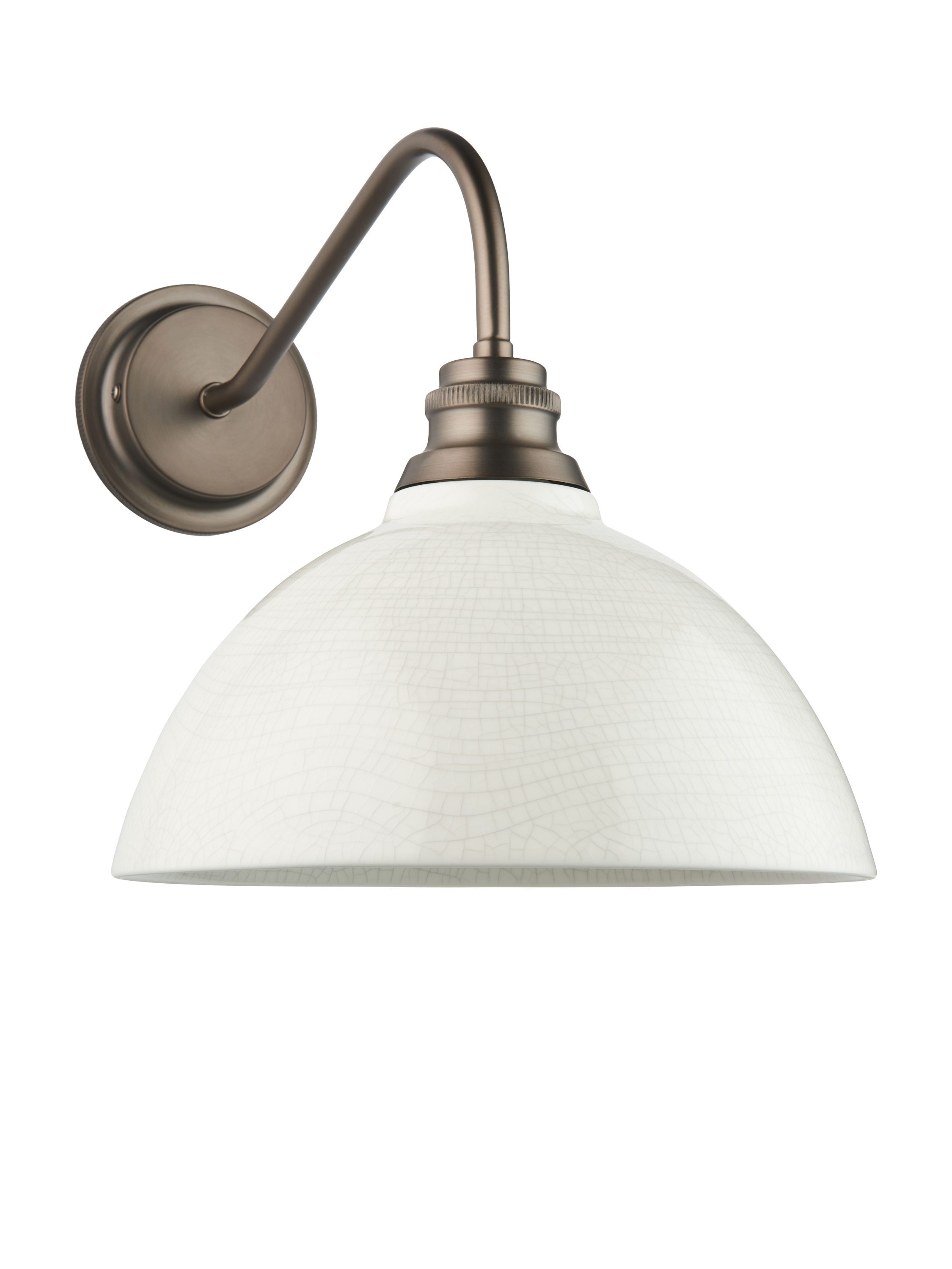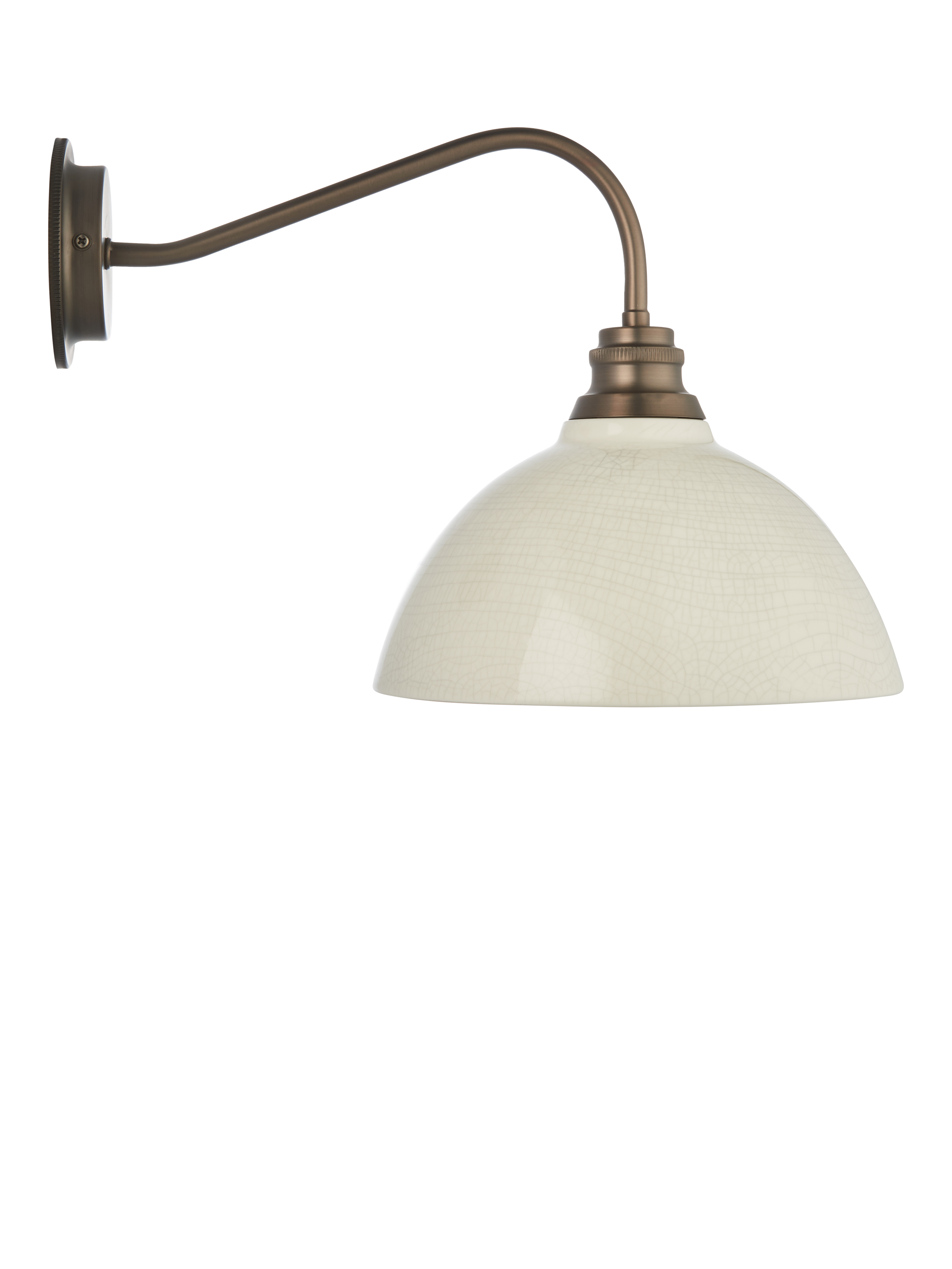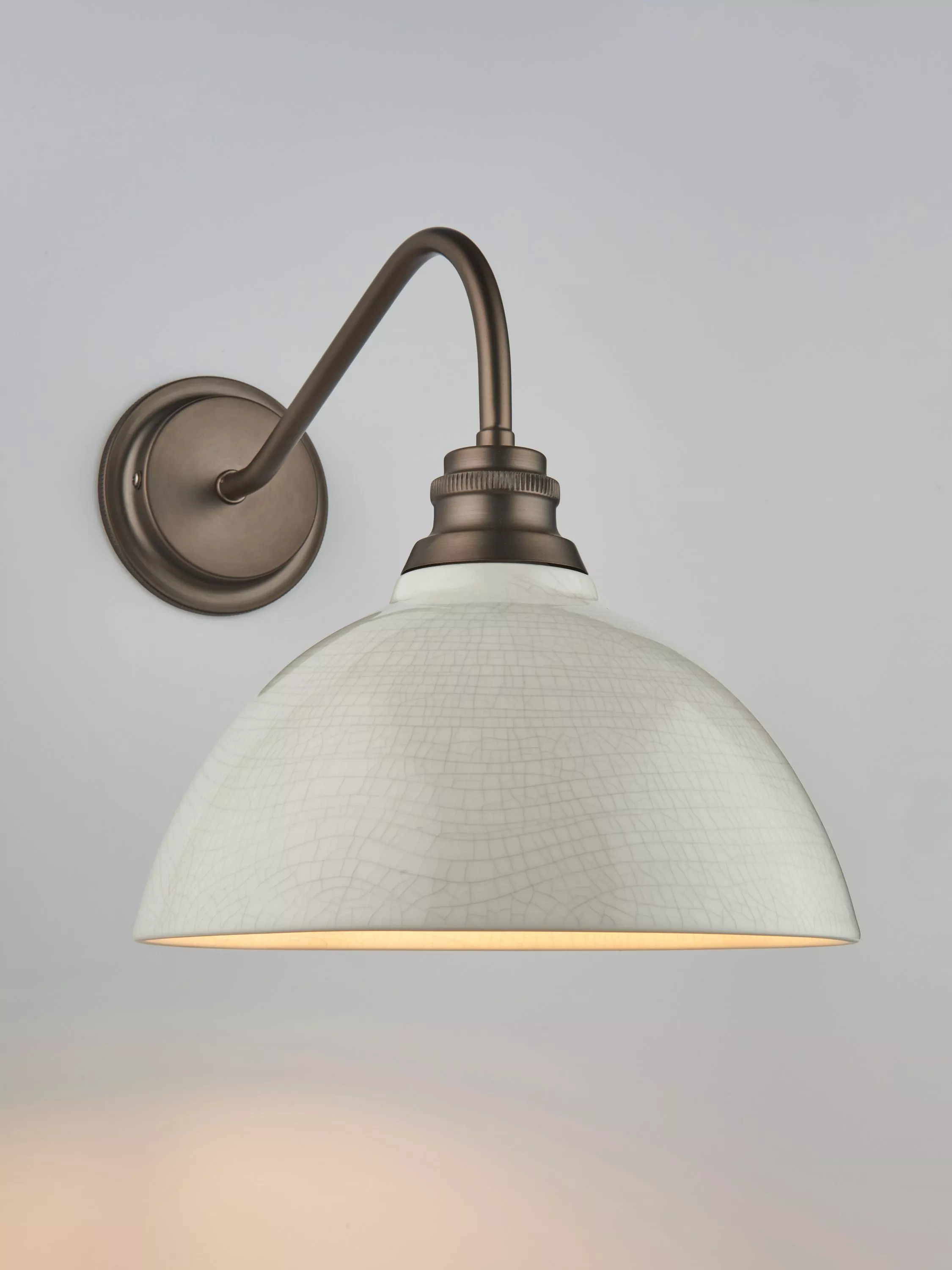 The Bourton wall light is crafted from earthenware and features a gloss crackle glaze, giving it a timeless, aged appearance. Its dark antique bronze-effect plate beautifully complements the putty crackle finish, creating an elegant rustic look.