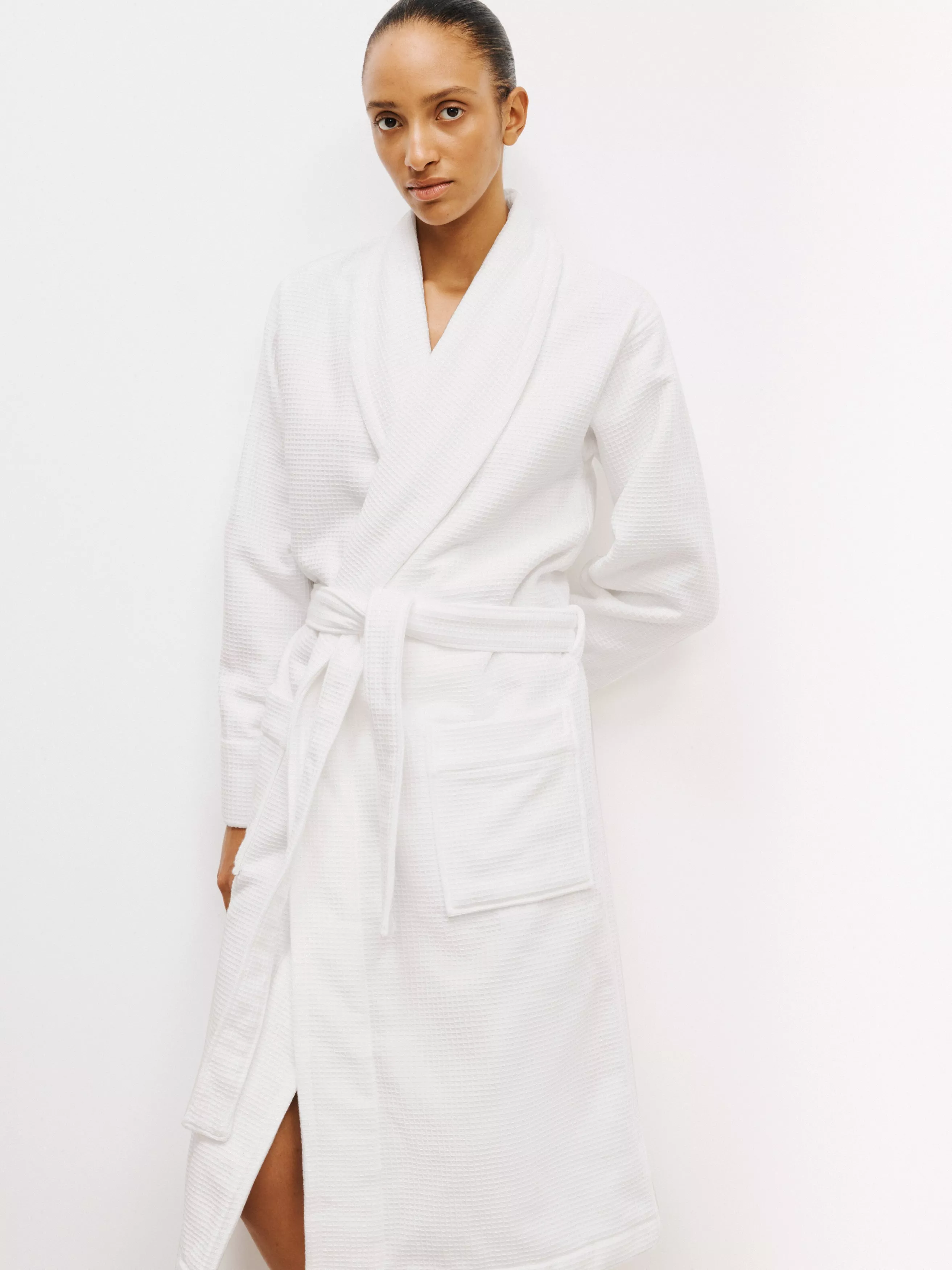 Get that boutique hotel feeling at home with our Waffle robe. Made from pure cotton in a waffle weave it has a premium feel, but lightweight and quick-drying qualities. Designed in a classic shape it features a shawl collar, two oversized patch pockets and a tie belt.