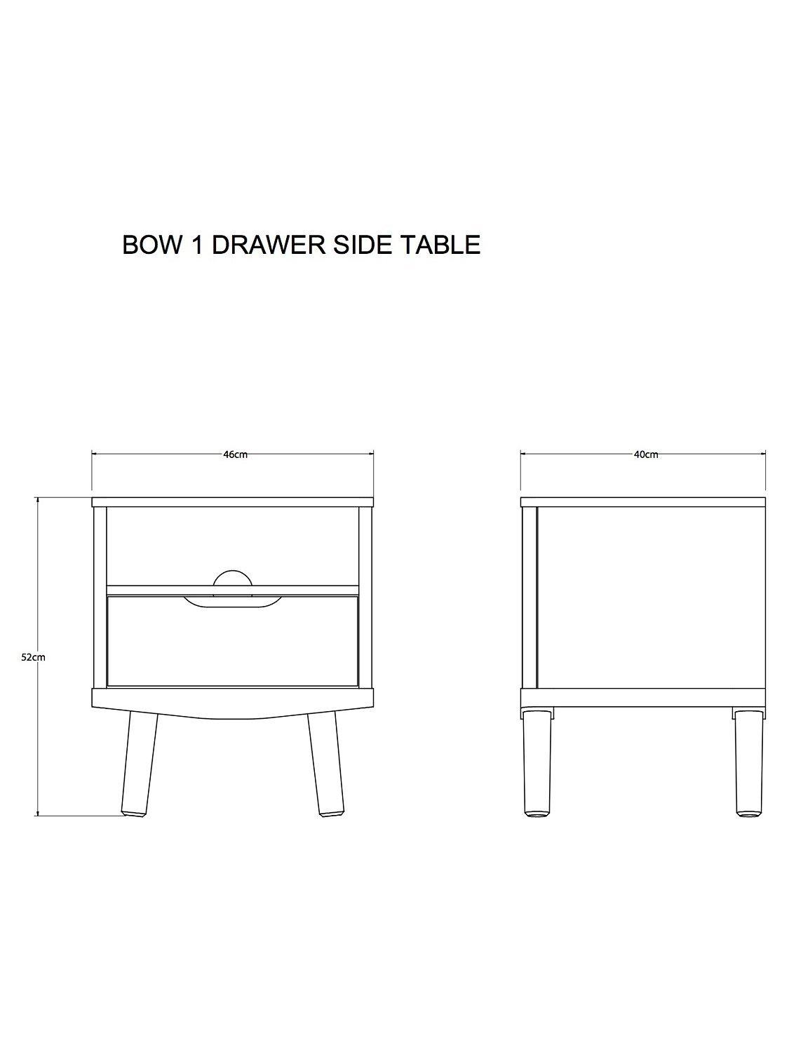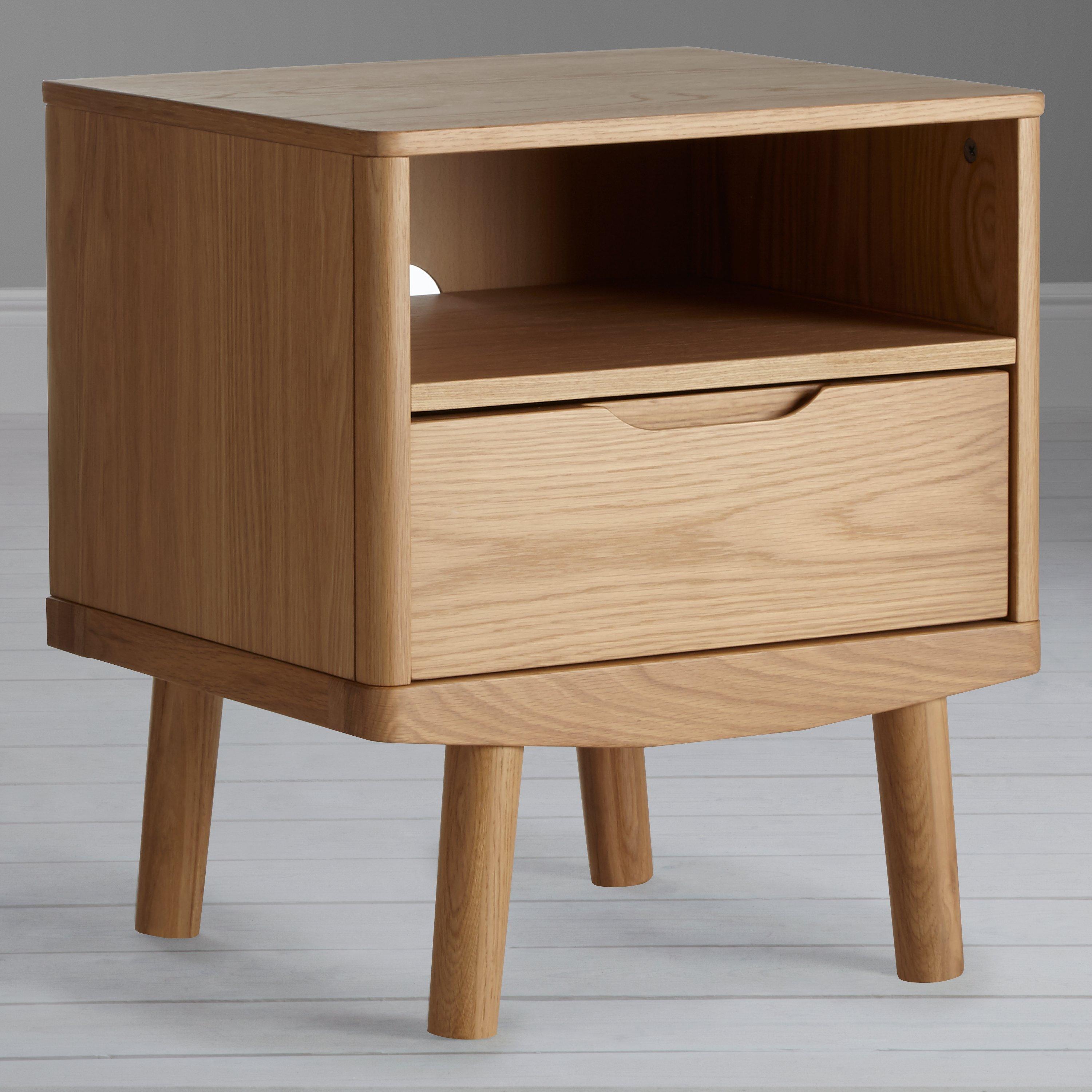 Our Bow range of bedroom furniture is modern, durable and made predominantly from solid oak and veneers. Showcasing the natural warmth and pattern of the wood grain, this compact bedside table is designed with an open shelf section and handy drawer, with soft rounded edges and splayed legs. We've also added a cable hole at the back, so you can neatly feed through cables from bedside lamps and tech gadgets.