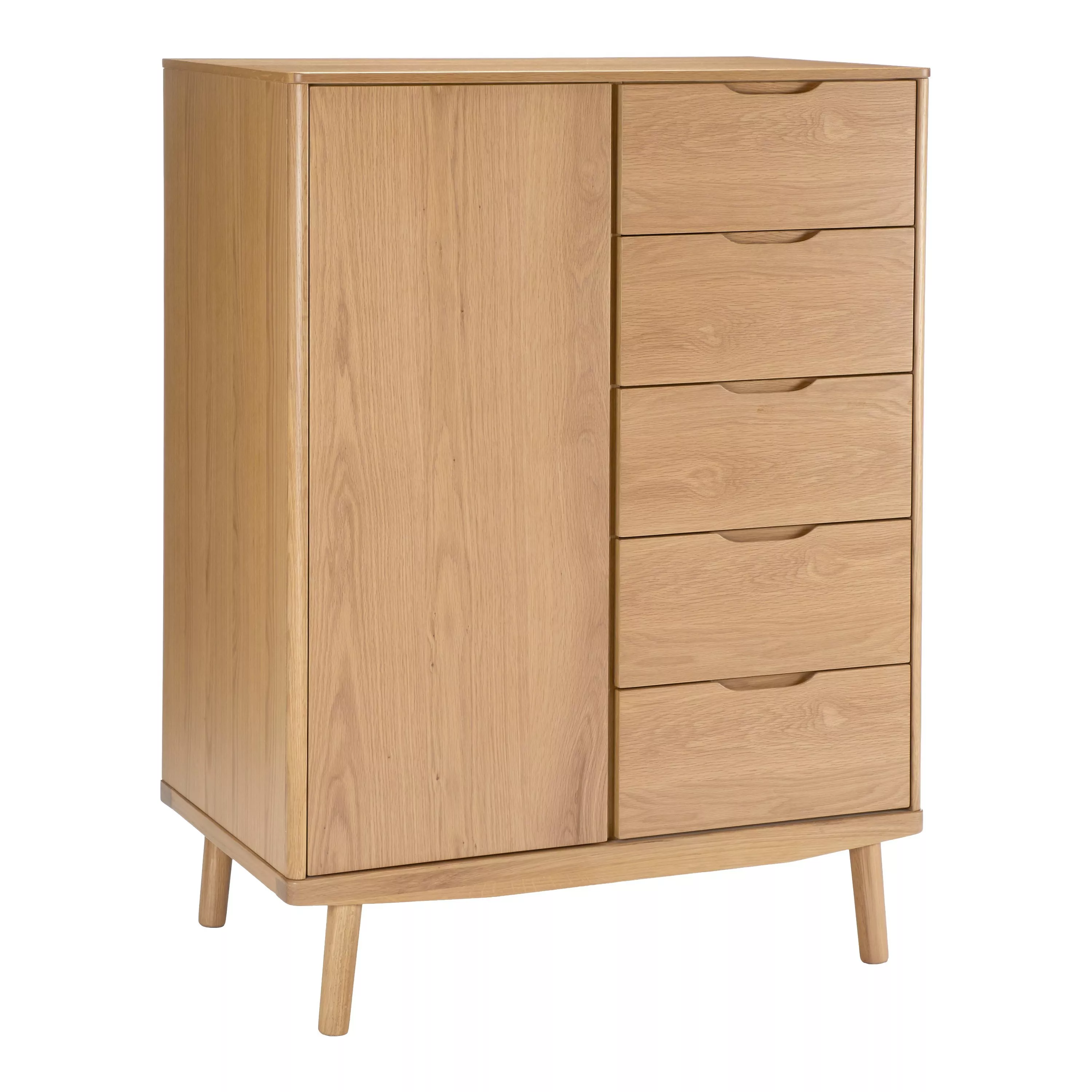 Our Bow range of bedroom furniture is modern, durable and made predominantly from solid oak and veneers. Showcasing the natural warmth and pattern of the wood grain, this low wardrobe is compact, but offers plenty of storage space thanks to five drawers and a metal hanging rail.