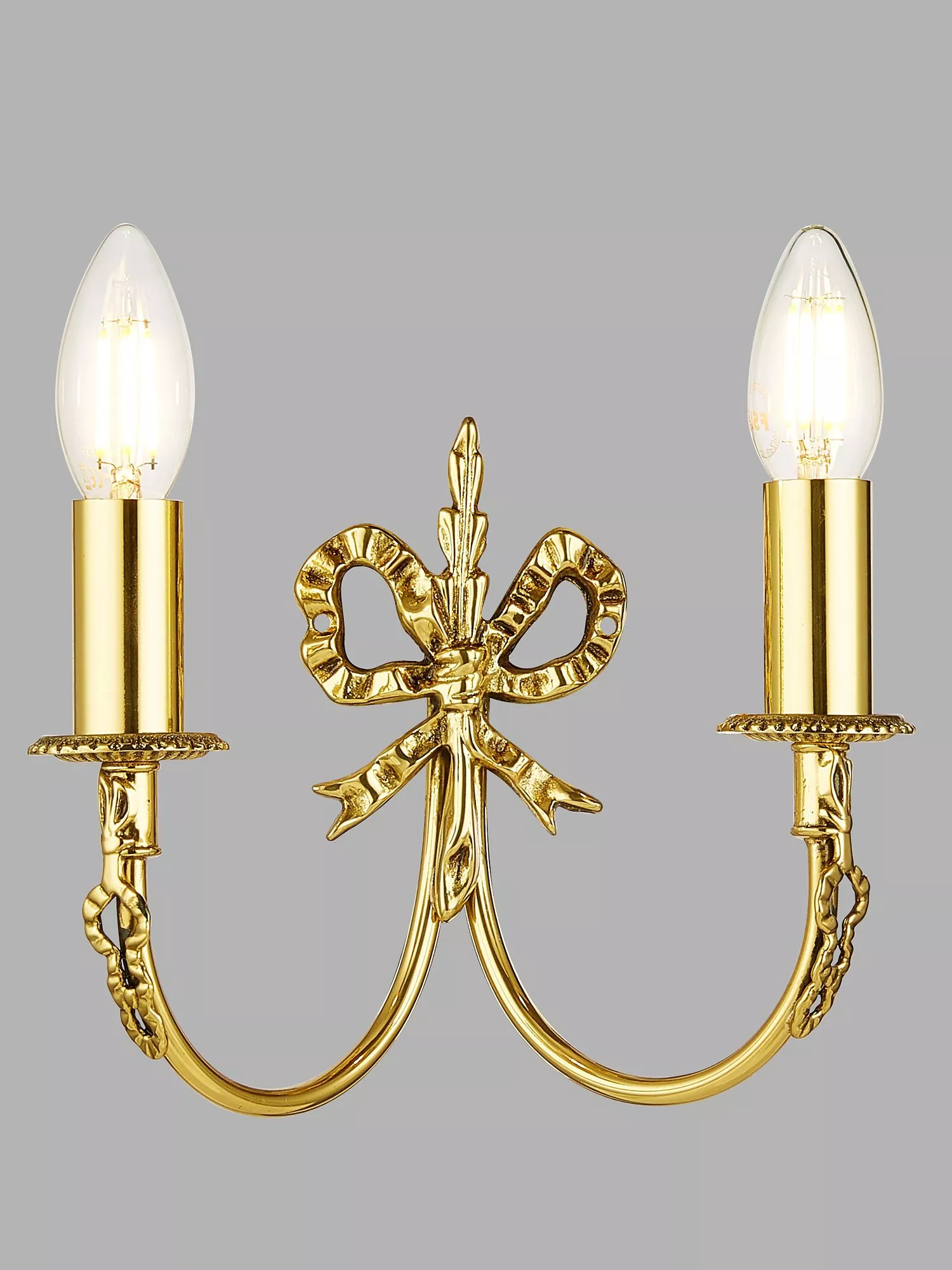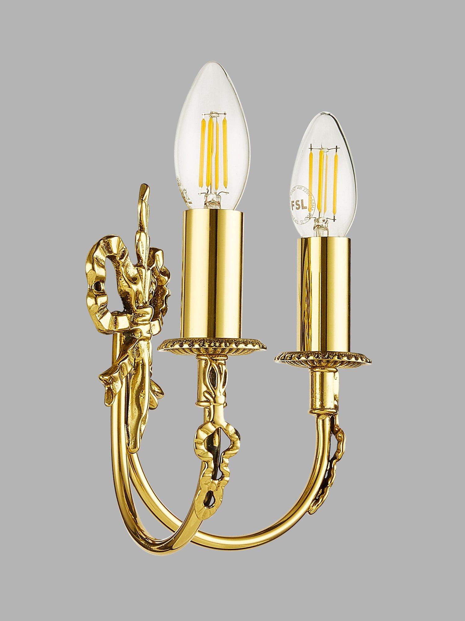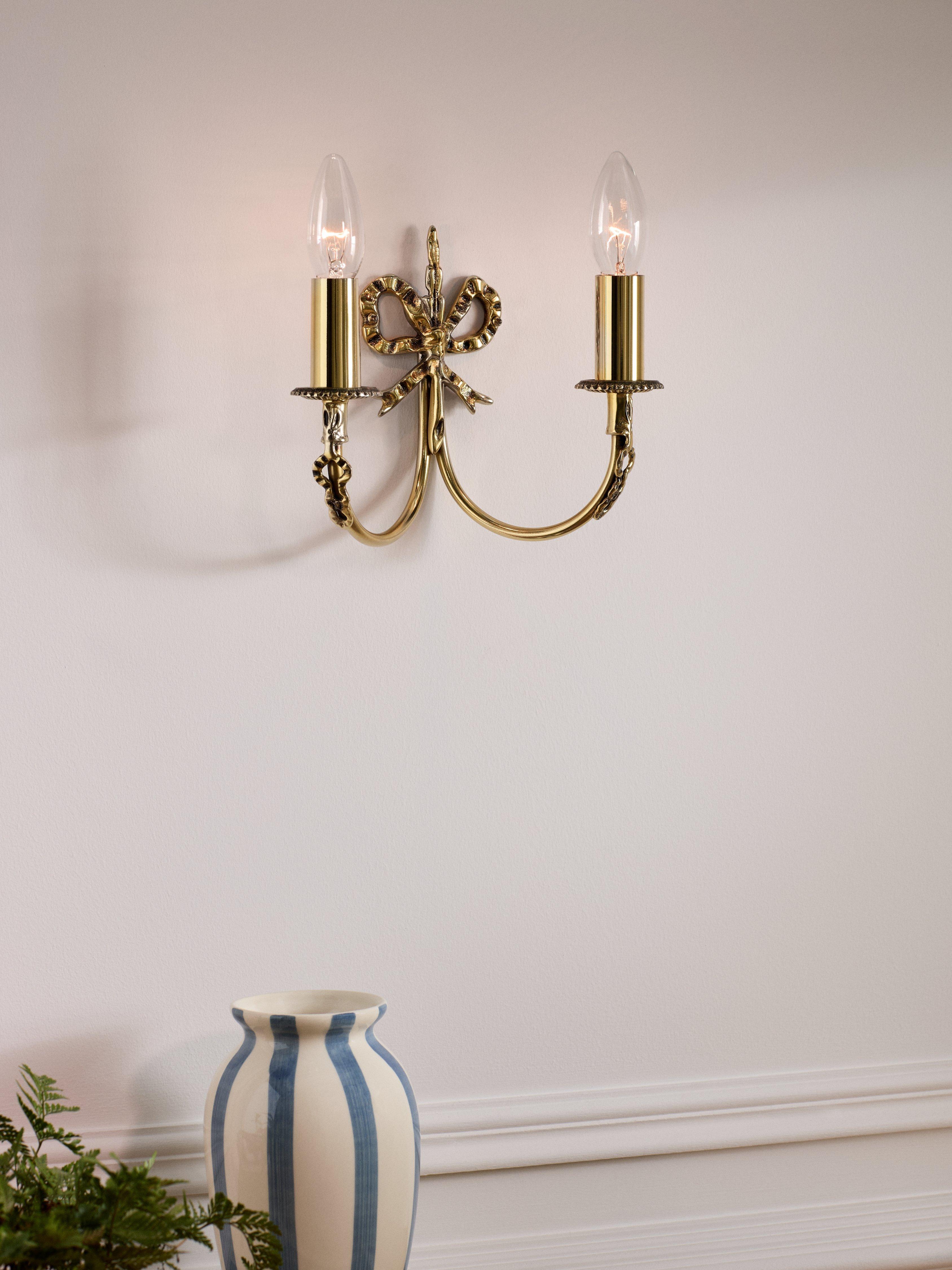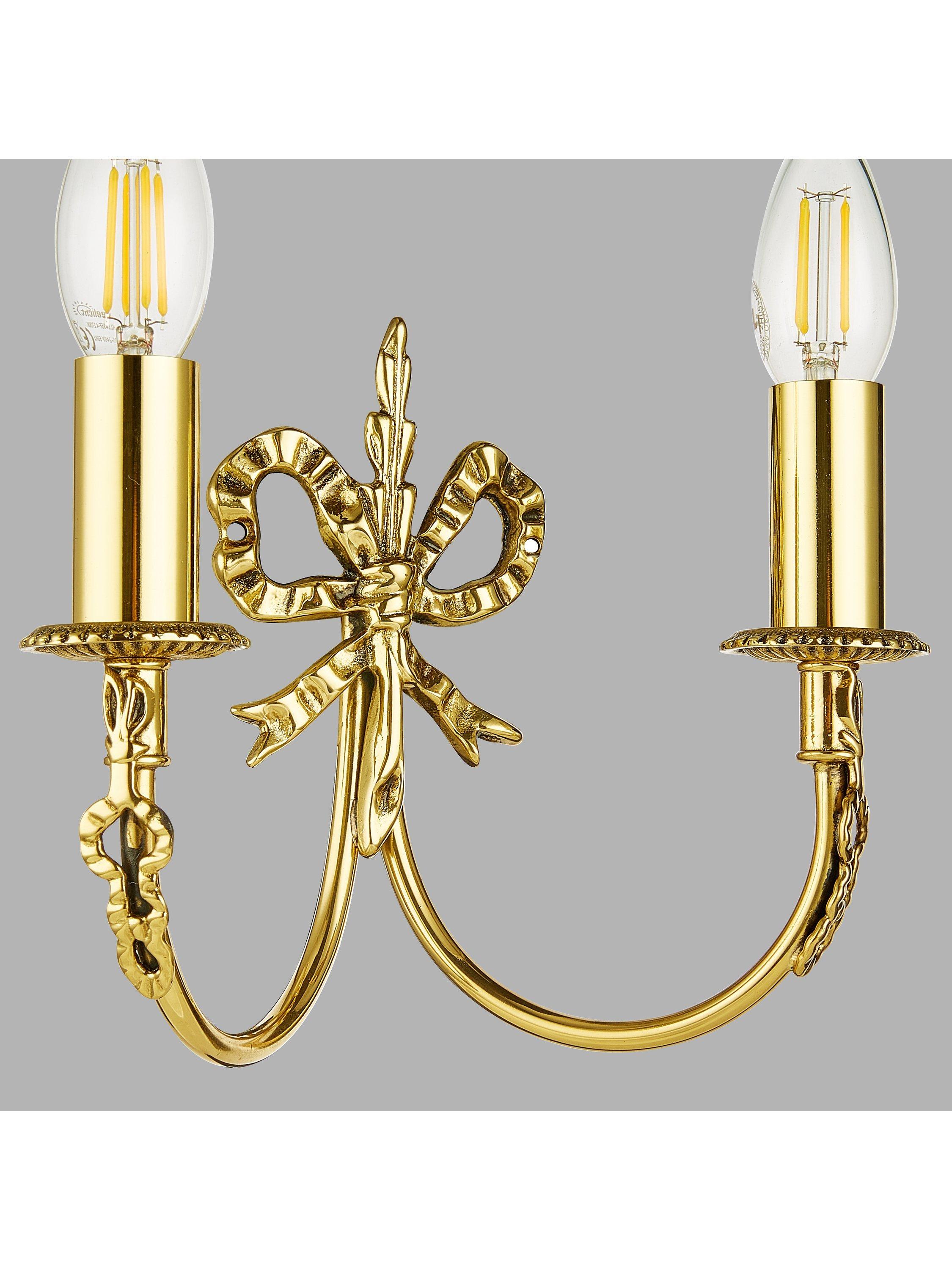 Crafted from solid brass with an exquisite antique brass finish, this double wall light features a distinctive bow design. A traditional, decorative look for your room.