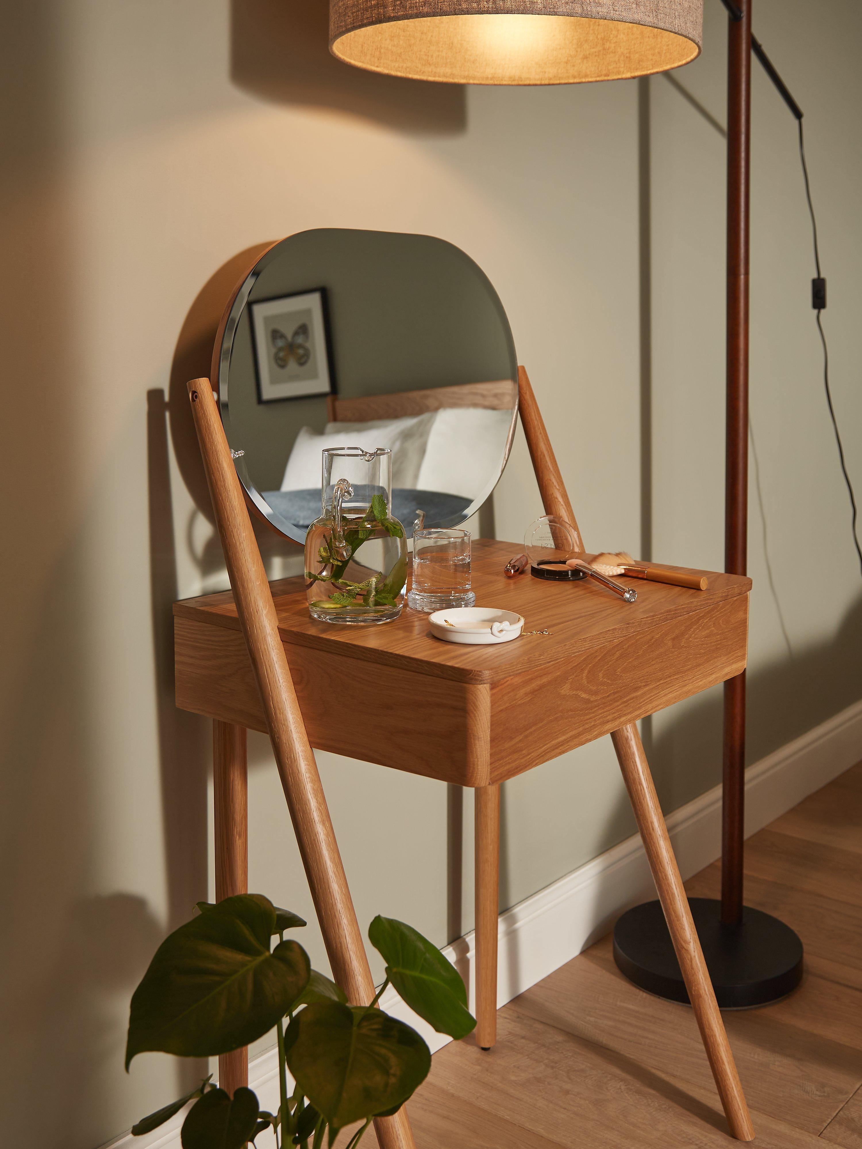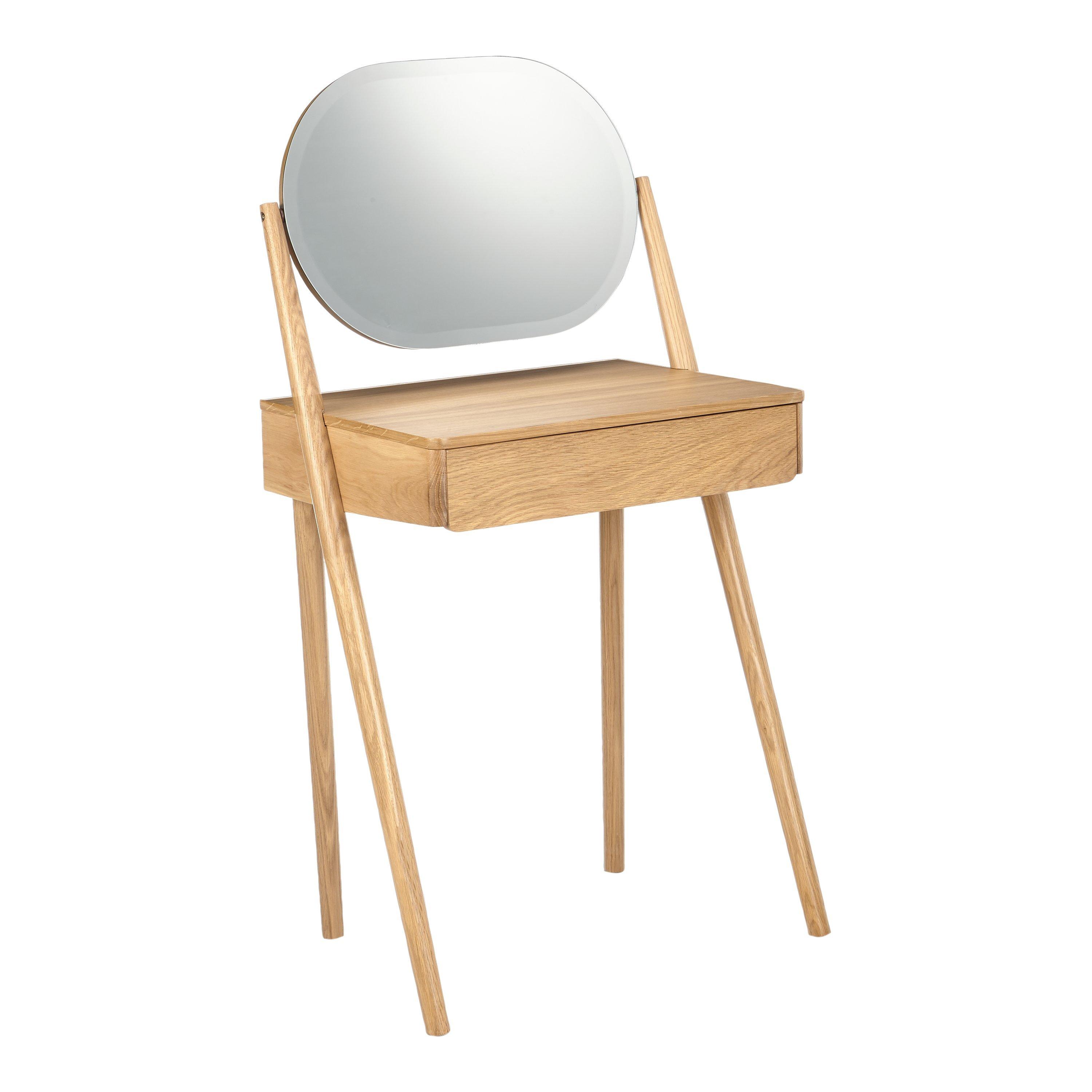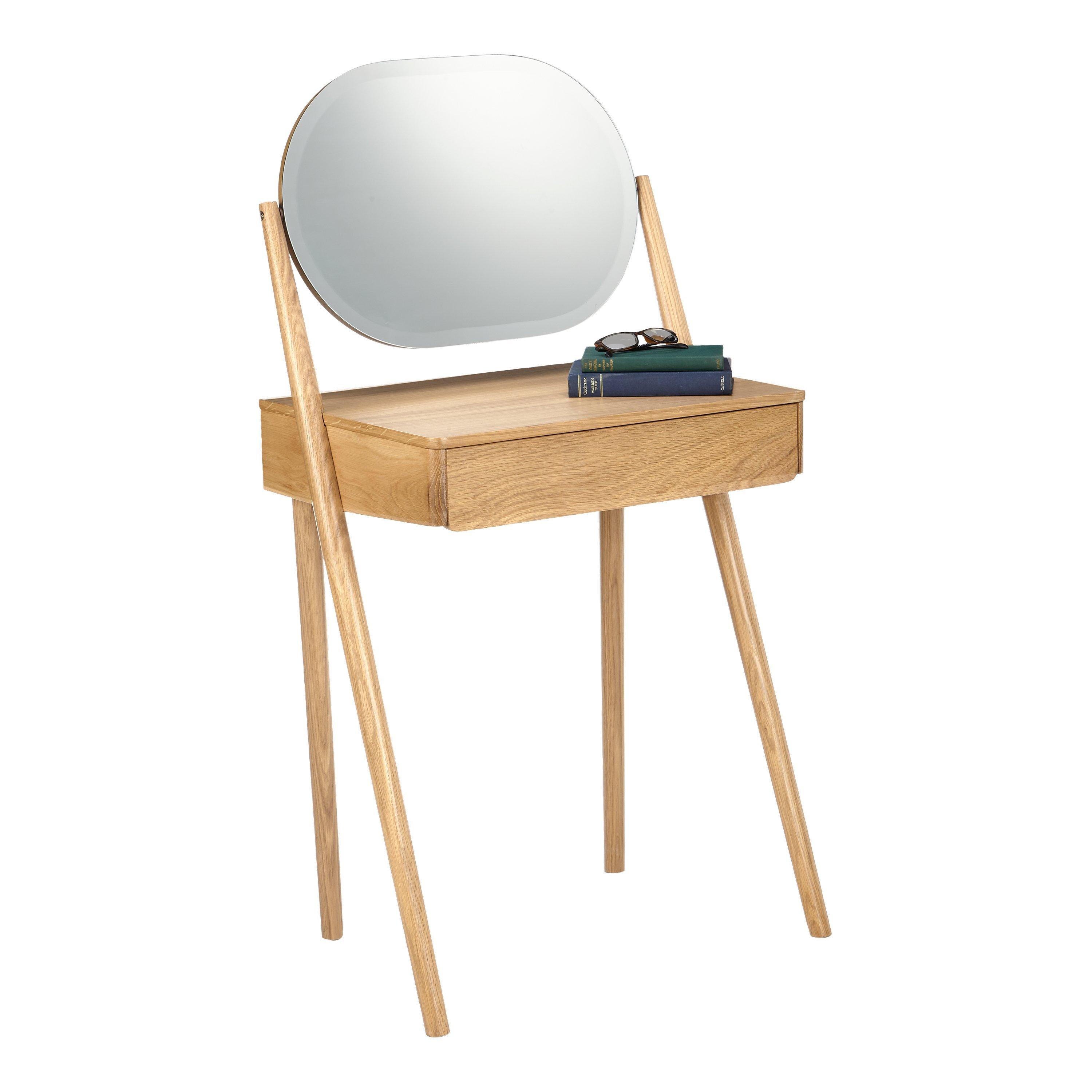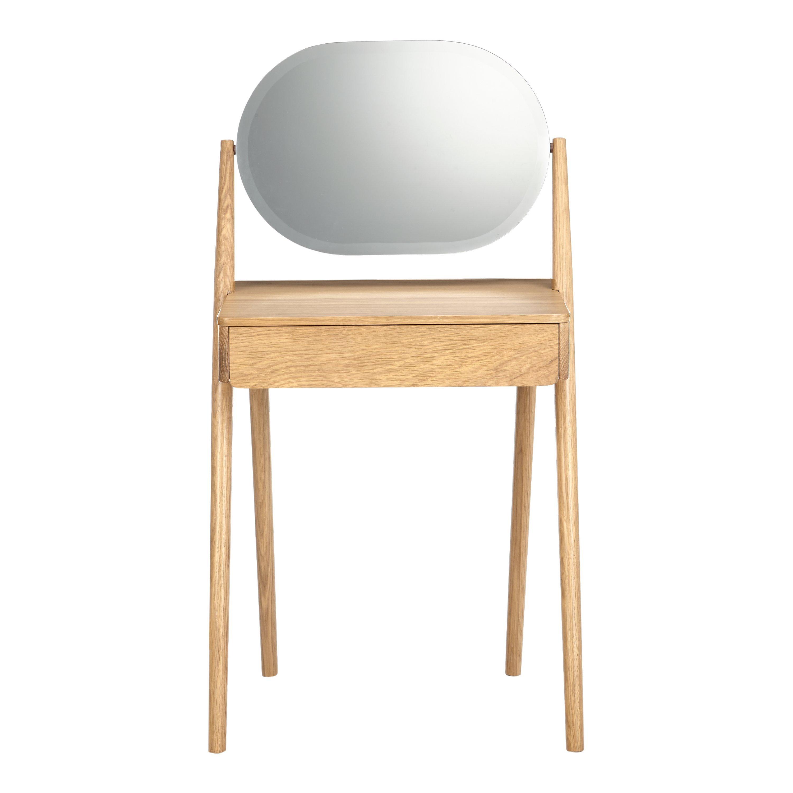 Our Bow range of bedroom furniture is modern, durable and made predominantly from solid oak and veneers. Showcasing the natural warmth and pattern of the wood grain, this practical dressing table carves out a place for you to get ready each day, even if bedroom space is limited. It features a discreet storage drawer and oval-shaped mirror, and rests on sleek, rounded legs.