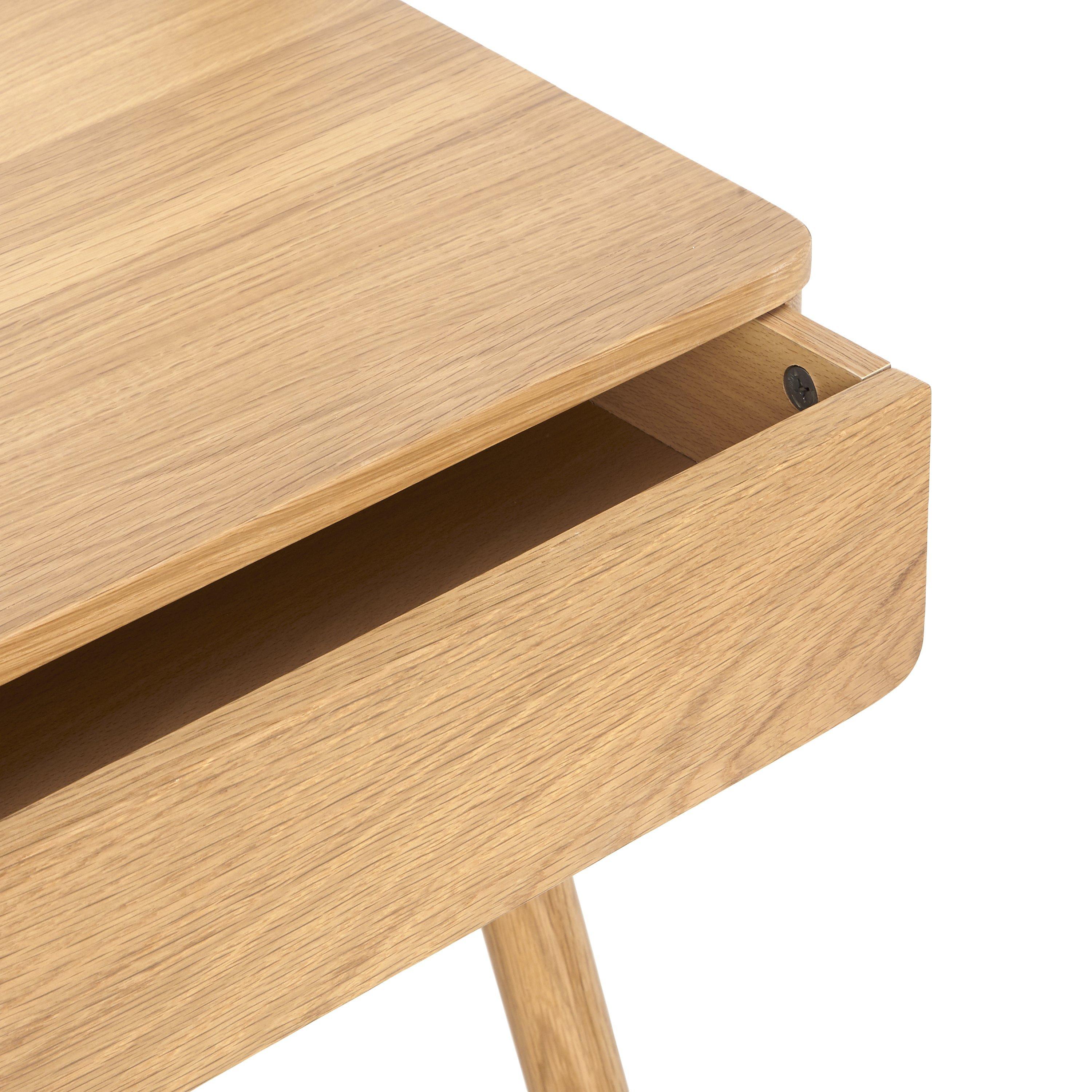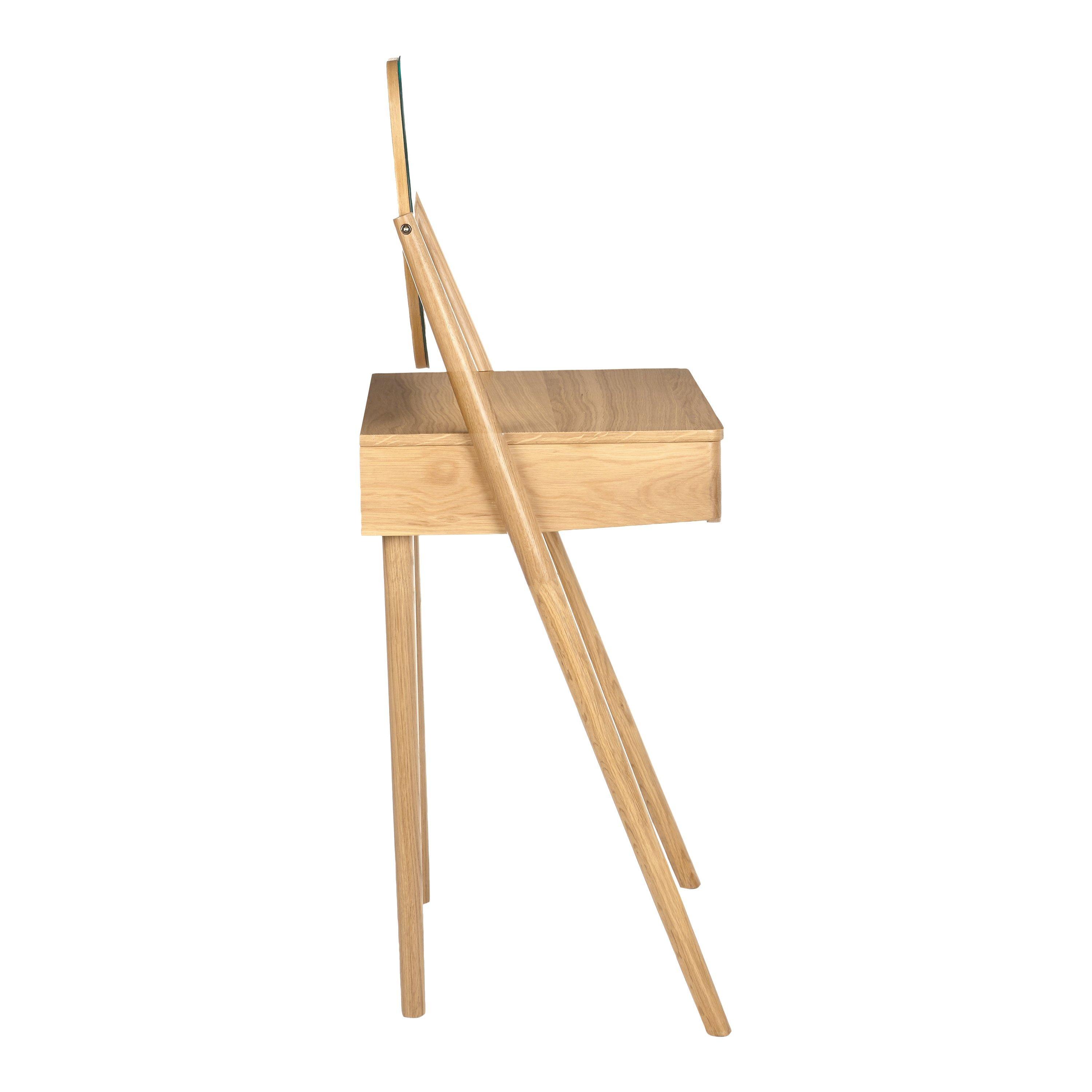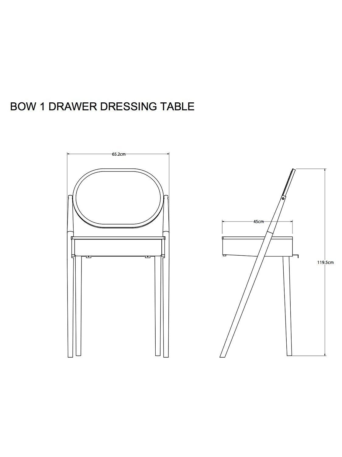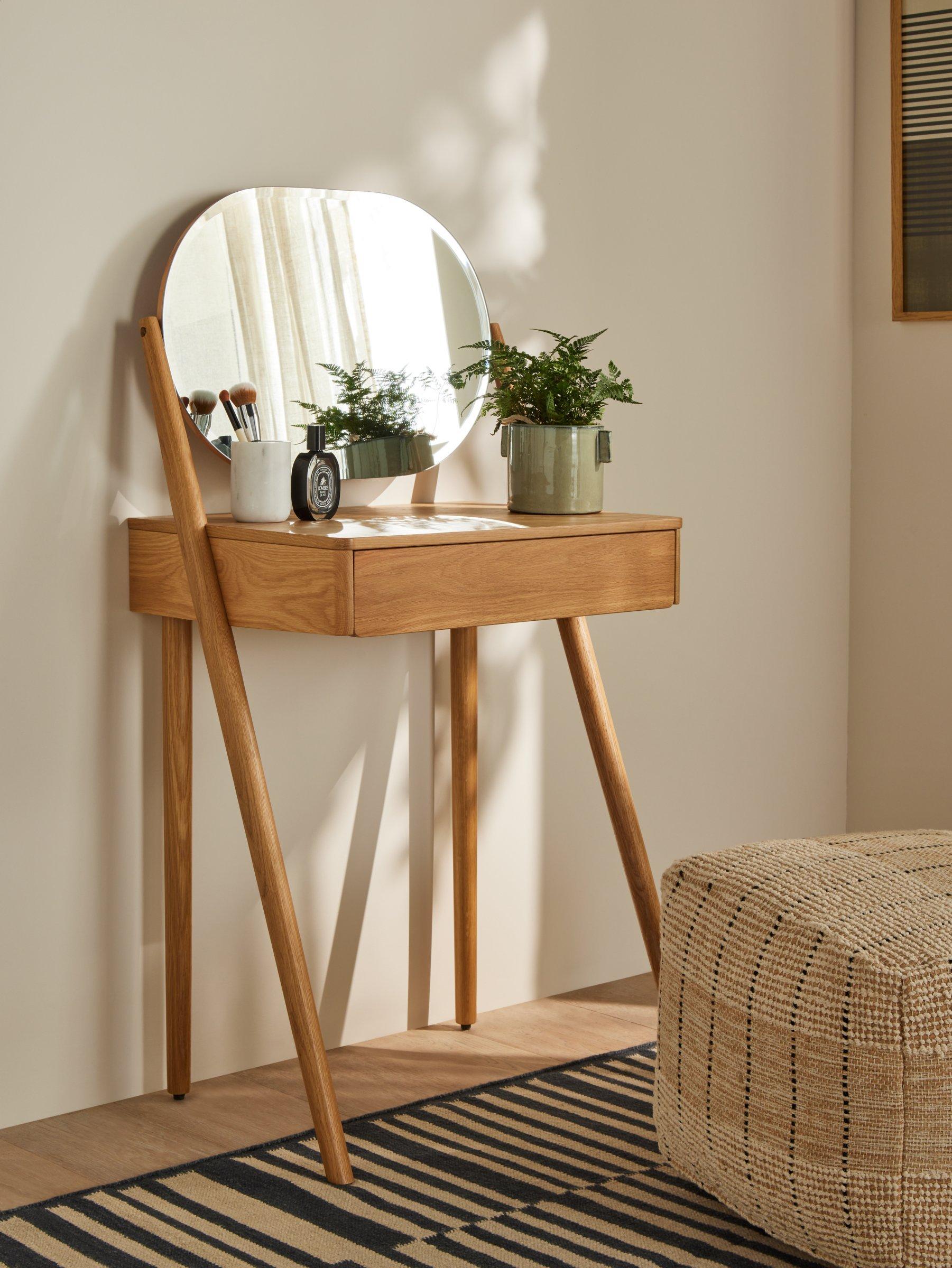Our Bow range of bedroom furniture is modern, durable and made predominantly from solid oak and veneers. Showcasing the natural warmth and pattern of the wood grain, this practical dressing table carves out a place for you to get ready each day, even if bedroom space is limited. It features a discreet storage drawer and oval-shaped mirror, and rests on sleek, rounded legs.