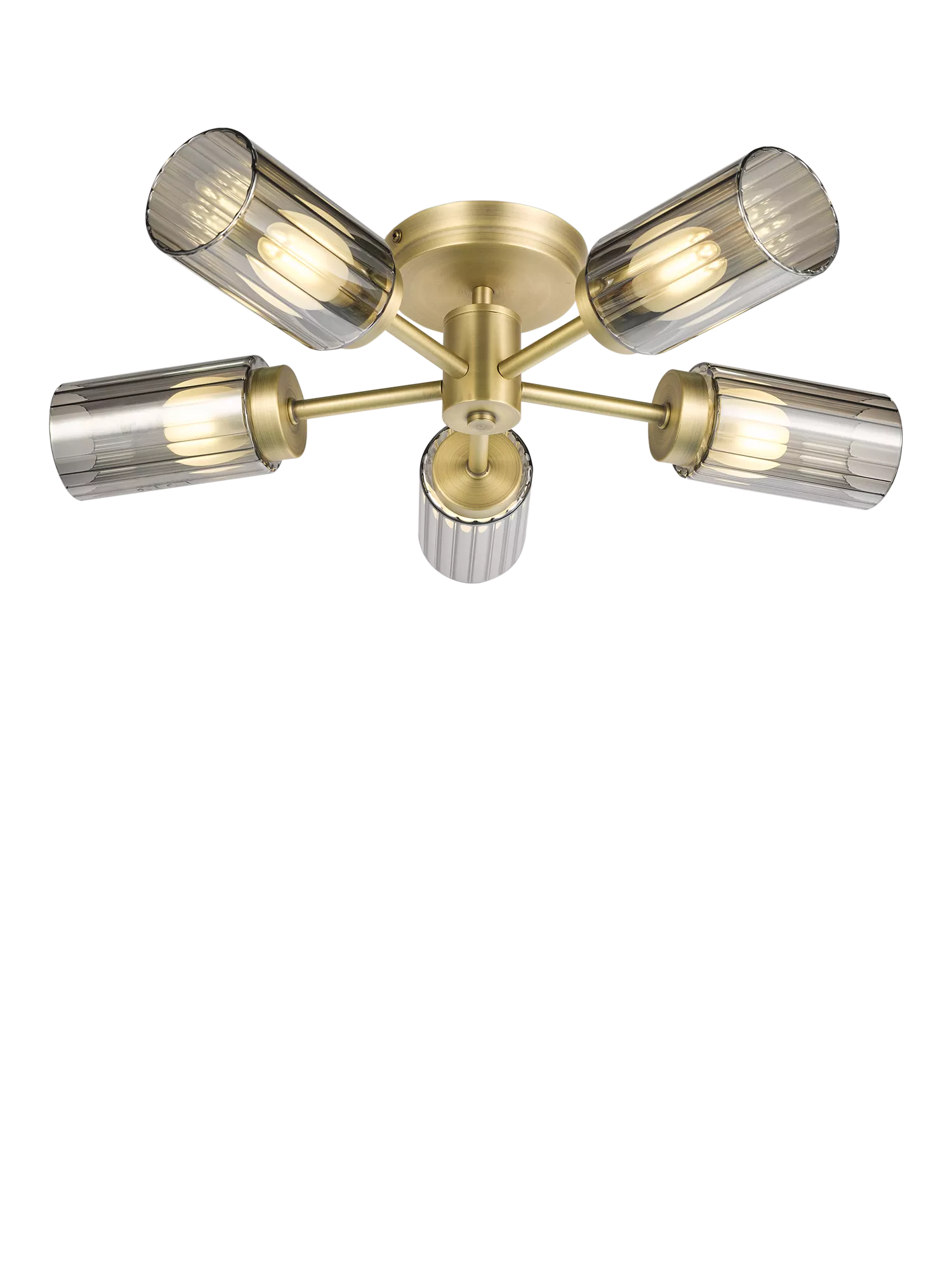 Designed to work with low ceilings or where you need more ceiling height, this Brompton flush ceiling light has five arms. The contemporary matt metallic finish combines with glass shades in a soft ribbed effect, adding texture.