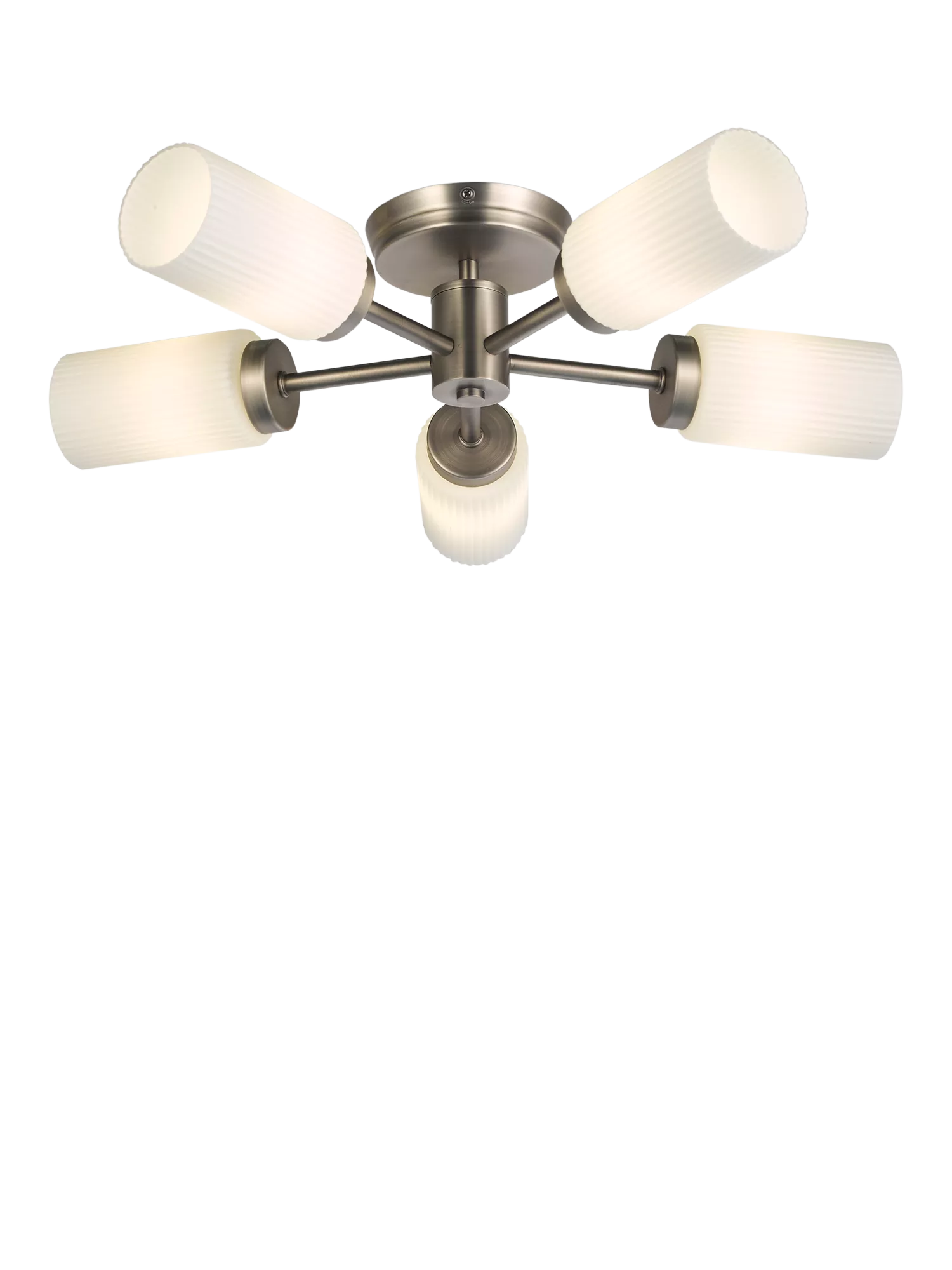 Designed to work with low ceilings or where you need more ceiling height, this Brompton flush ceiling light has five arms. The contemporary matt metallic finish combines with glass shades in a soft ribbed effect, adding texture.