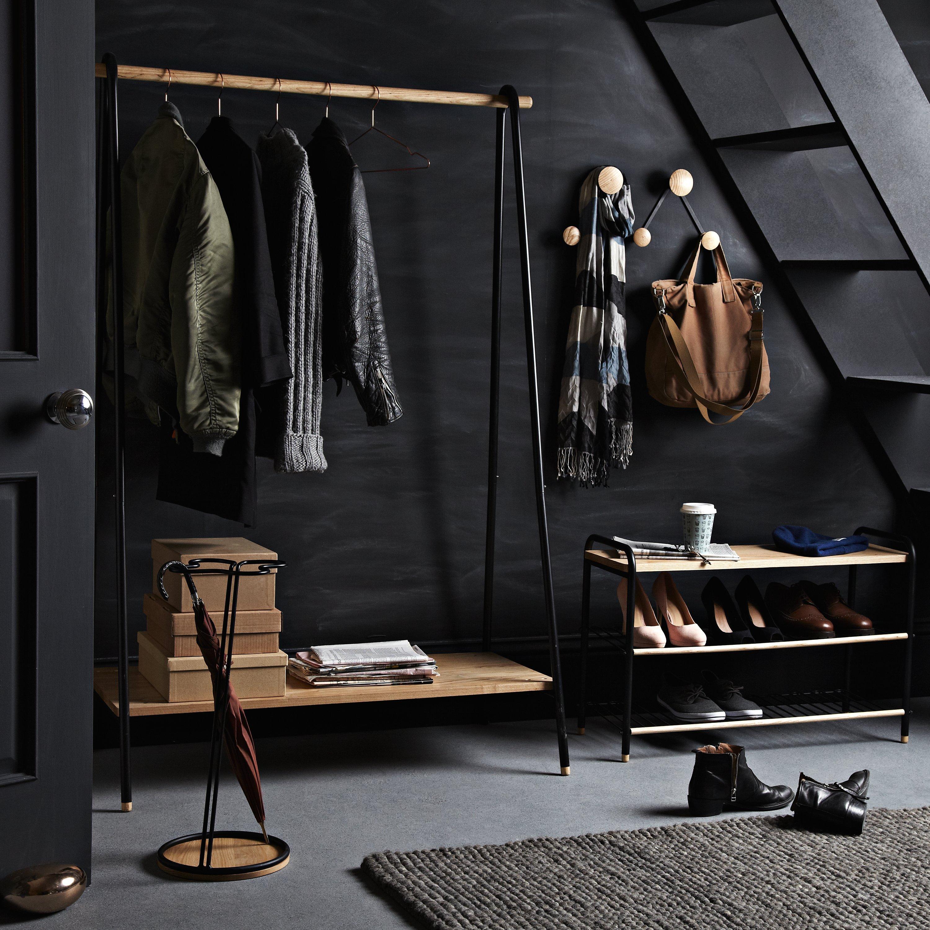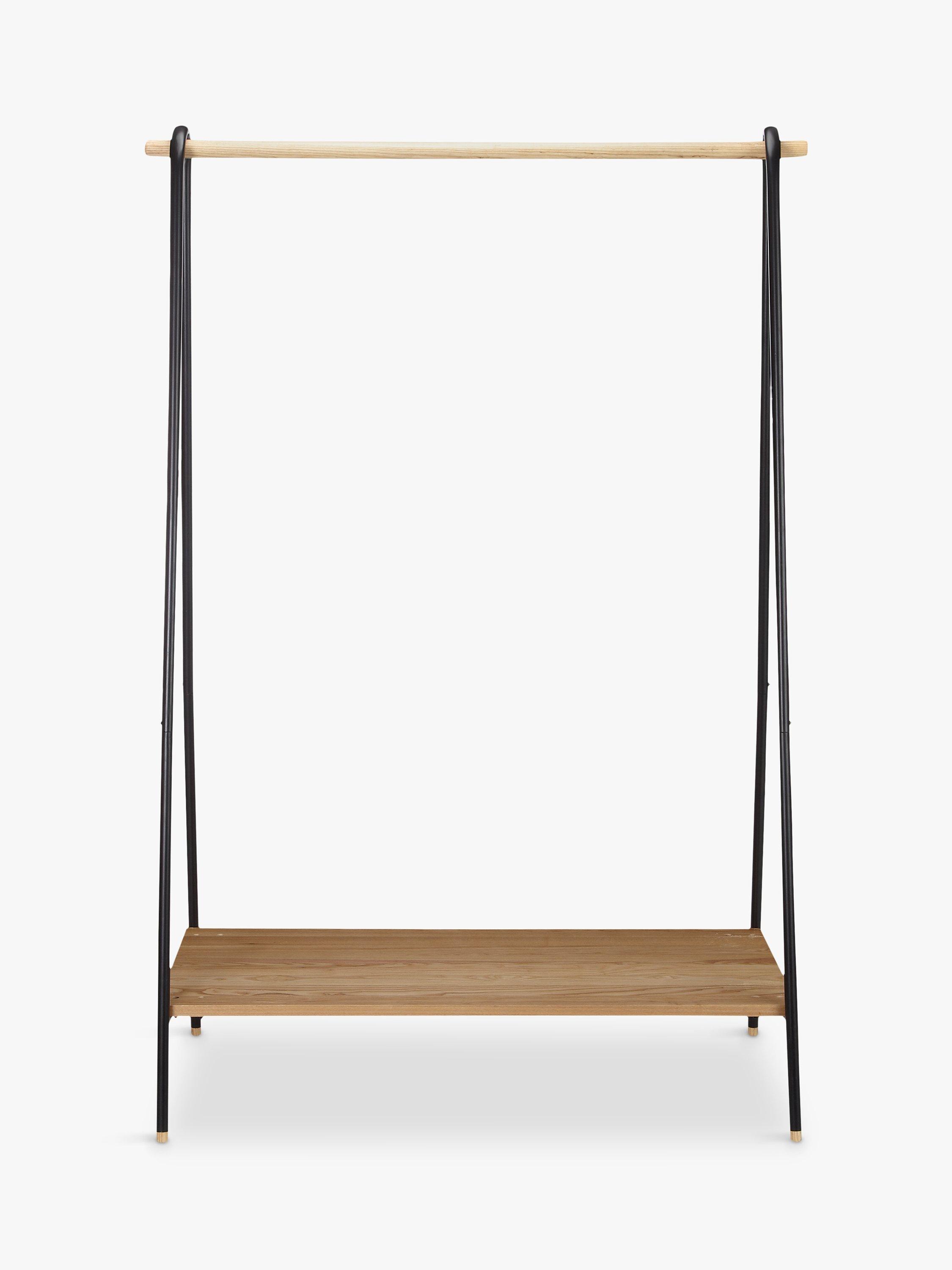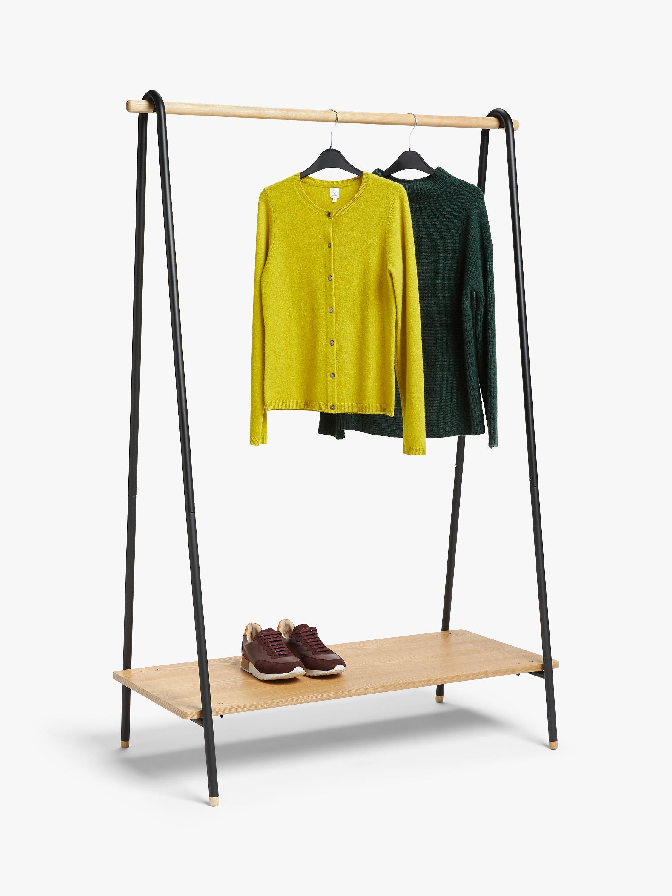 Practical and attractive, this clothes rail has a sturdy ash wood pole to hang your clothes, plus a matching shelf for shoes or handbags. The frame is made from tubular steel, painted to match most surroundings.