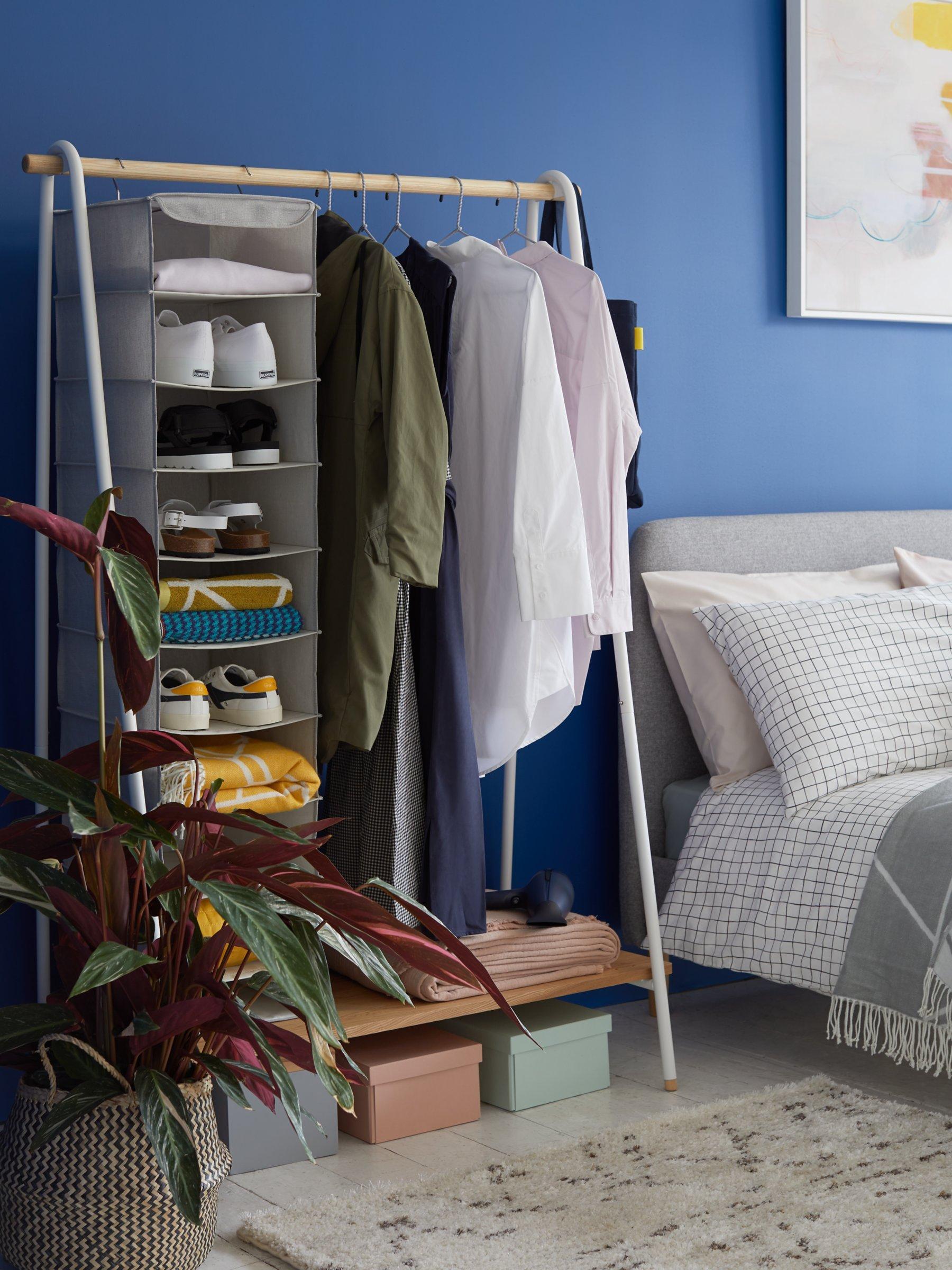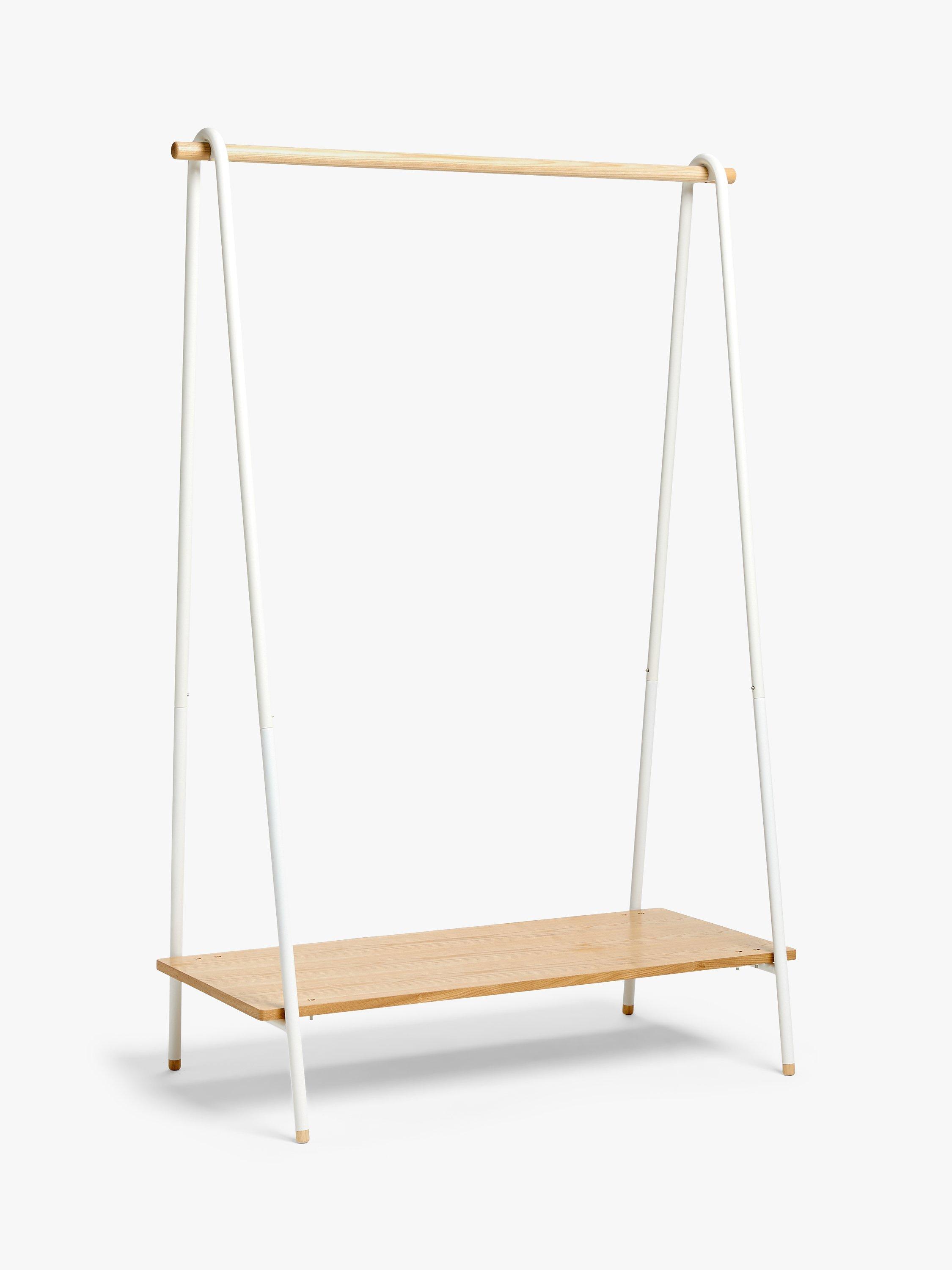 Practical and attractive, this clothes rail has a sturdy ash wood pole to hang your clothes, plus a matching shelf for shoes or handbags. The frame is made from tubular steel, painted to match most surroundings.