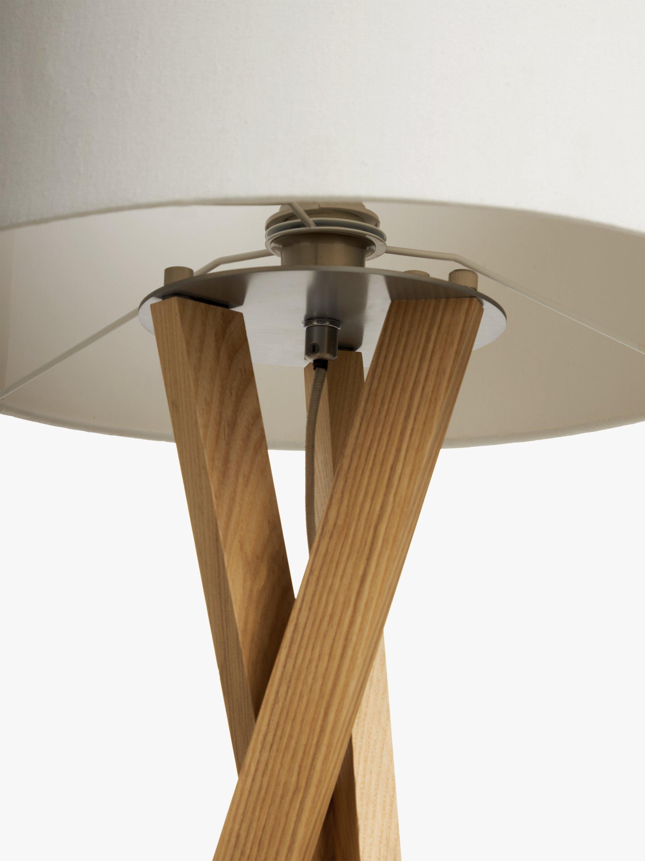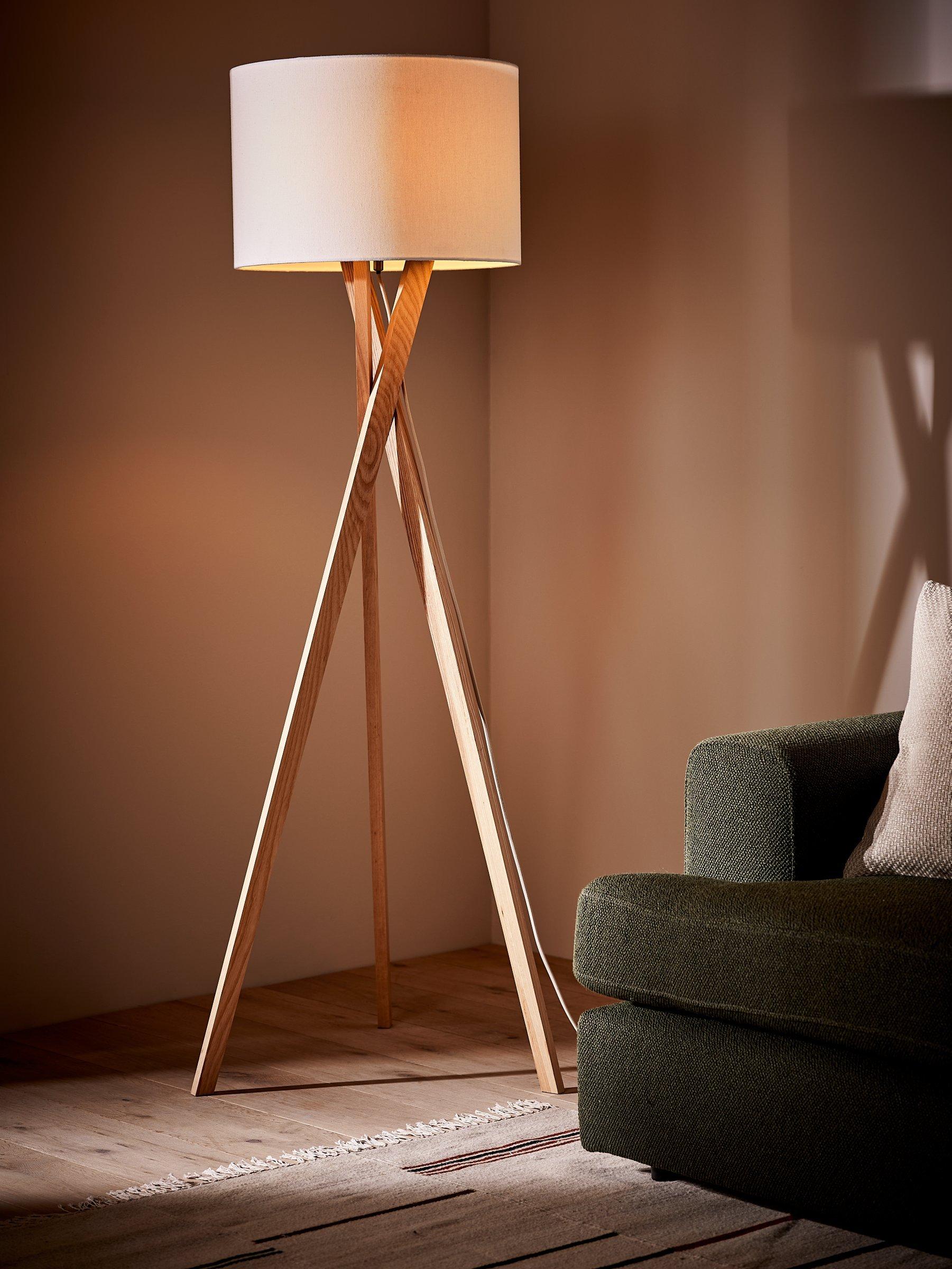 A sleek tripod base suits a variety of settings from contemporary, rustic, transitional to loft style. The legs attach to a metal disc that supports the socket and a textured linen shade. A sleek, decorative fabric covered cord hangs down from the socket and a three-way rotary switch, on the socket, controls the LED bulb. Designed with an on/off floor switch. This floor lamp is smart outlet compatible.