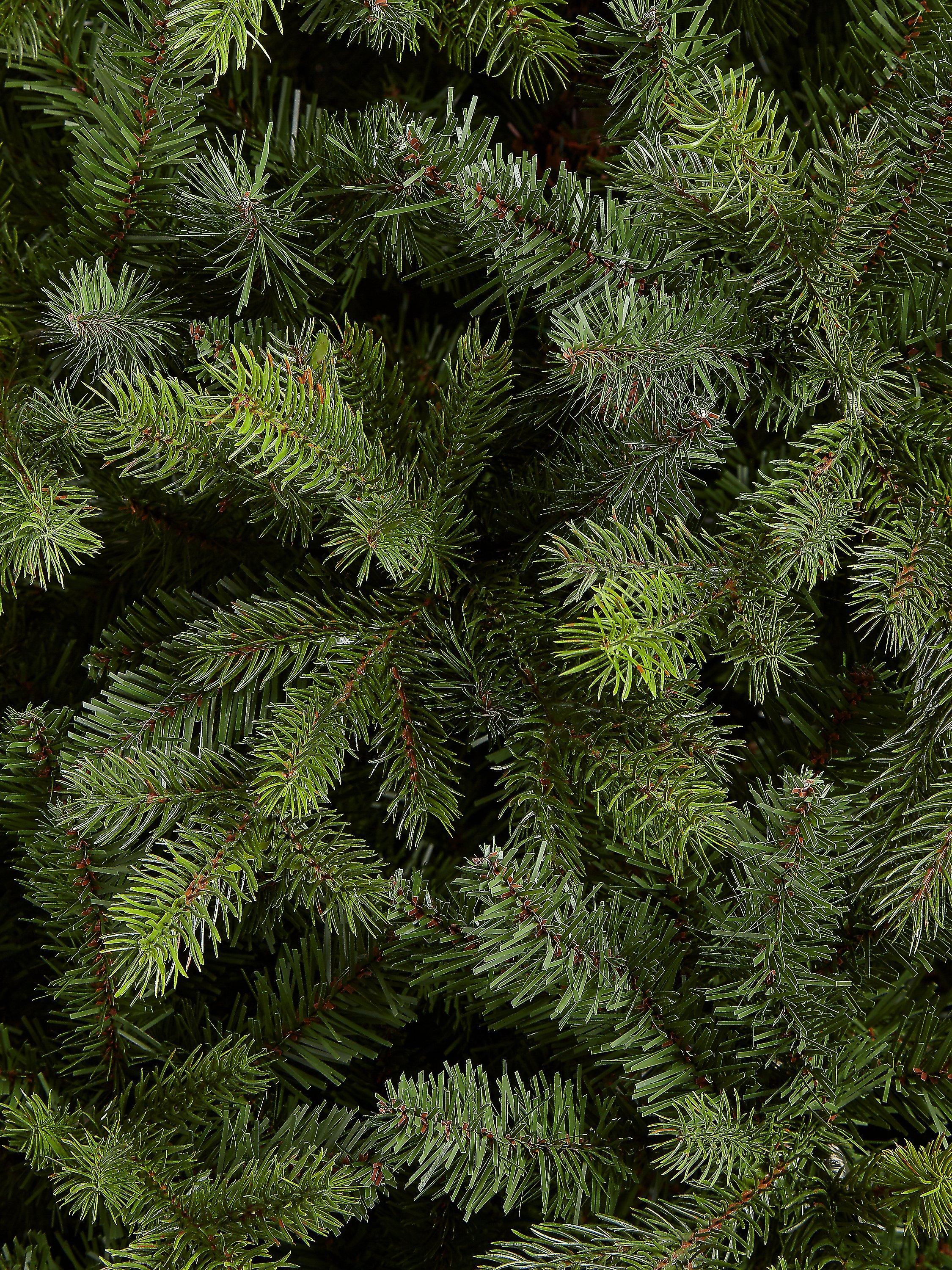 A bushy, classically conical artificial Christmas tree. The tree's outer tips are accurately moulded and coloured to mimic a real spruce tree.