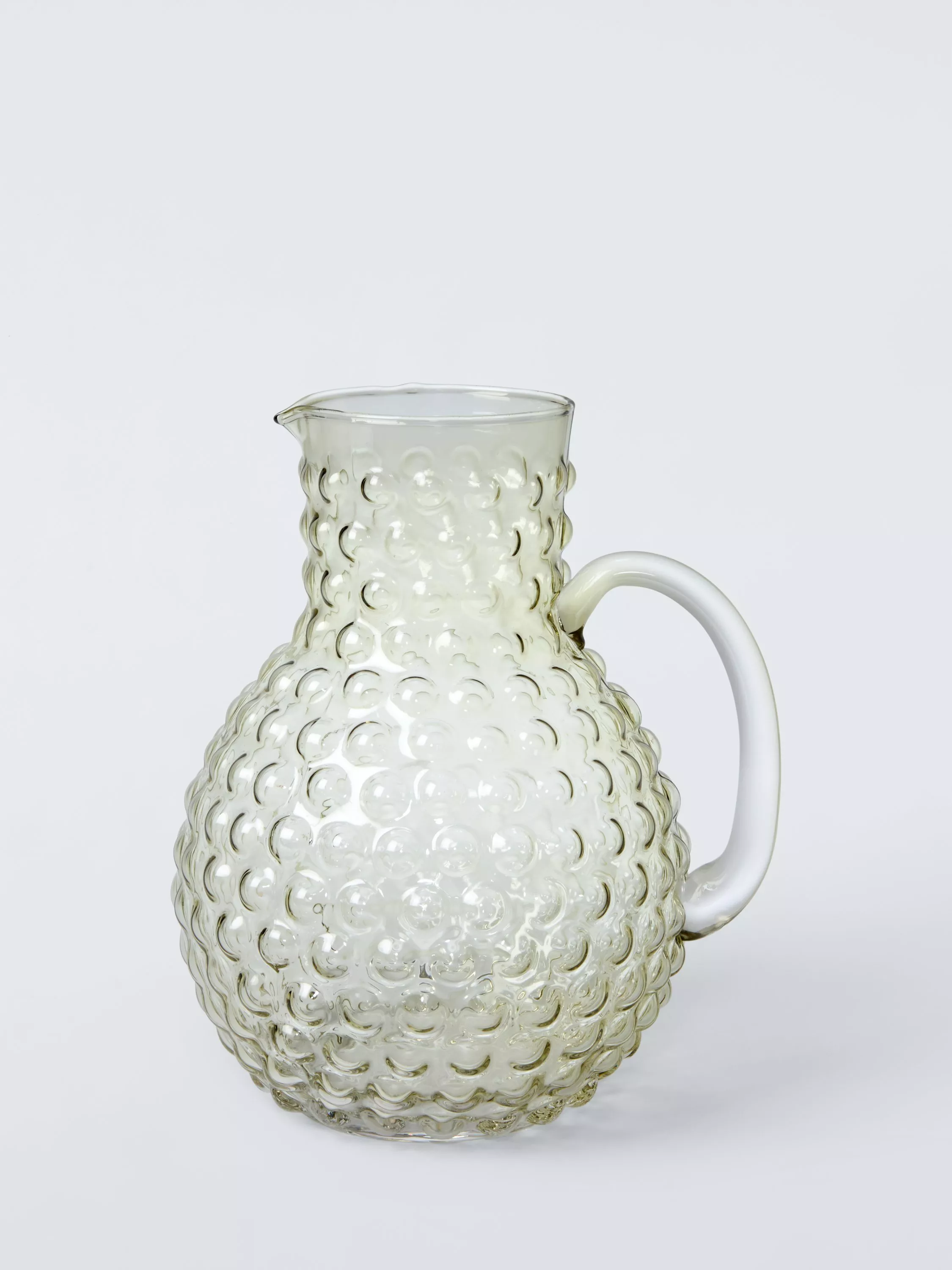 Glass jug textured with bubble shapes. The large handle and lip make it easy to hold and pour. Team it with the matching tumbler to complete the look for your table.