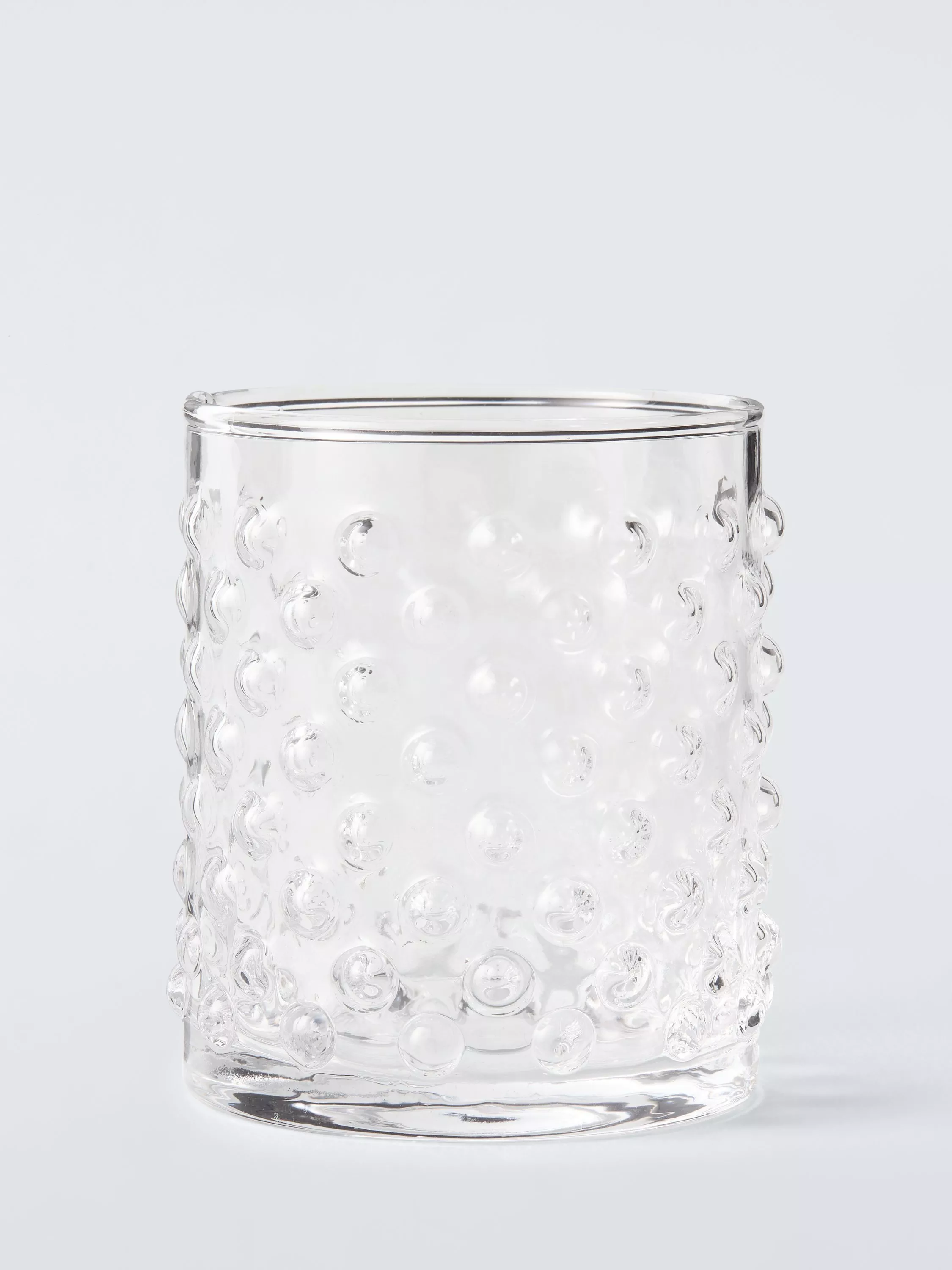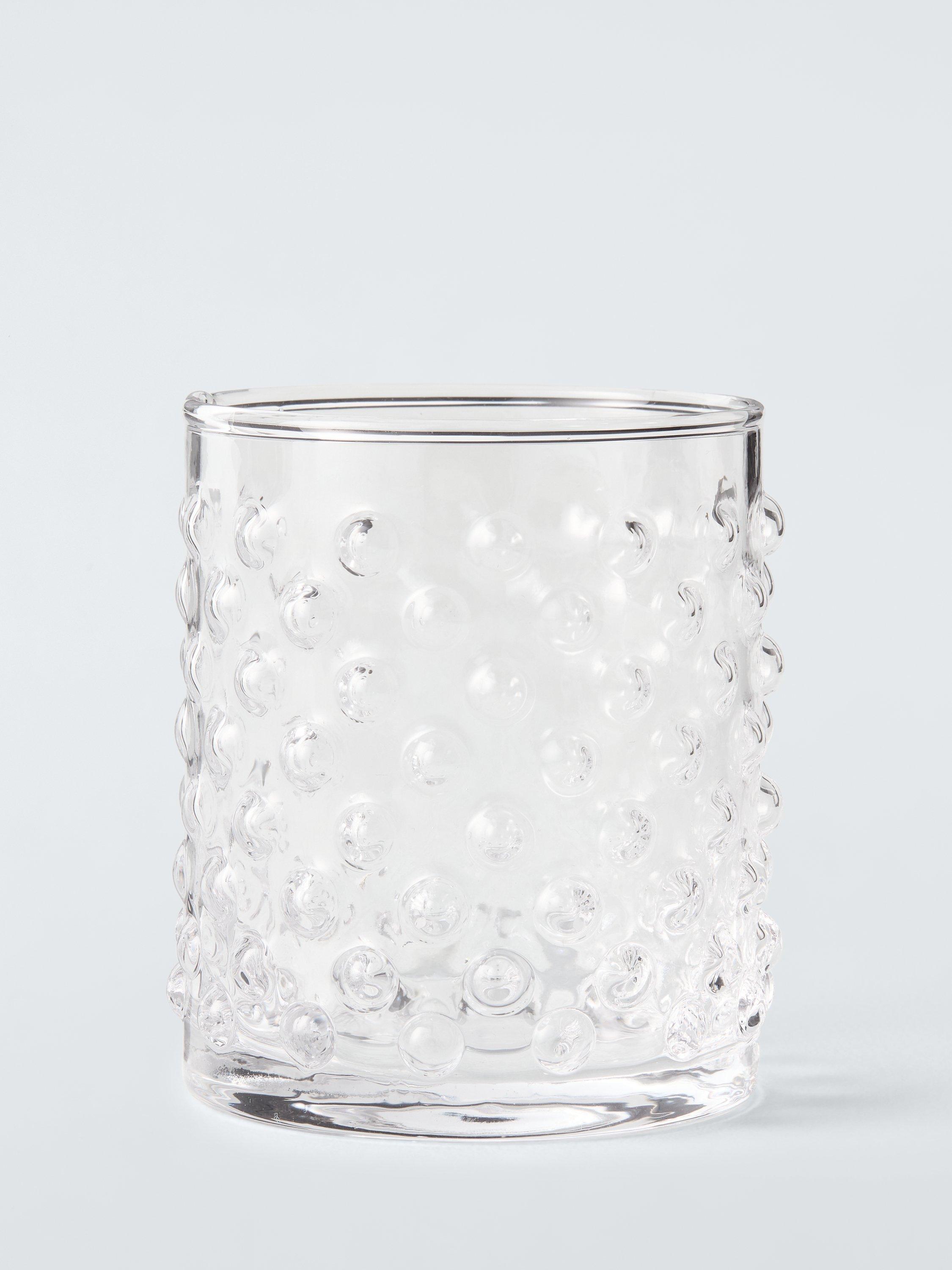 Playful texture meets an artisanal look in this tumbler, defined by a striking surface of raised droplets that catch the light beautifully. These sculptural glass accents offer a secure, tactile grip. Whether used for morning hydration or as a distinctive glass for short cocktails, it brings a modern, textured layer to any contemporary table setting. Dishwasher safe for easy cleaning.