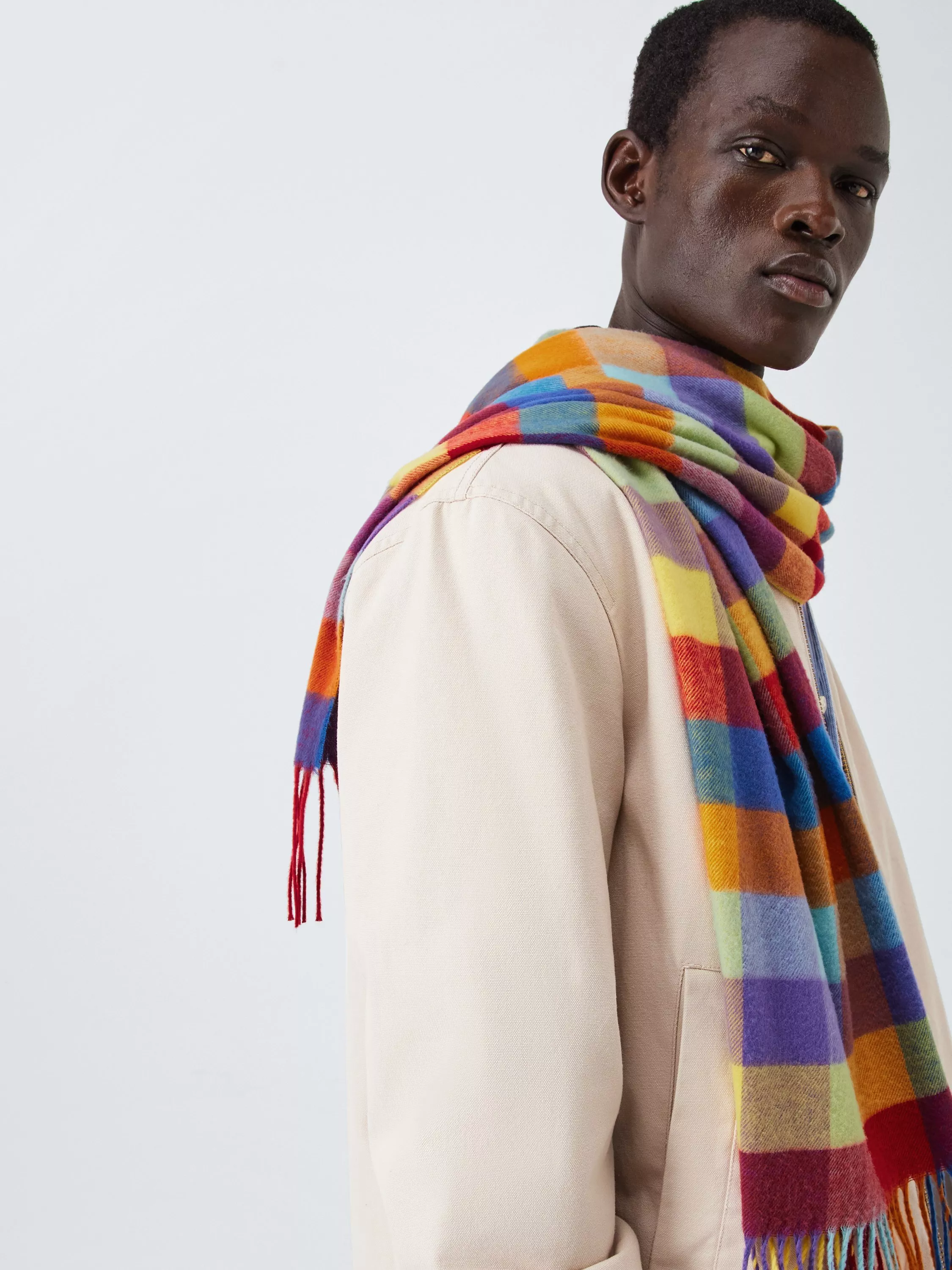Even softer than cashmere, cashmink makes the ideal fabric for a soft, warming, winter scarf. It's an acrylic fabric, making it machine washable, water-resistant, and hypoallergenic as well. This cashmink scarf features a buffalo check pattern, and is topped off in fine style with long, loose tassels for texture.
