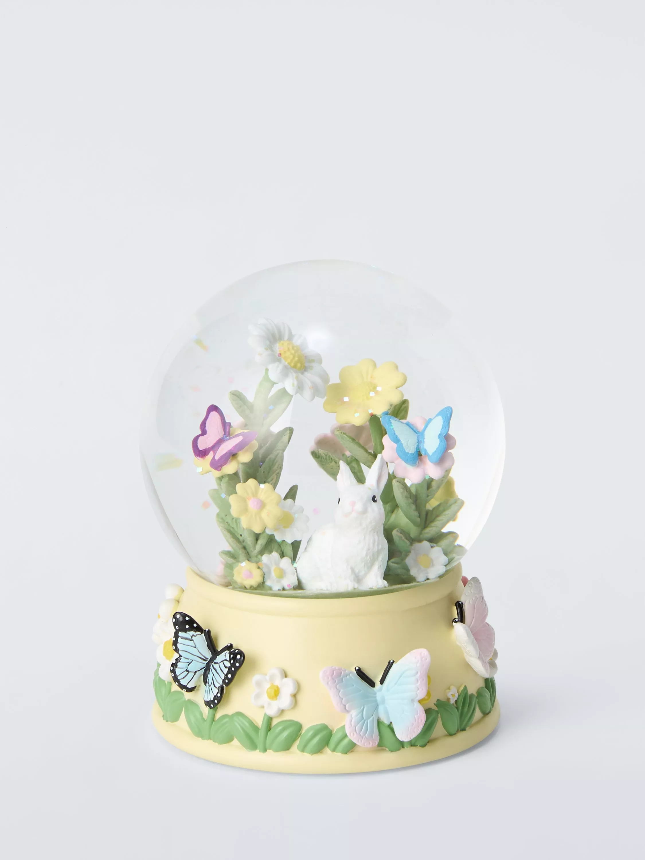 This resin snowglobe features an adorable white rabbit sitting among spring flowers and surrounded by butterflies. Th base is also decorated.