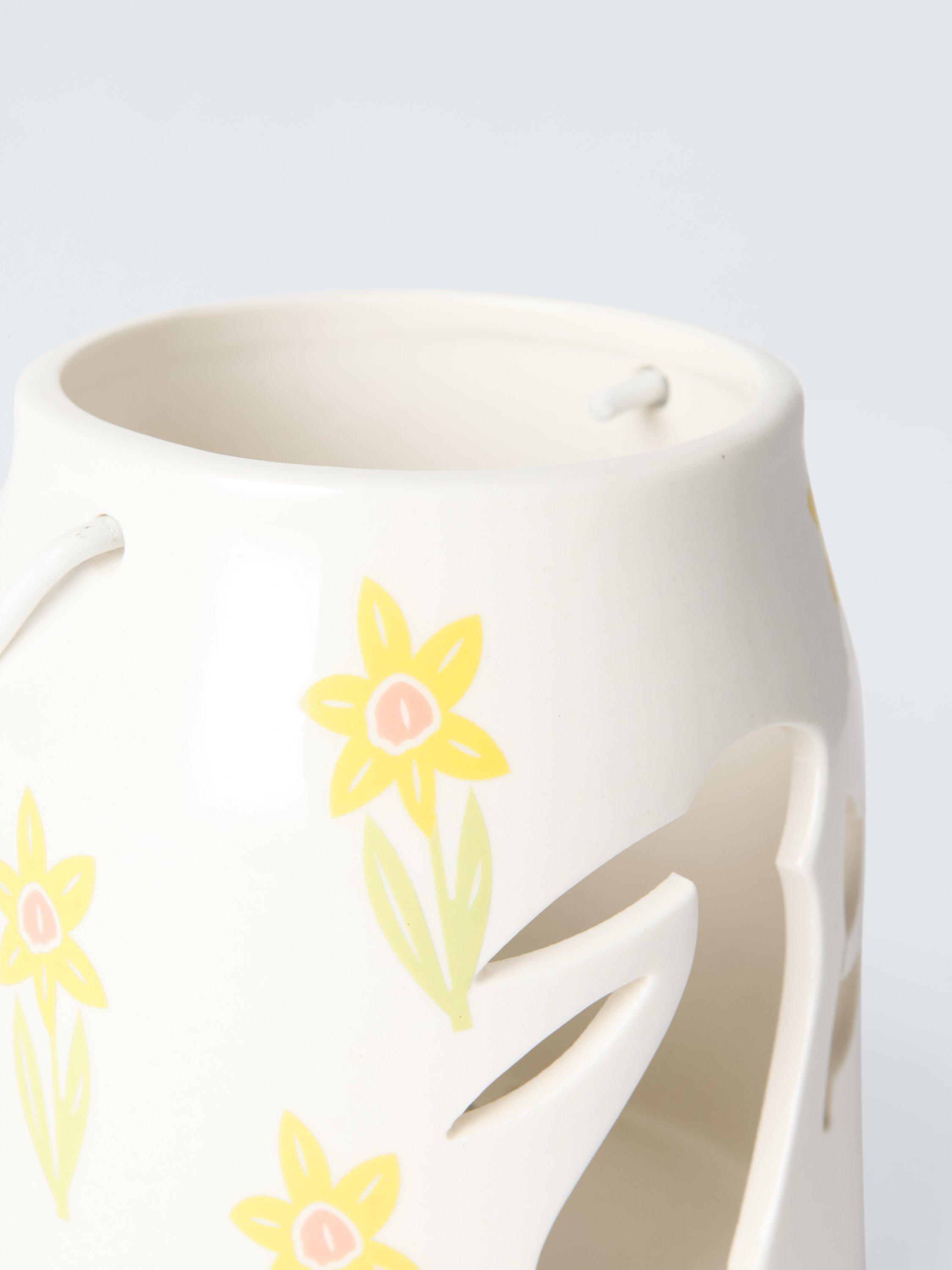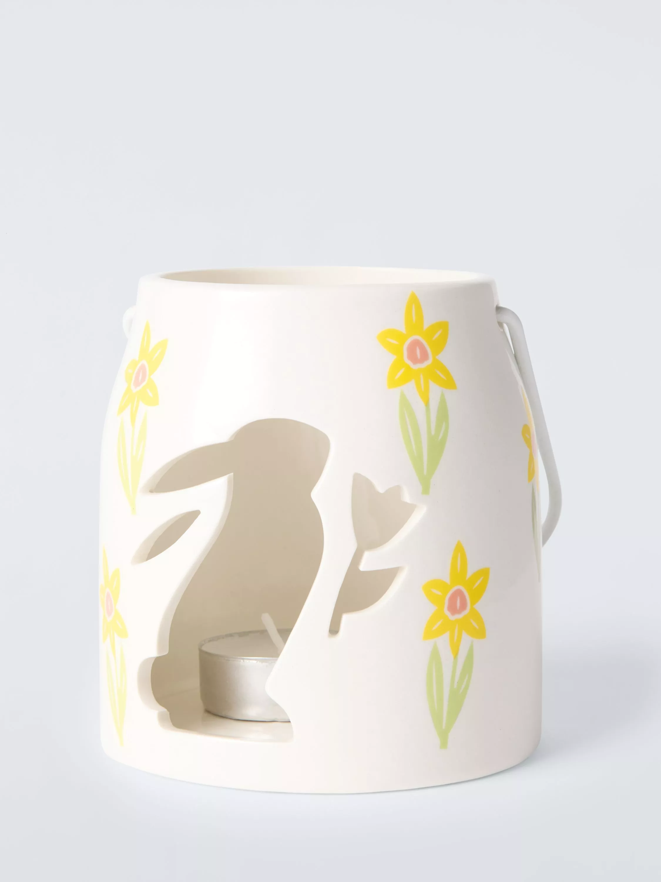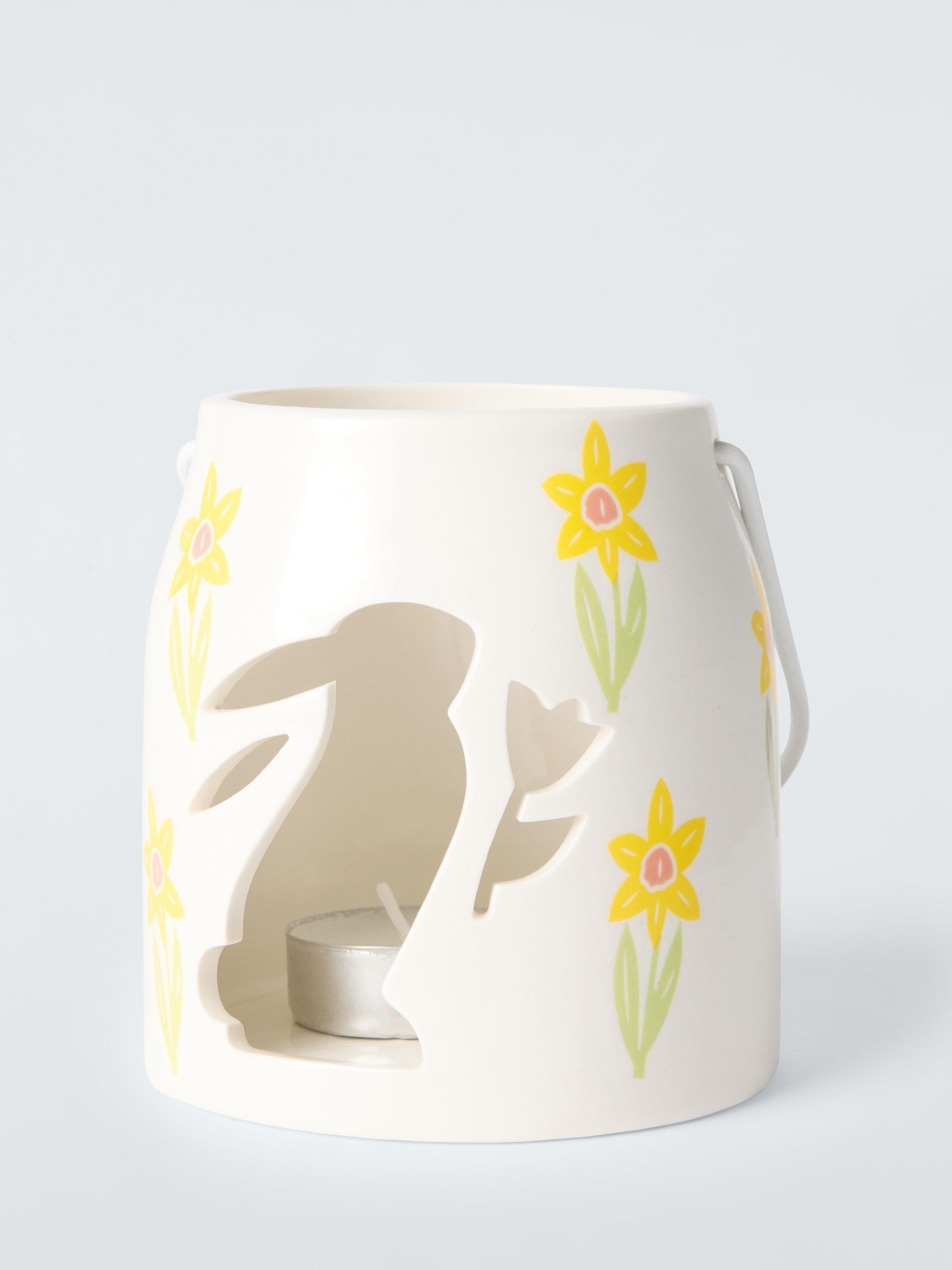 This ceramic lantern has a pretty, painted design of spring flowers and bunny and flower cut outs for the light inside to shine through.