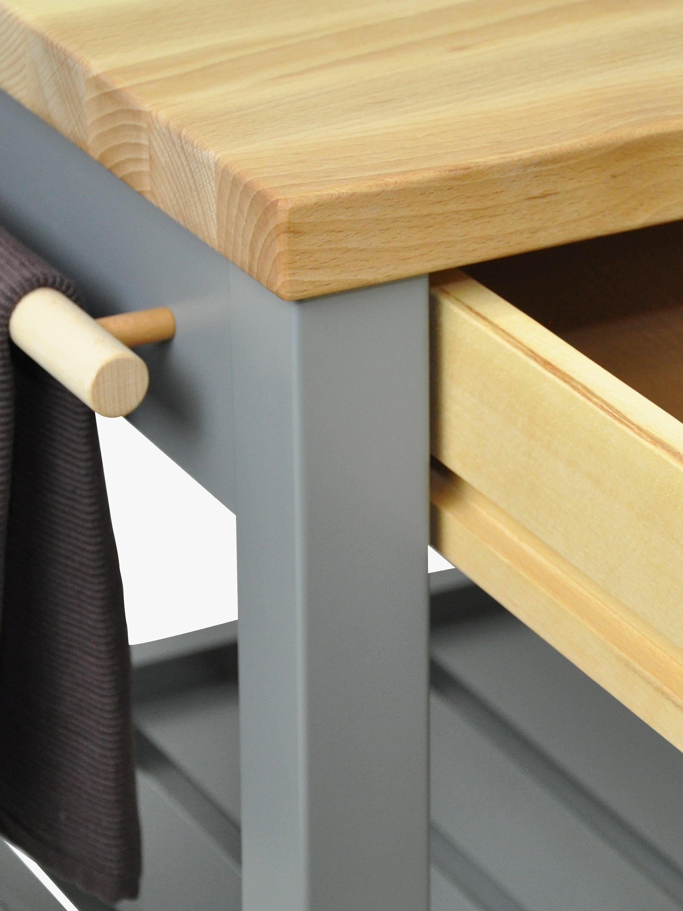 The trolley includes two shelves for storing and displaying cookware and kitchen items plus a tea towel rail that's removable and can be positioned on the left or right, to suit your kitchen space. The handy drawer is deep enough to fit a standard cutlery tray.