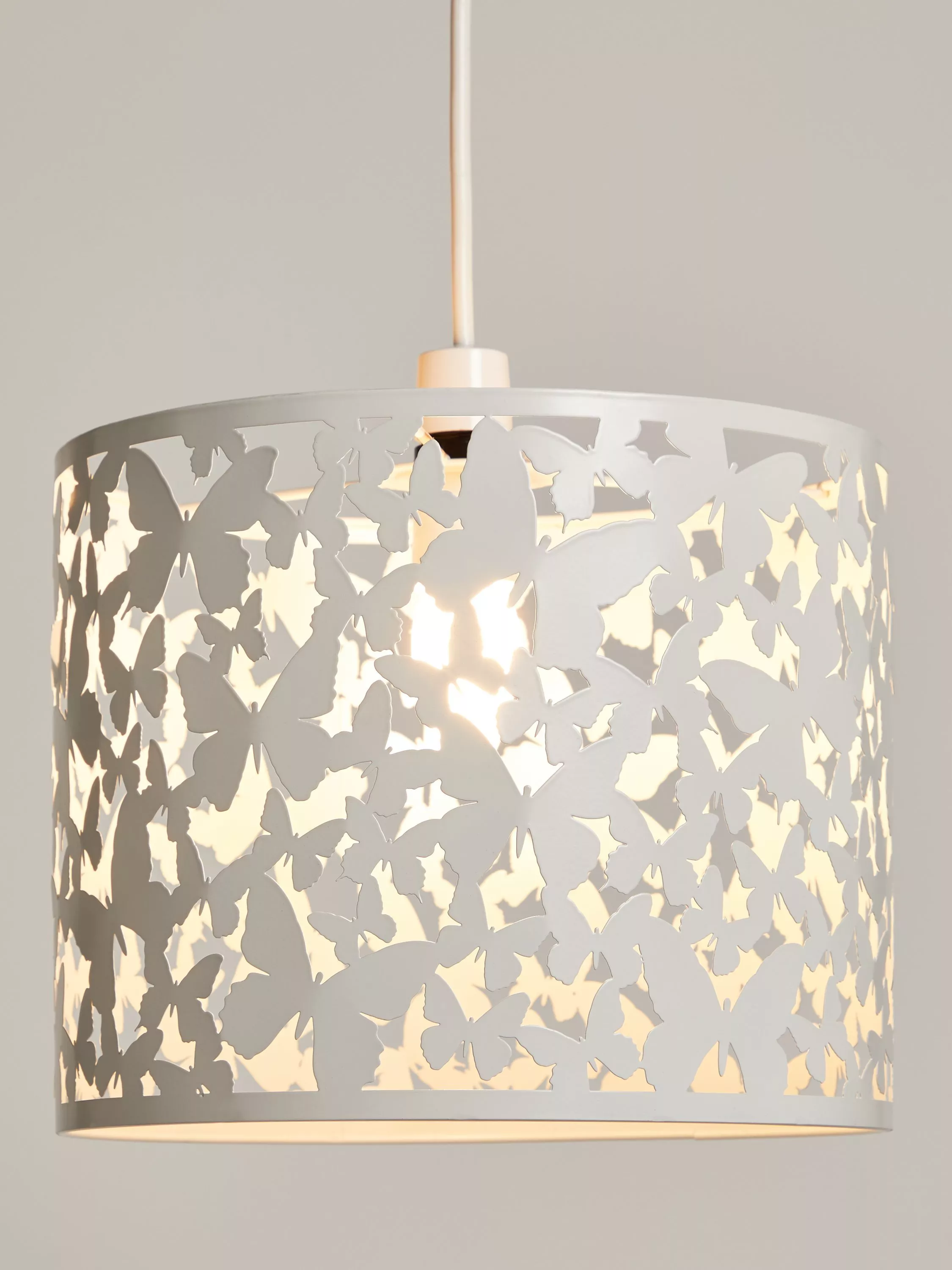 Crafted from metal, this dainty Butterflies lampshade is suitable for ceiling lights only. Its classic, drum-shaped style has been cut-out with a delicate butterfly pattern that allows light to spill through from the centre, creating an eye-catching pattern on nearby walls.