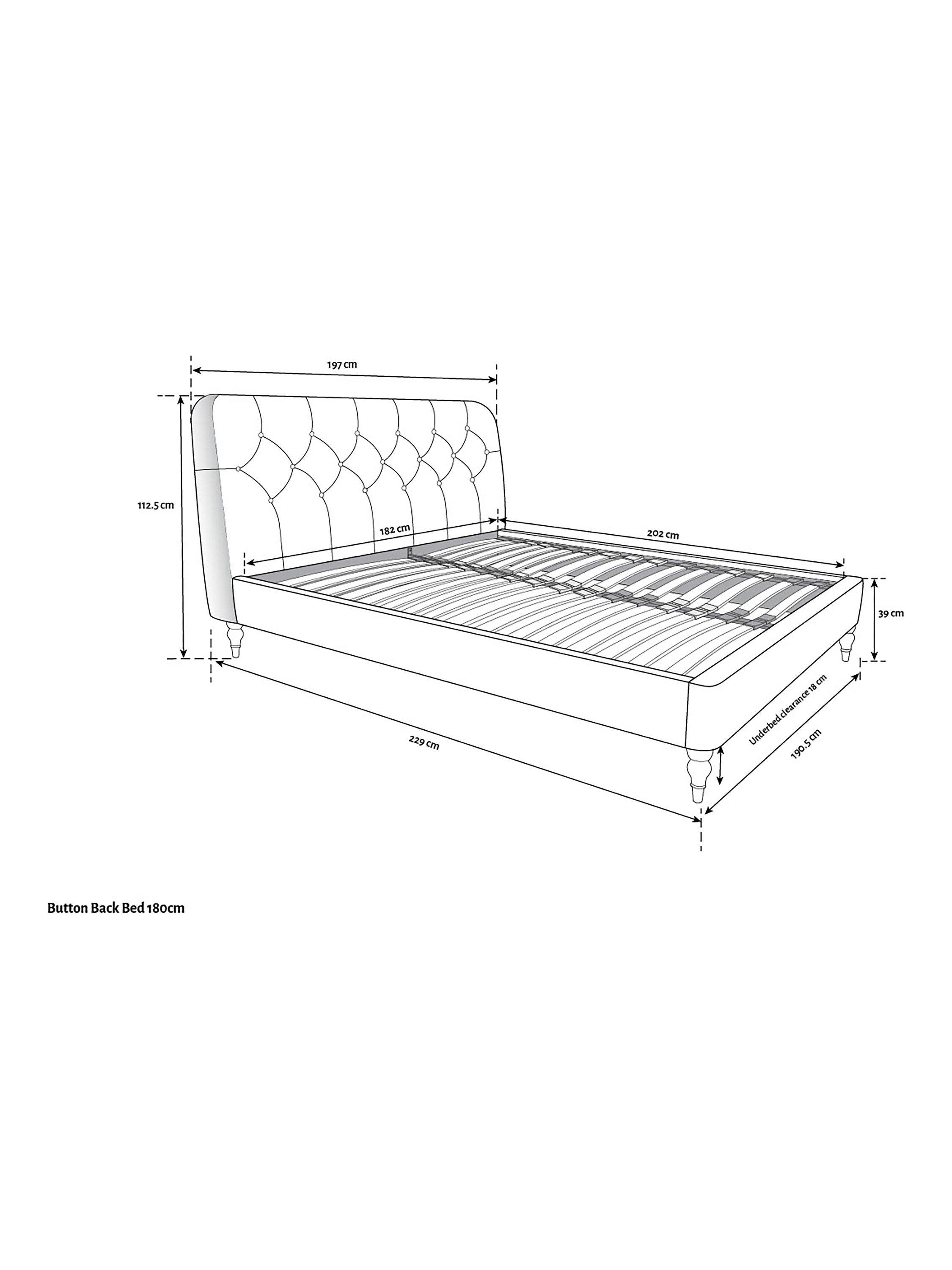 The timeless design of our Button Back bed frame makes it a versatile choice and the subtly curved padded headboard gives a modern edge. We've added button detailing to the headboard and supported the frame with low, turned legs made from high quality wood. There are also supportive sprung slats in the base.