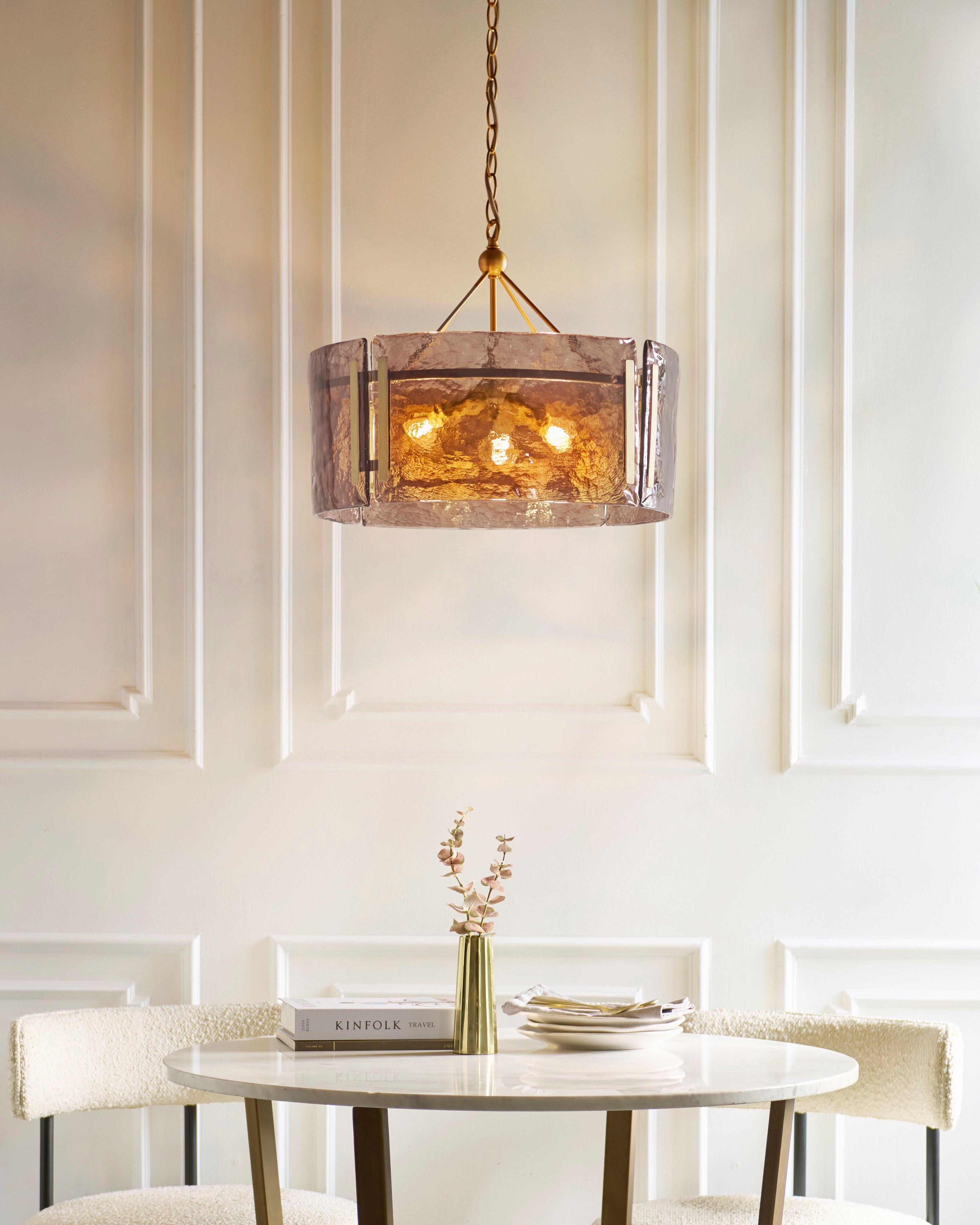 Blending rich brass with bold-hued, handmade textured glass, this pendant light combines luxurious finishes for a sophisticated look. Bold without being loud, it creates an inviting ambience for living and dining spaces and provides an eye-catching centrepiece for your interior. This ceiling light is height-adjustable to suit your space.