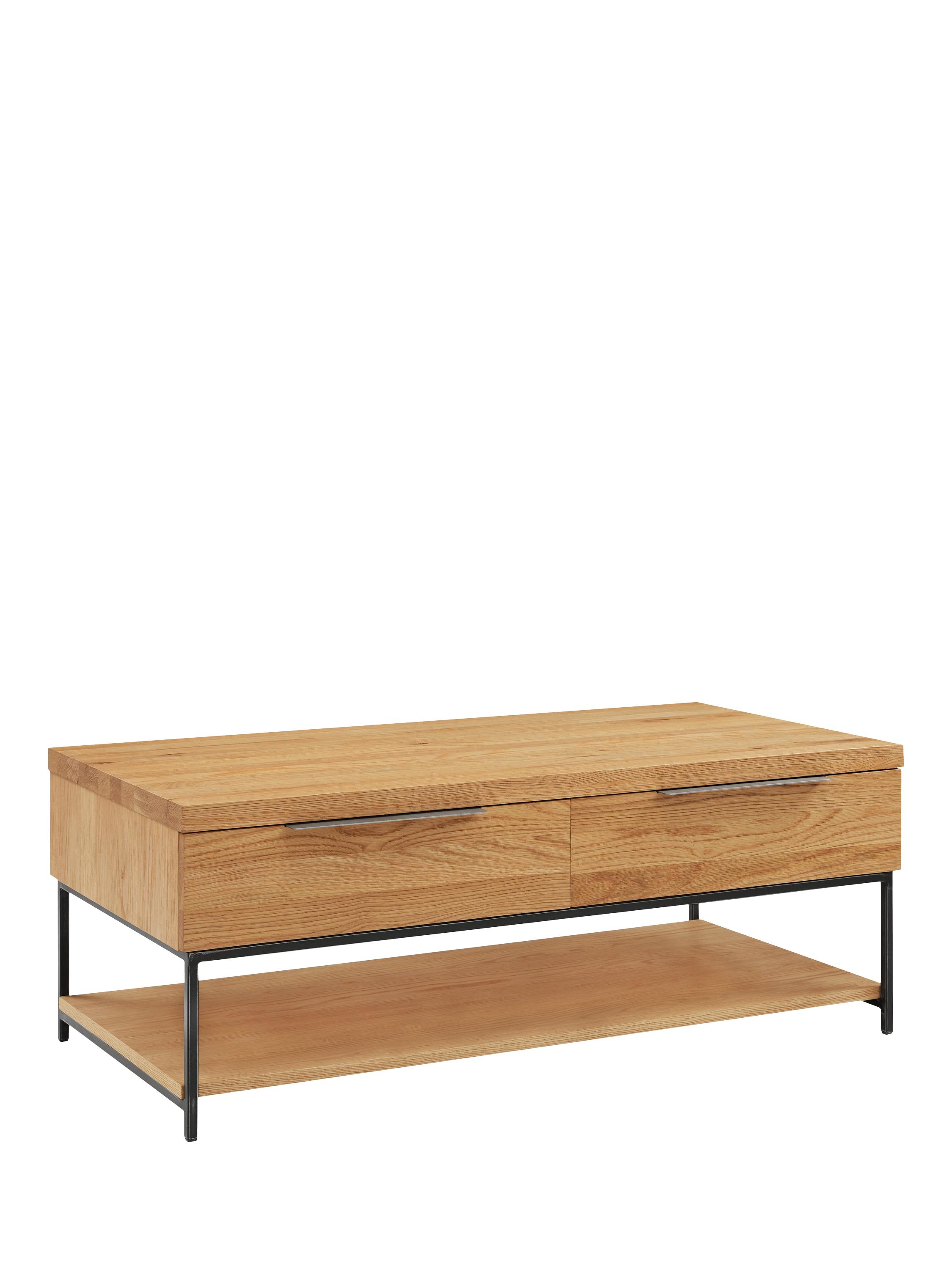 This industrial-inspired coffee table is simple and functional in design, it is supported by a robust, welded iron frame that's finished with a durable lacquer. Two drawers and a spacious lower shelf let you tidy away remote controls and other devices, coasters, magazines and other living room clutter.