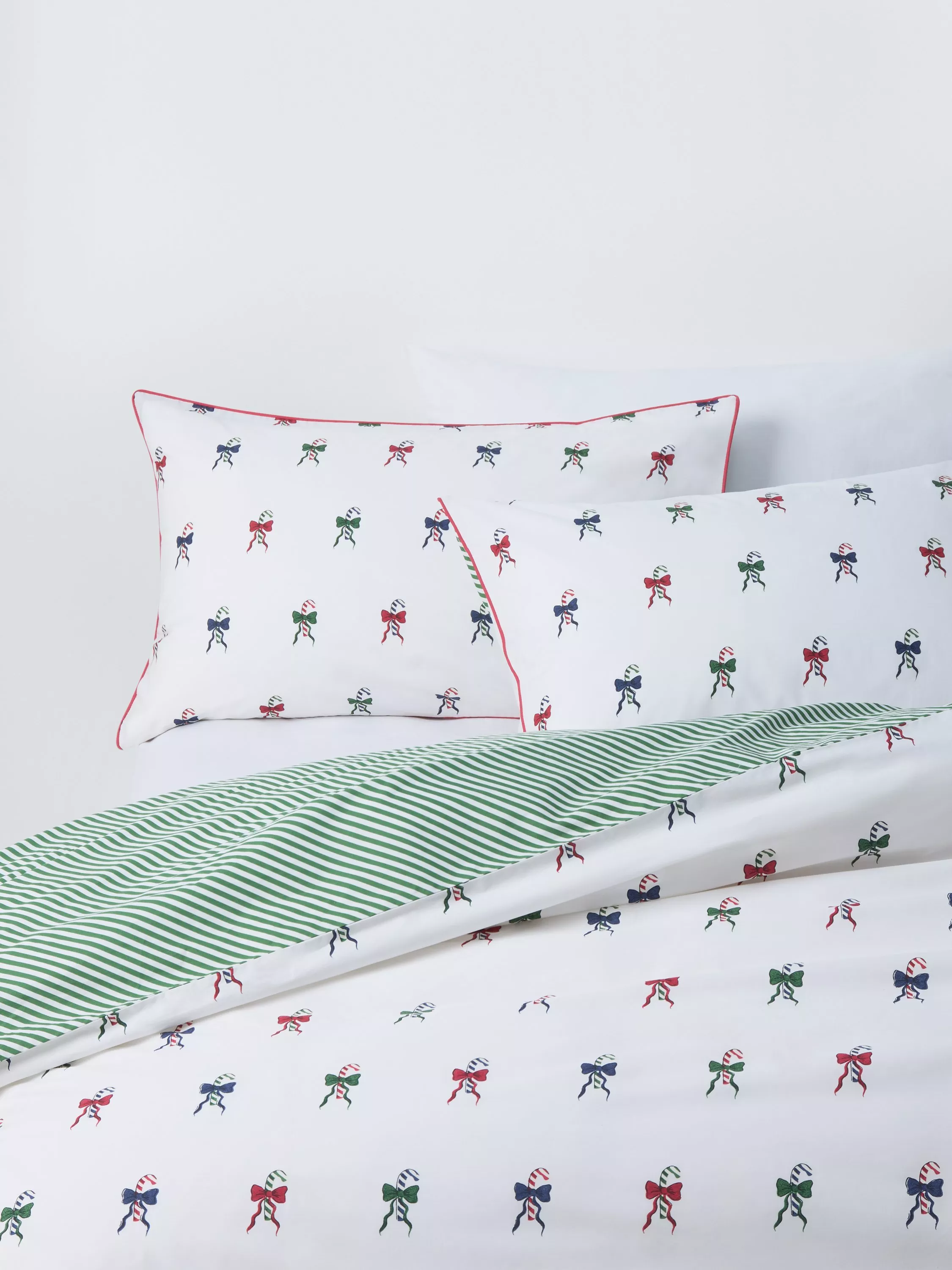 A fun and festive cotton duvet set with a candy cane bow print on face and a diagonal stripe print on the reverse. Finished with red piping detail.