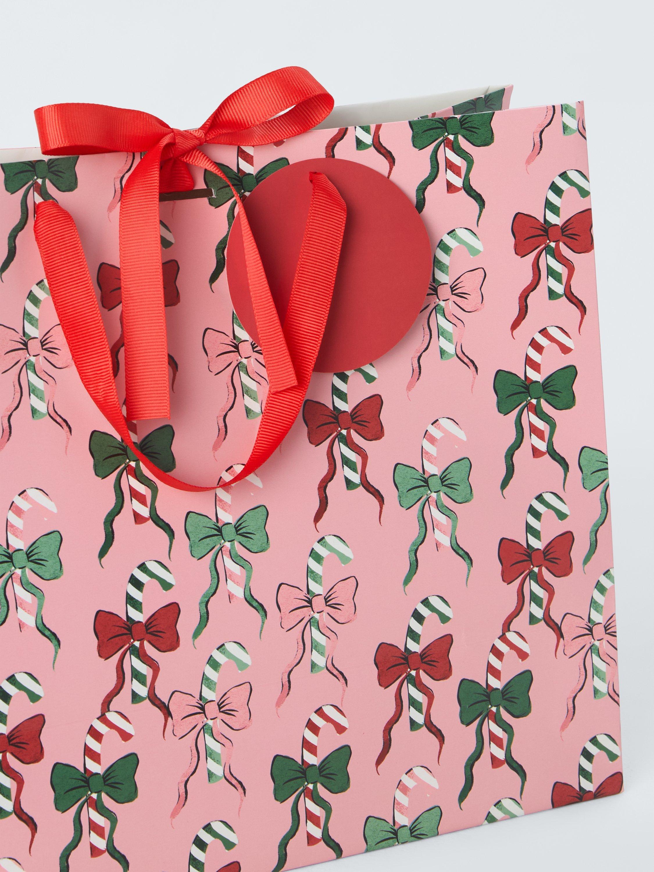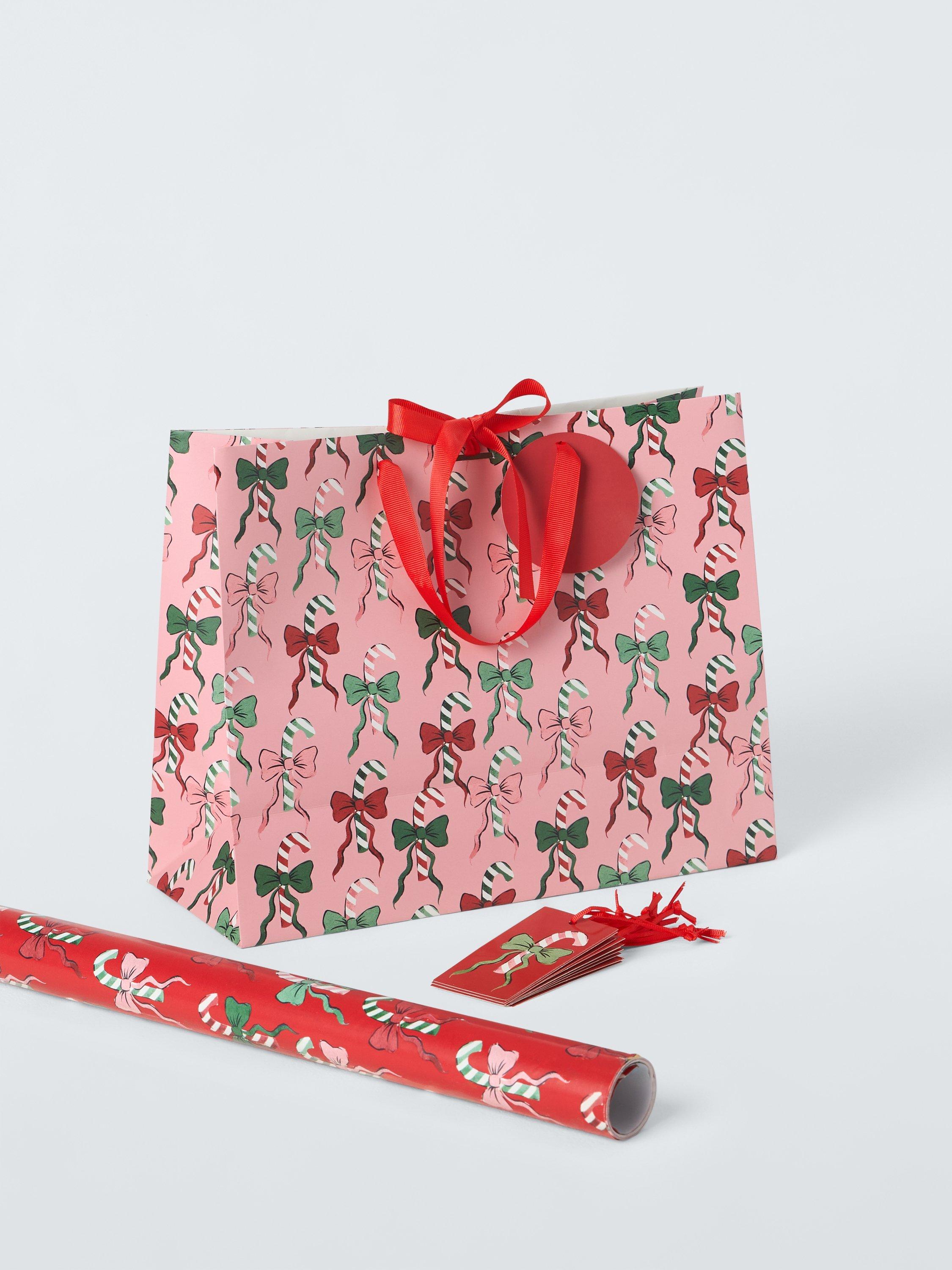 Printed gift bag with ribbon handles, bow trim and gift tag.