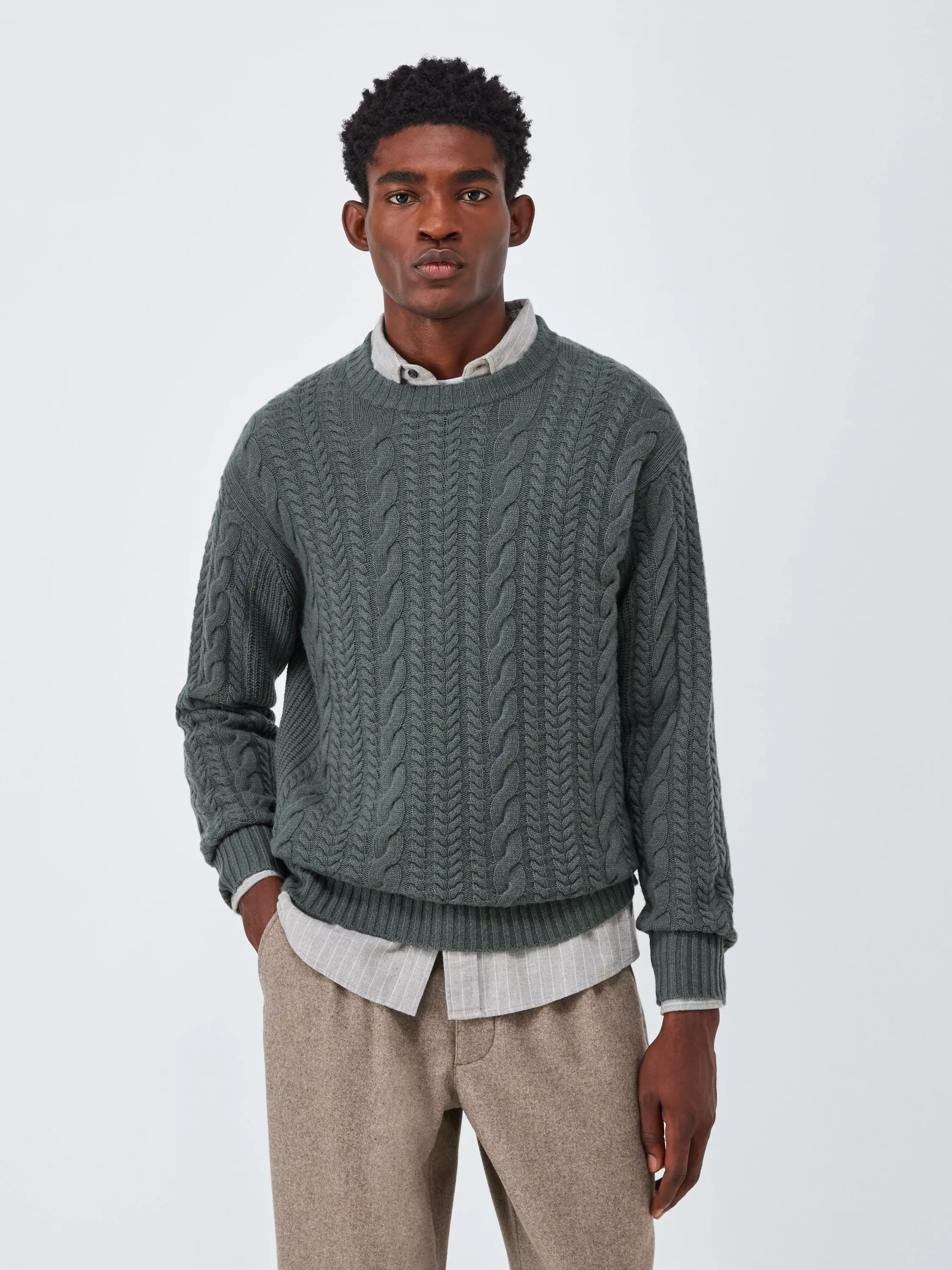 A classic cable knit jumper made from soft and luxurious cashmere with ribbed knit detailing at the crew neckline, hem and cuffs.