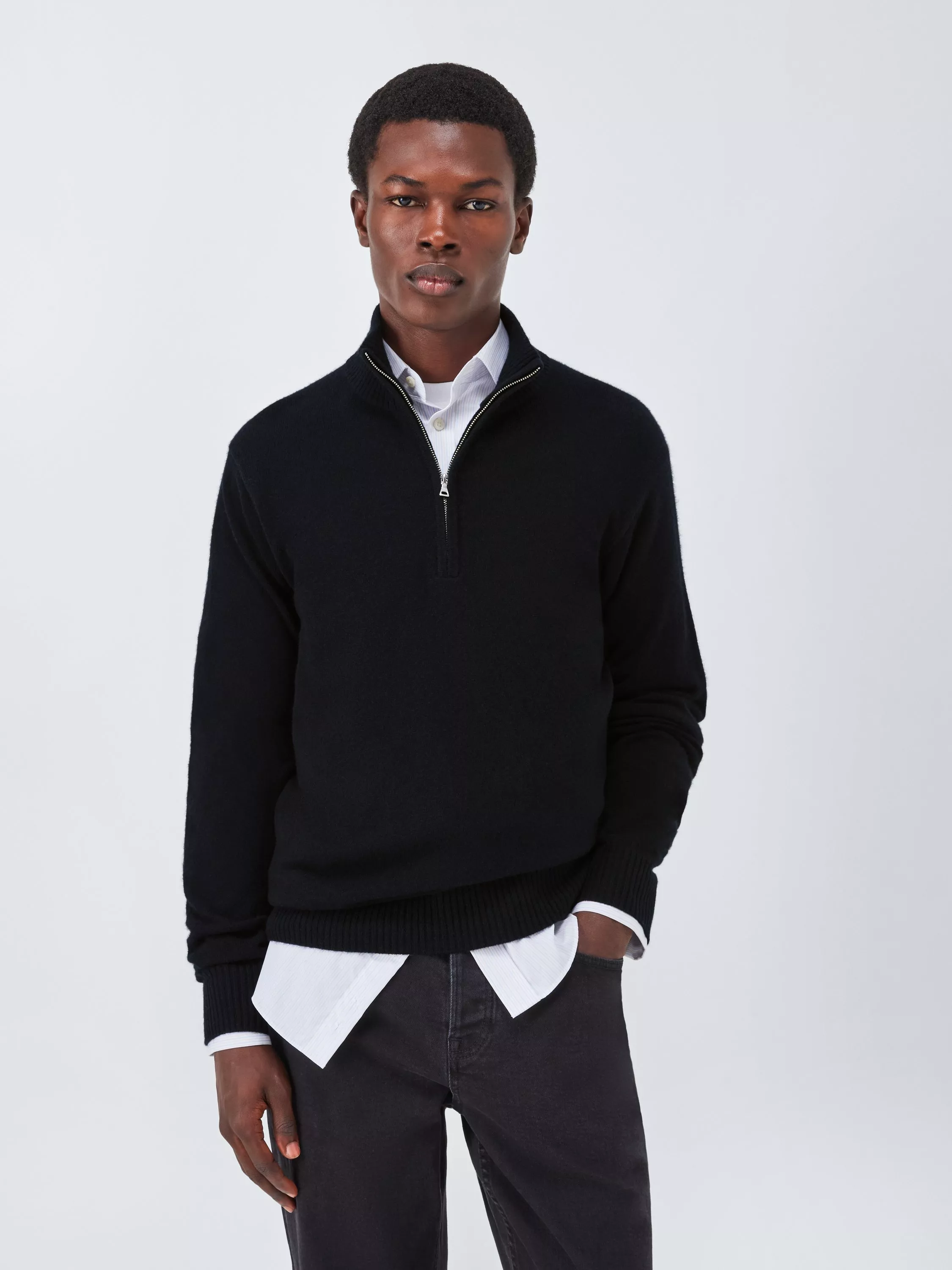 Modern and versatile layer with an on-trend half zip neckline. Made from supremely soft and luxurious cashmere and finished with ribbed knit detailing on the neck, cuffs and hem.