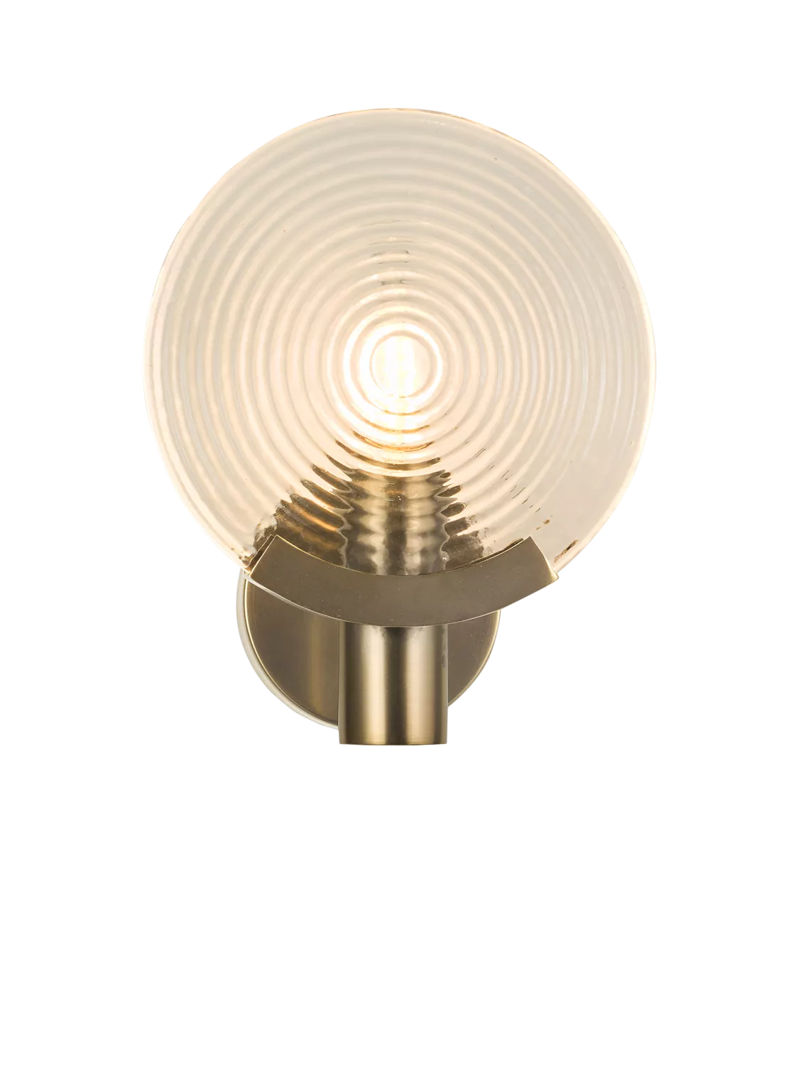 A show stopper. Designed to impress, this wall light features a bespoke rippled, bubble glass disc in front of a lamp to diffuse the light. The lamp is displayed on a circular bar with metal work finished in satin bronze.