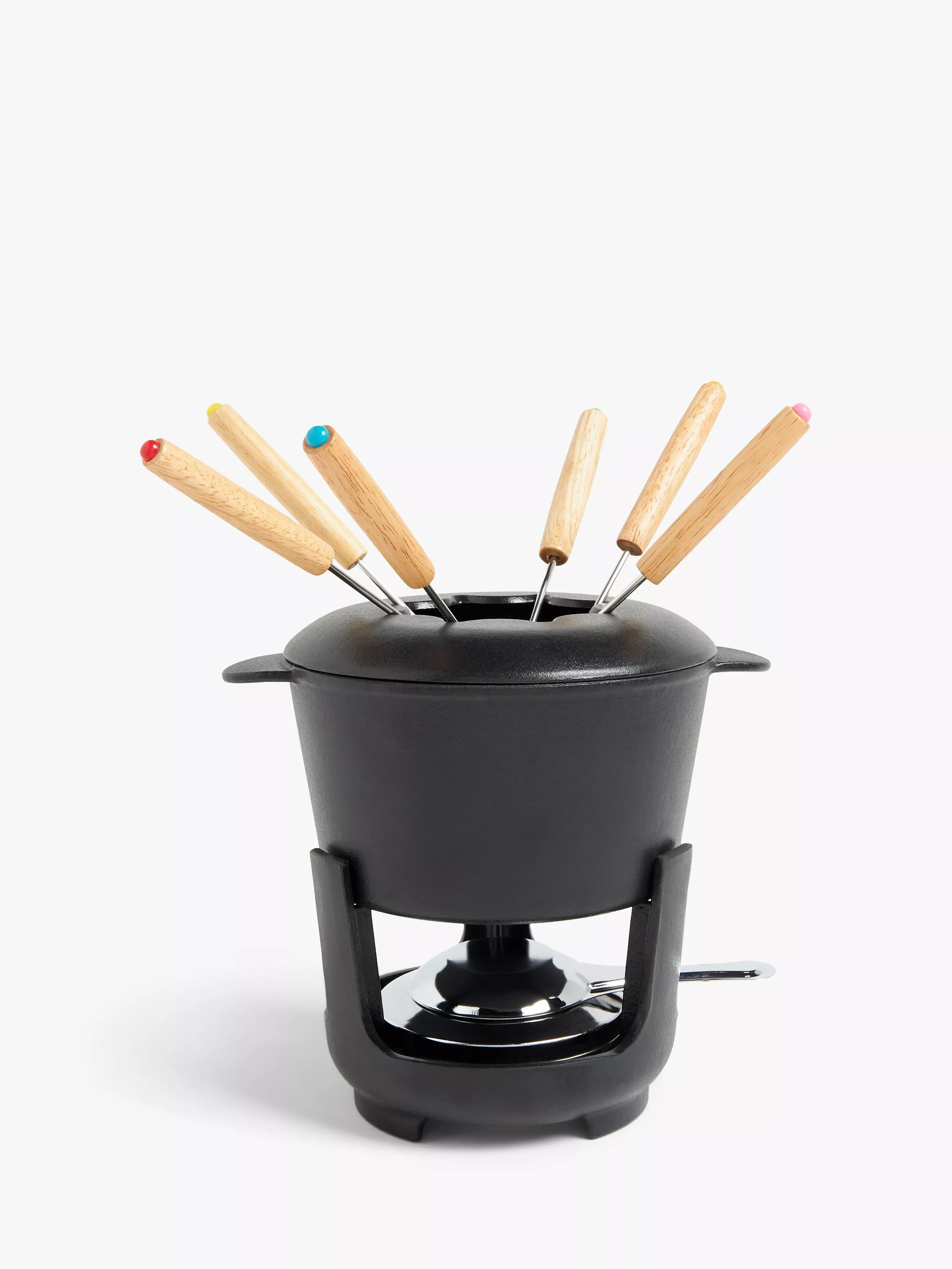 Cast iron fondue set that heats quickly and evenly. Cast iron is excellent at retaining heat so you can enjoy a shared fondue experience for longer at your table. Ideal use for three to four people, the set comes with six colour-coded mini forks, made with rubberwood handles, and a non-splatter lid.