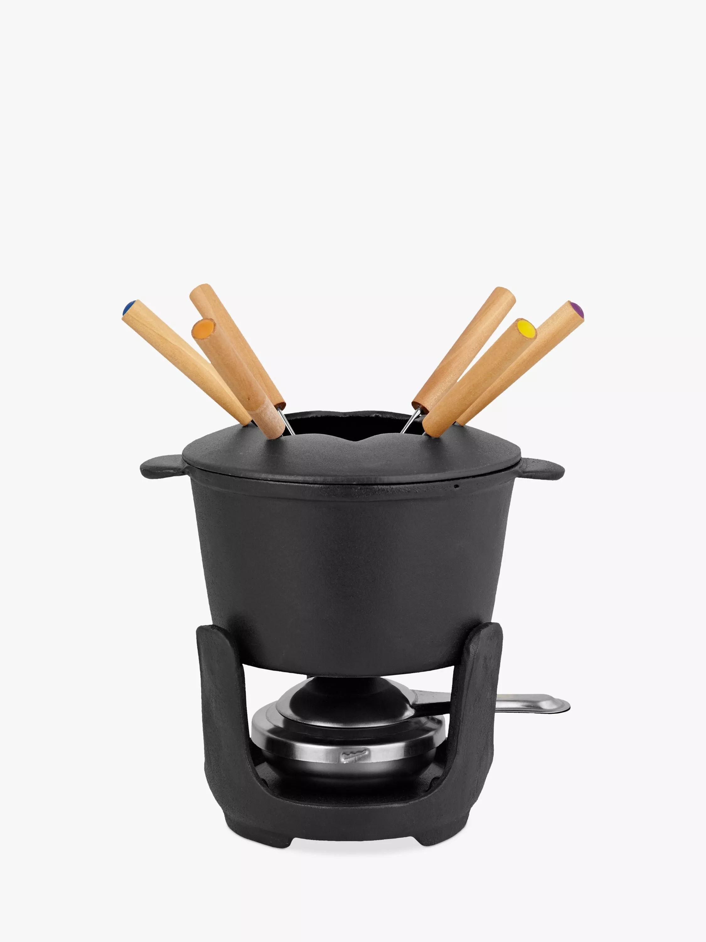 Crafted from durable cast iron that heats quickly and evenly and also retains the heat for a longer fondue experience, the set comes with six colour-coded forks and a non-splatter lid.