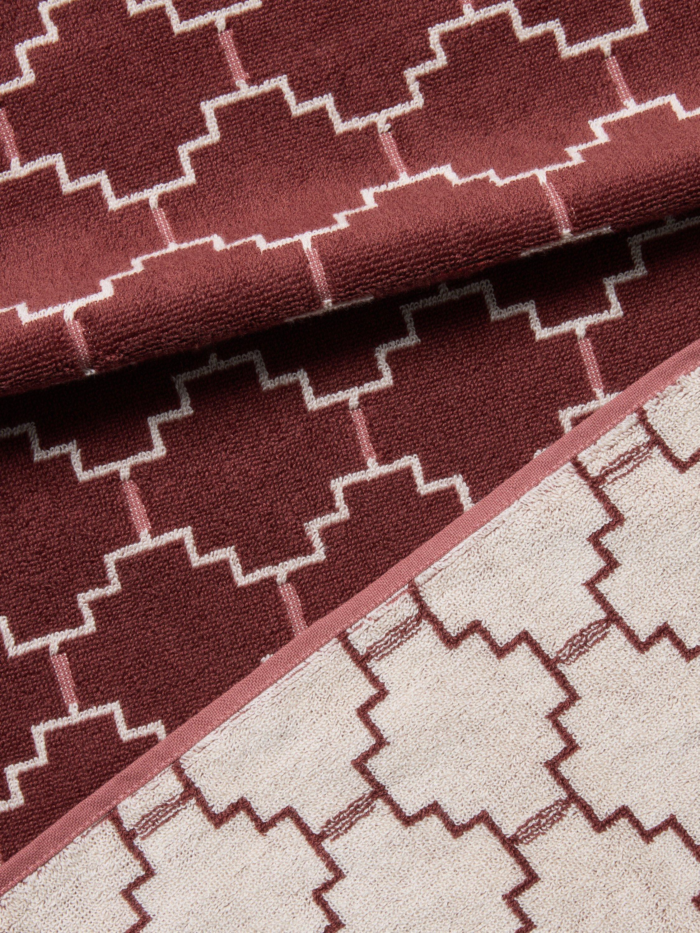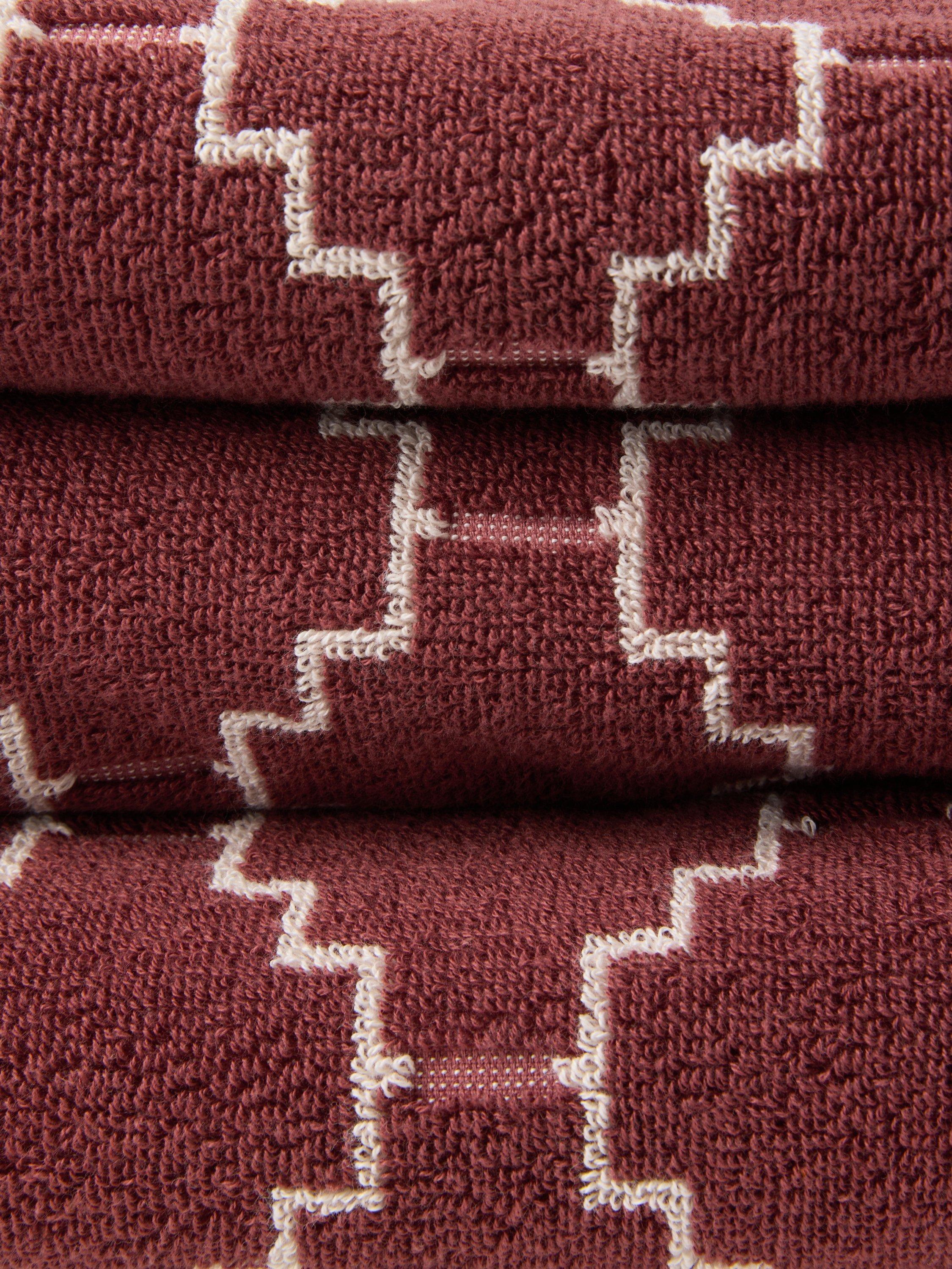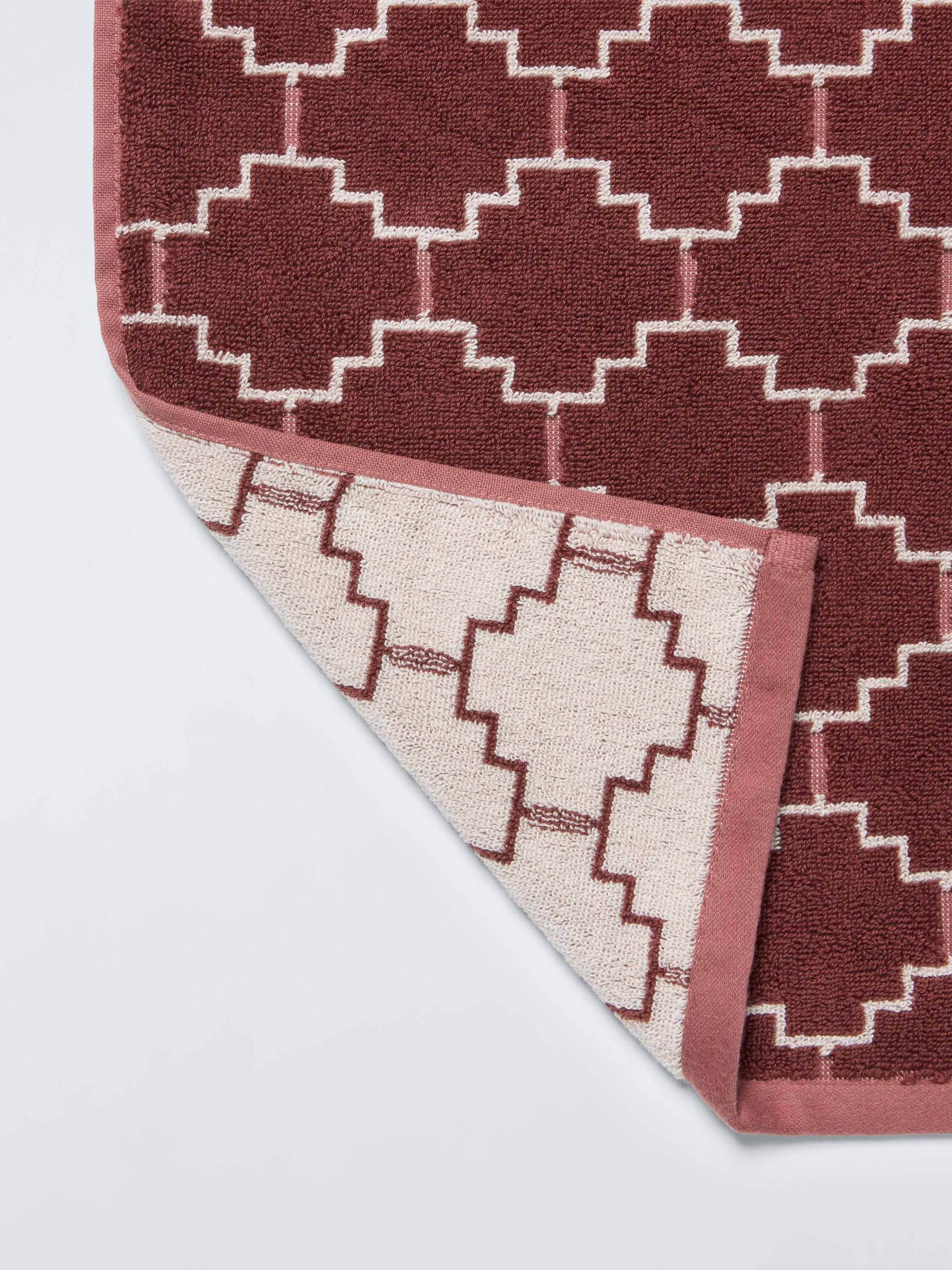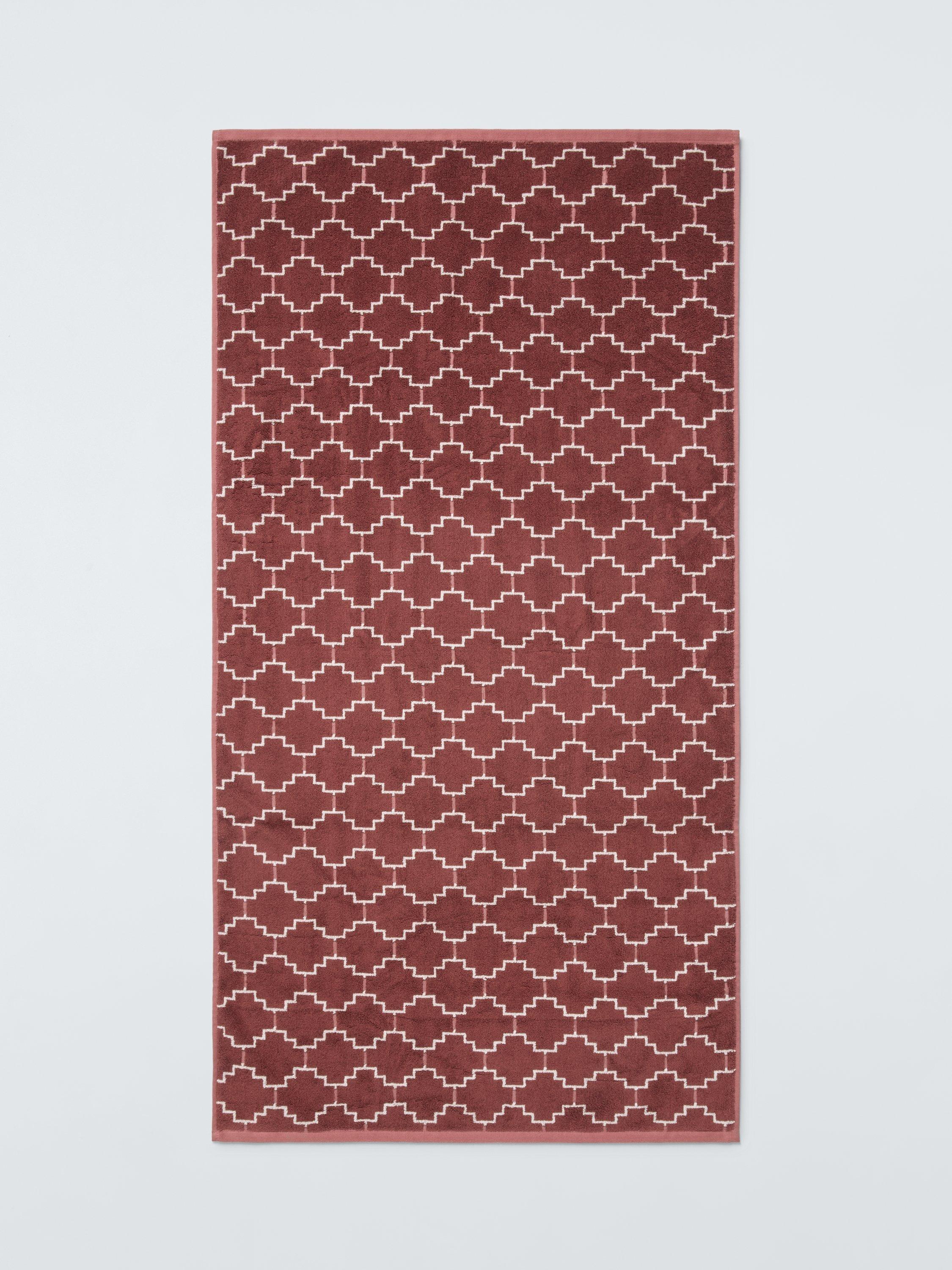 Cotton towels with a geometric trellis design.