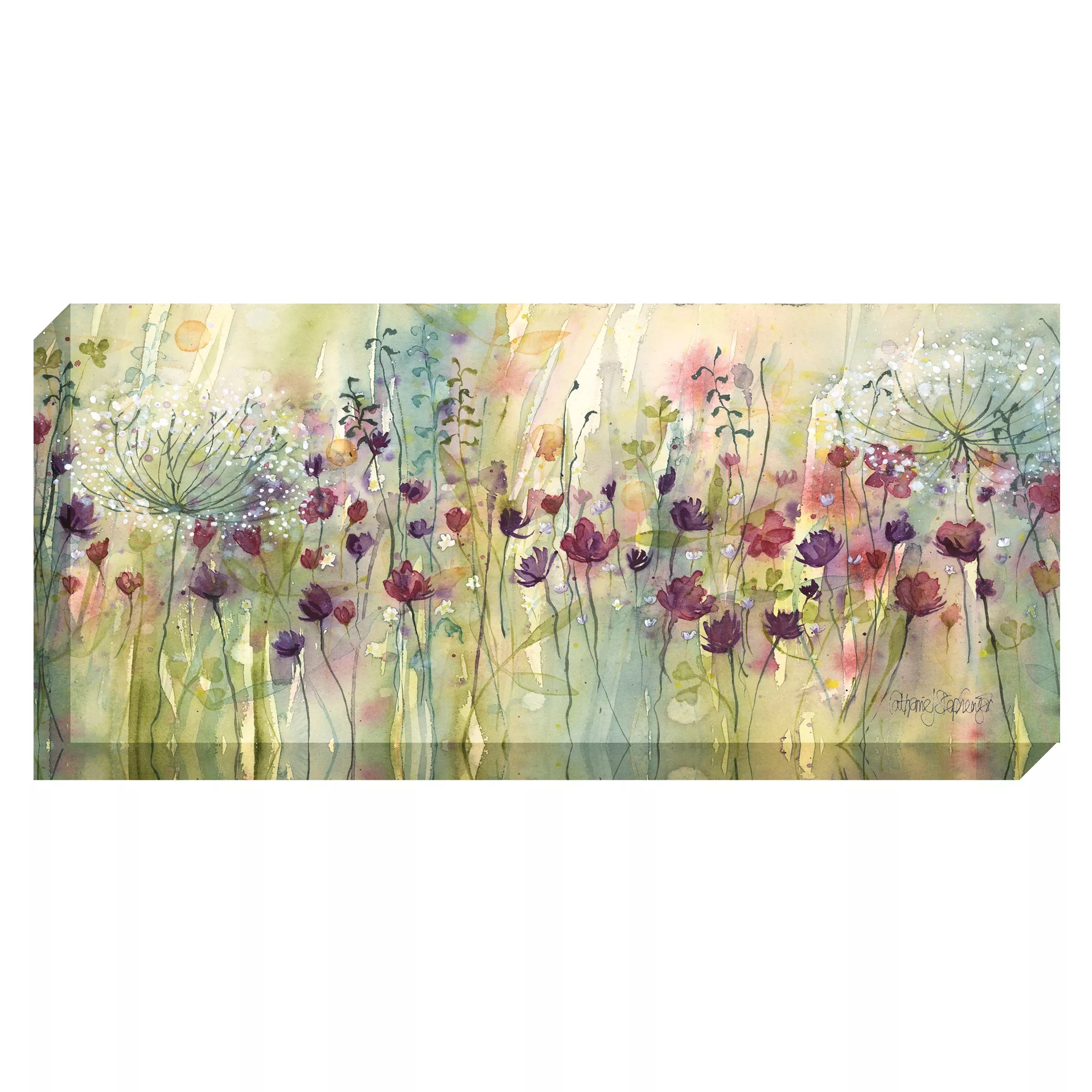 A beautiful watercolour print with a stunning, dramatic perspective of height and the power of nature. Splashes of pinks and violets are used against a natural green background to create this floral canvas.
