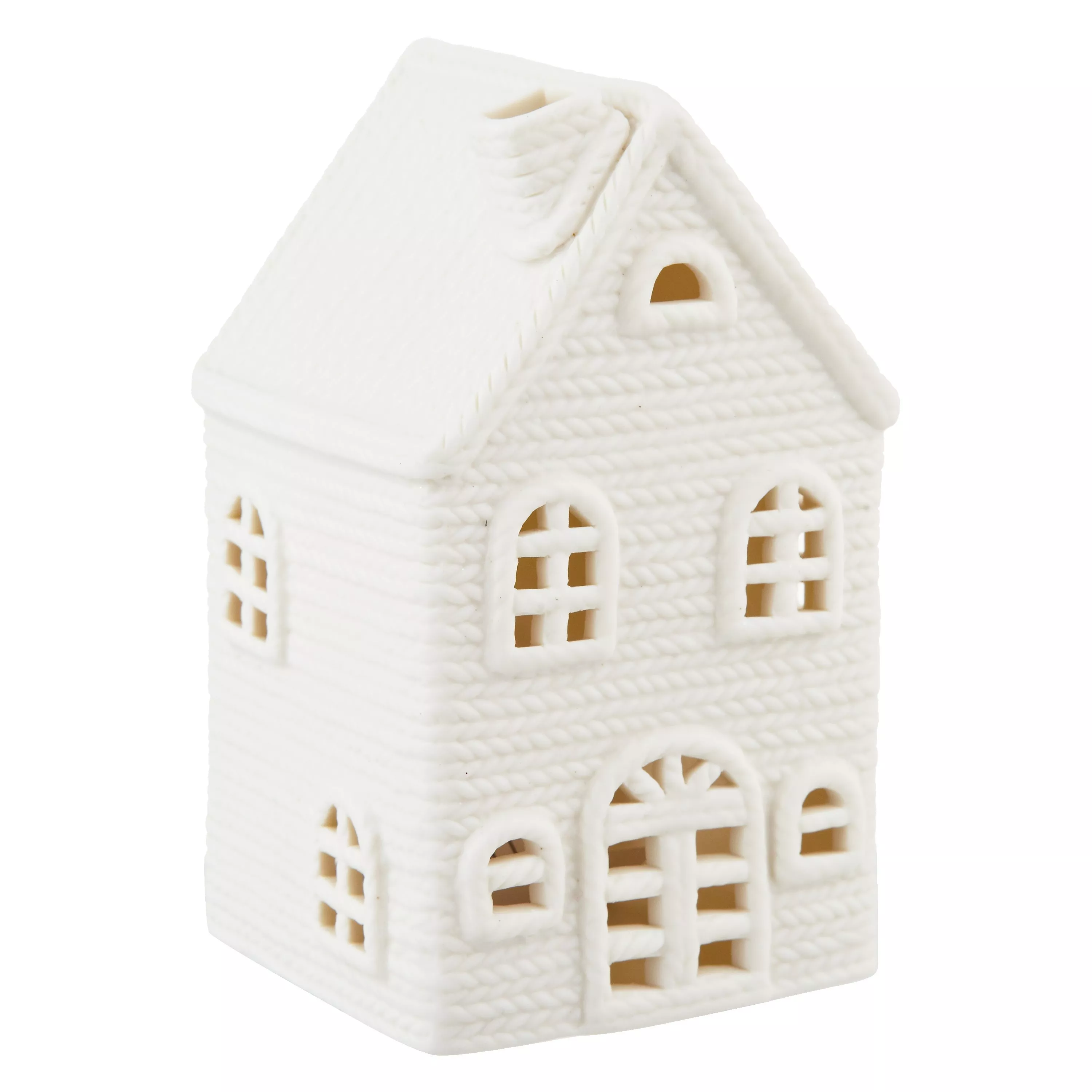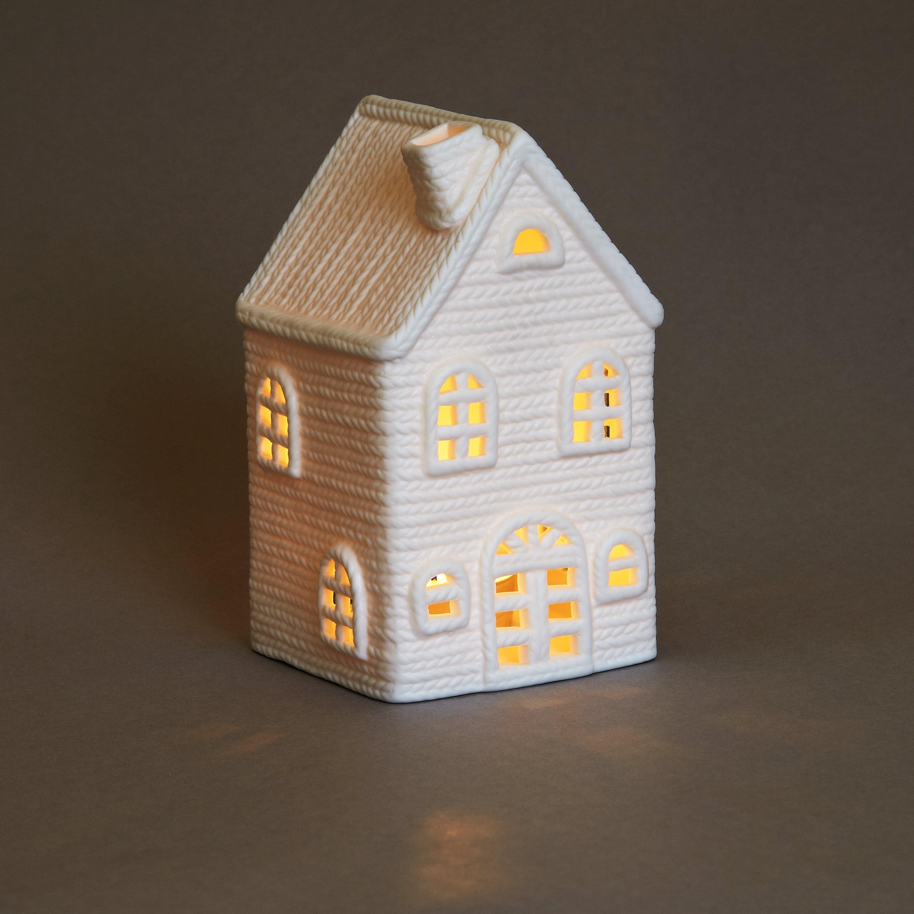Create a heart-warming display with this ceramic tealight holder, made to look like a lit up home on a winter's eve. With windows and door frames to emit light, the white ceramic is finished with a cable-knit finish.
