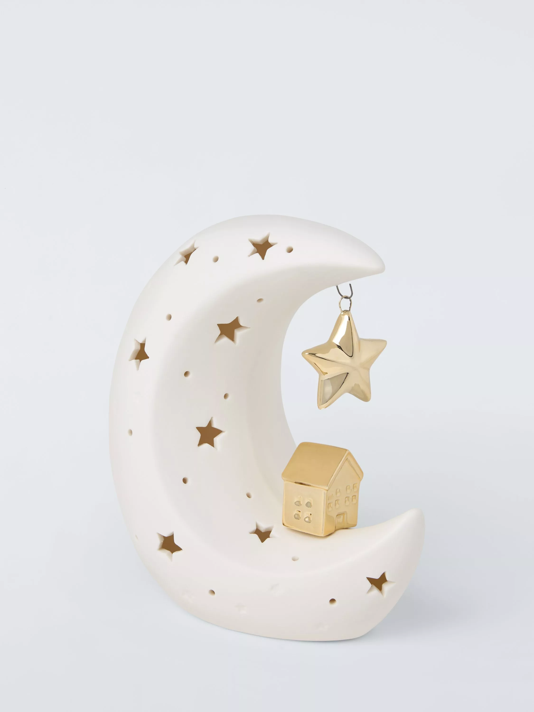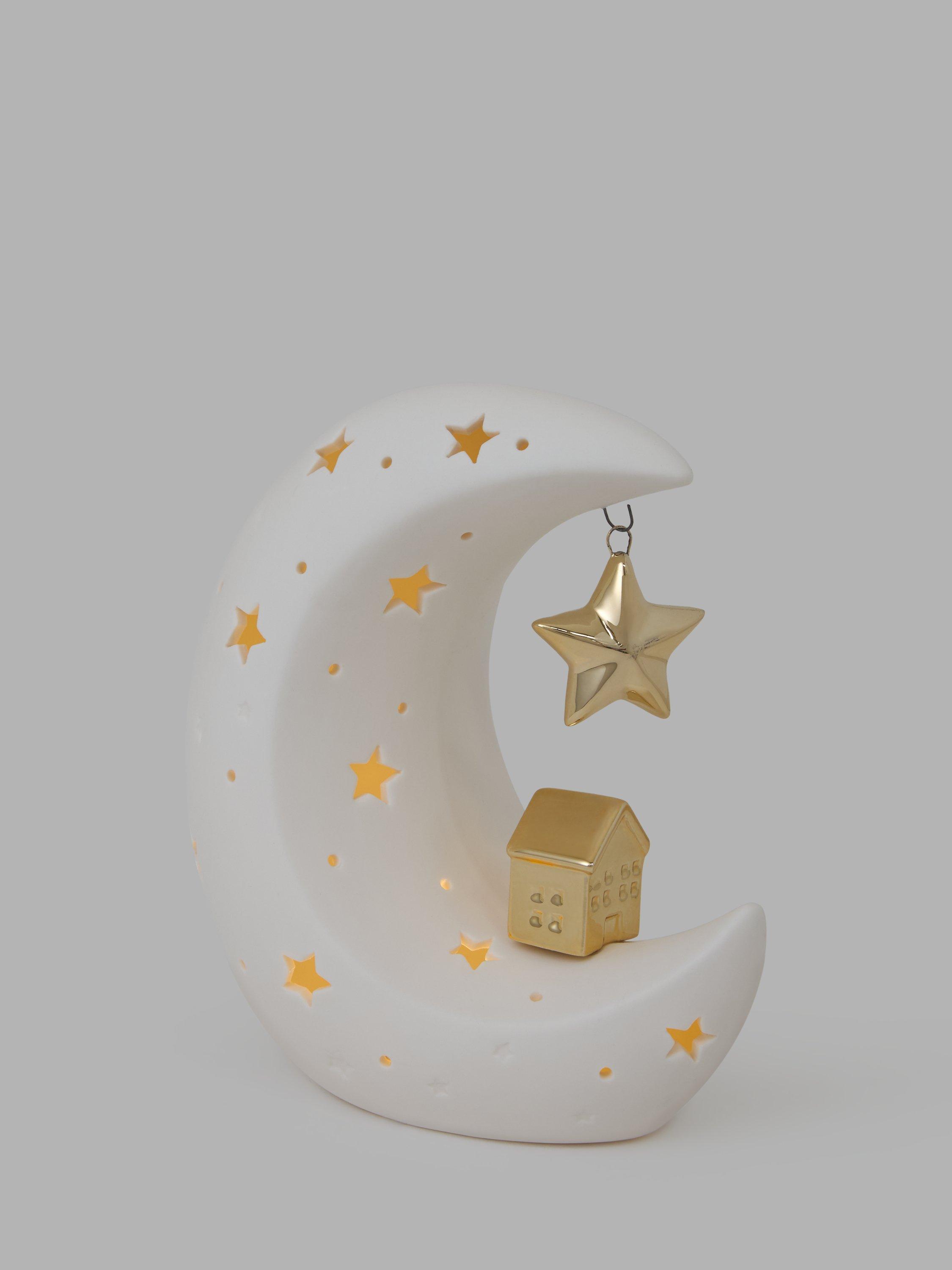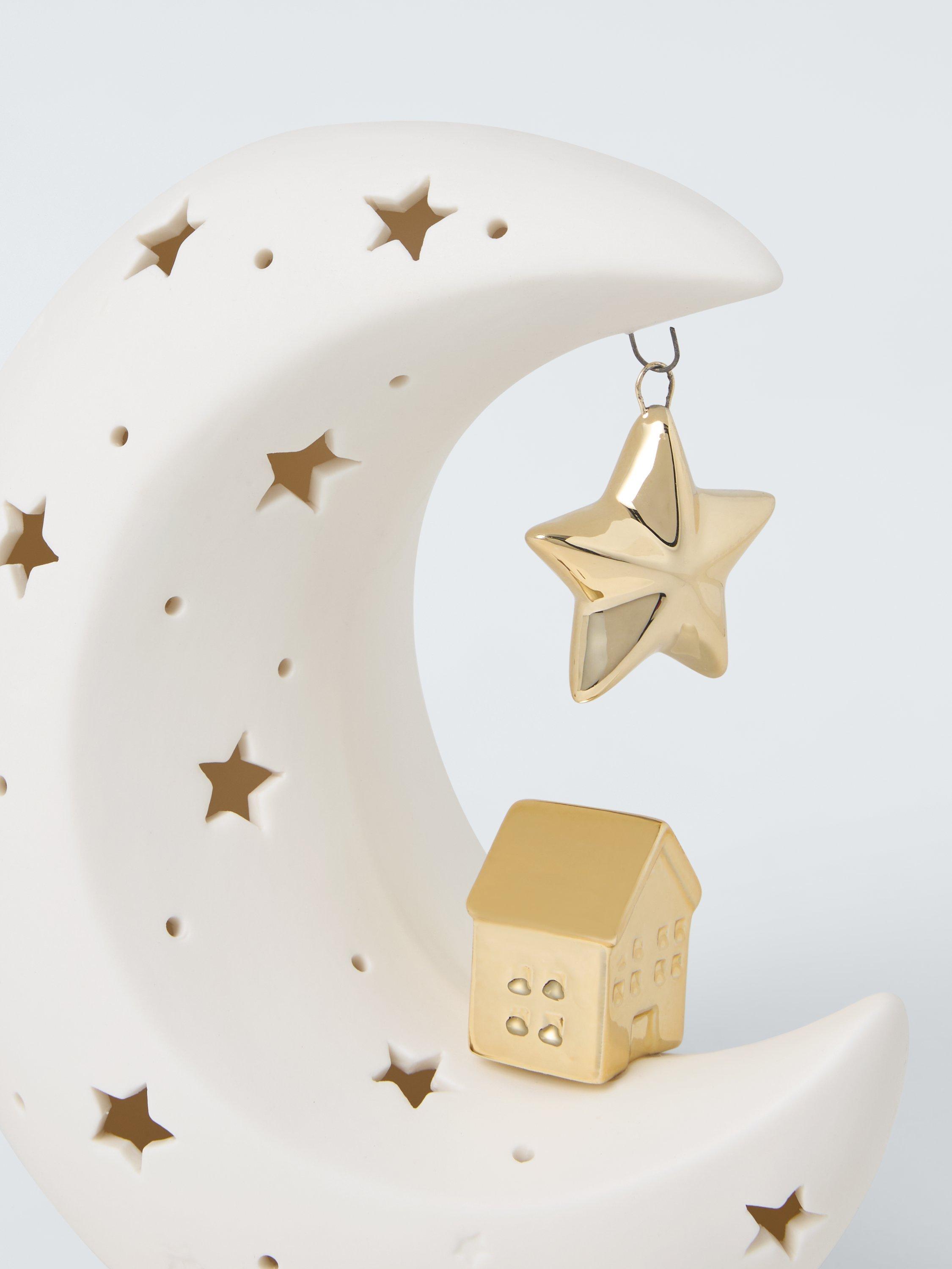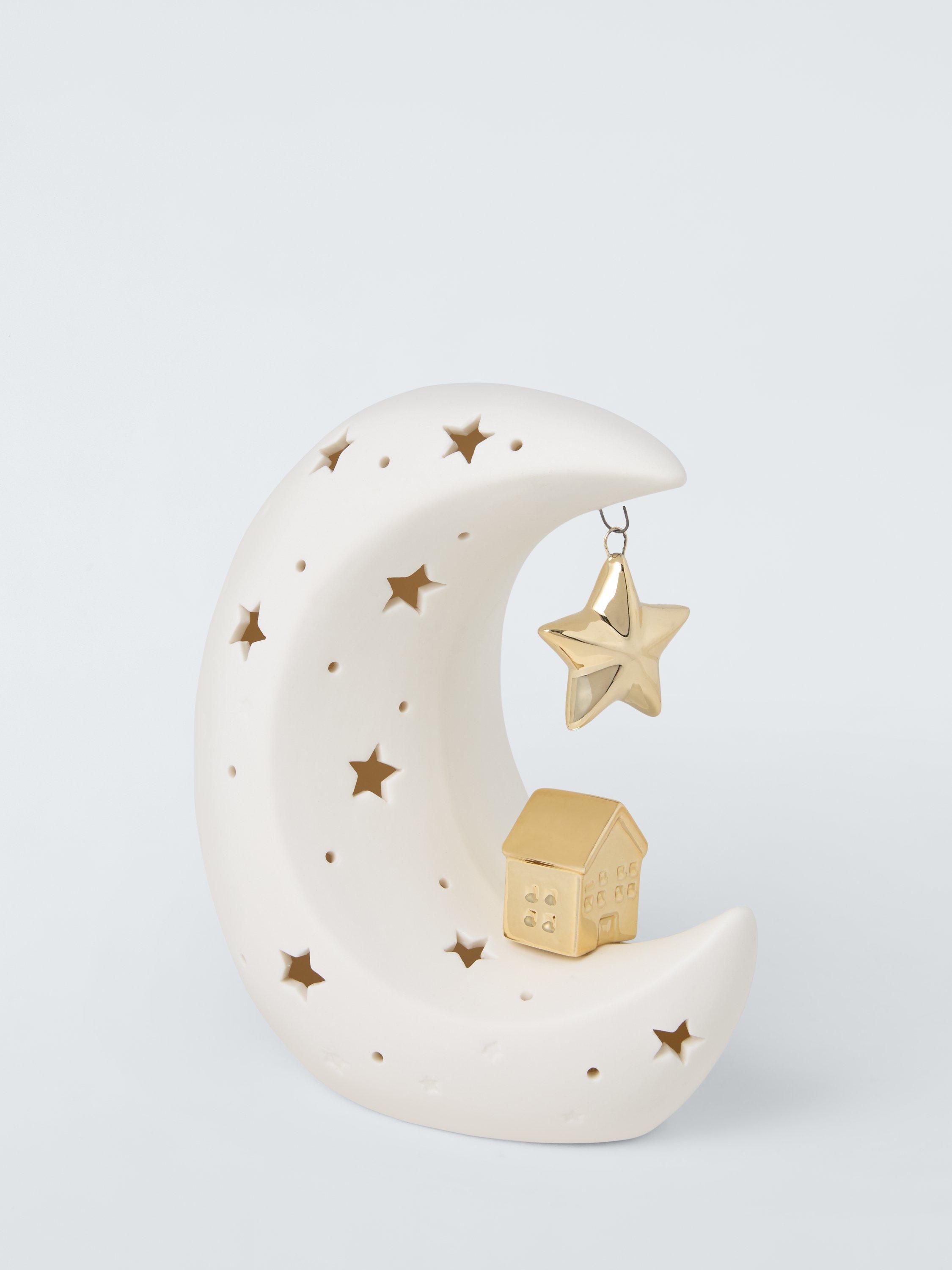 The soft glow of this enchanting ceramic moon decoration is supplied by an integral LED tealight which uses replaceable LR44 batteries.