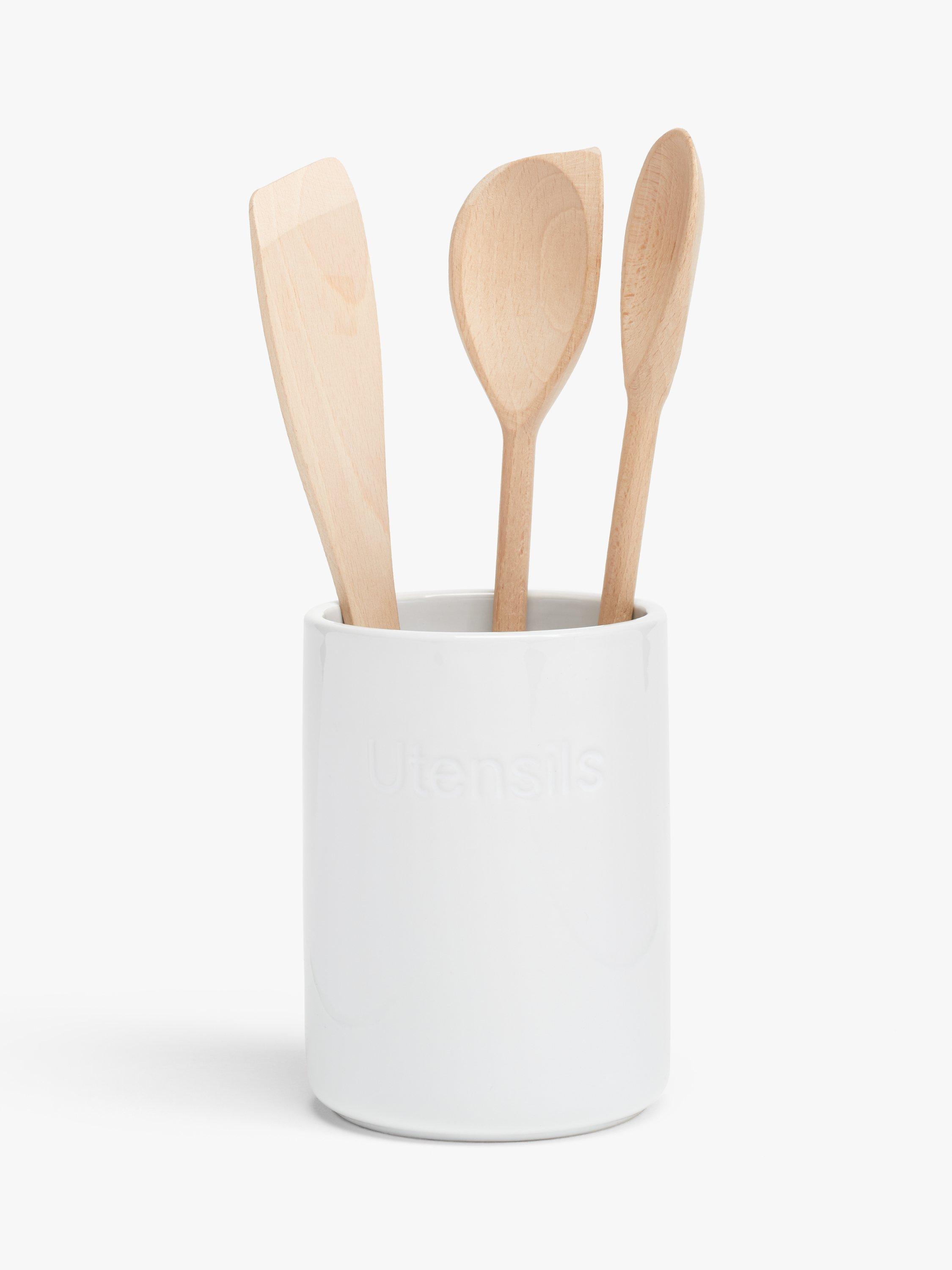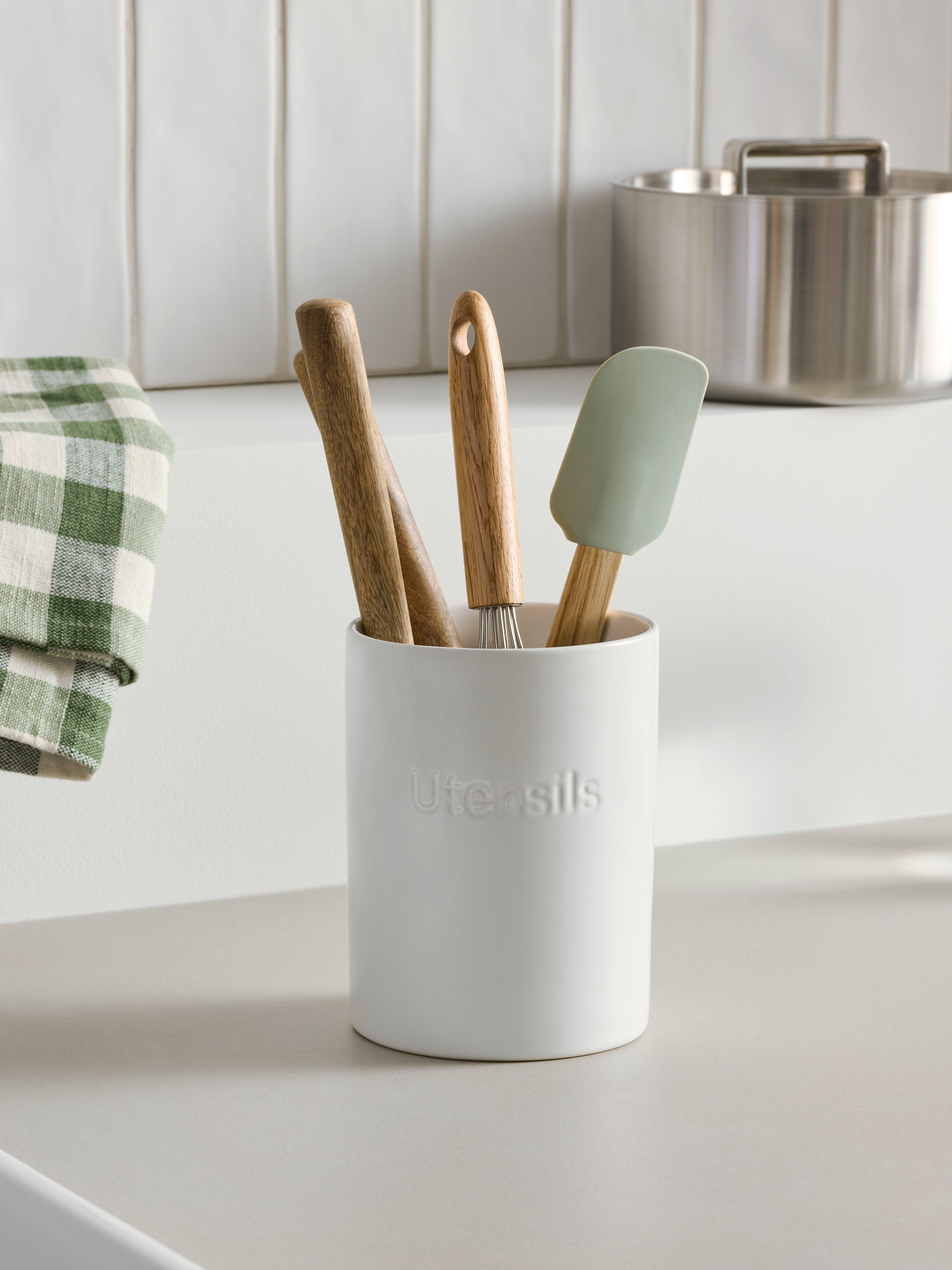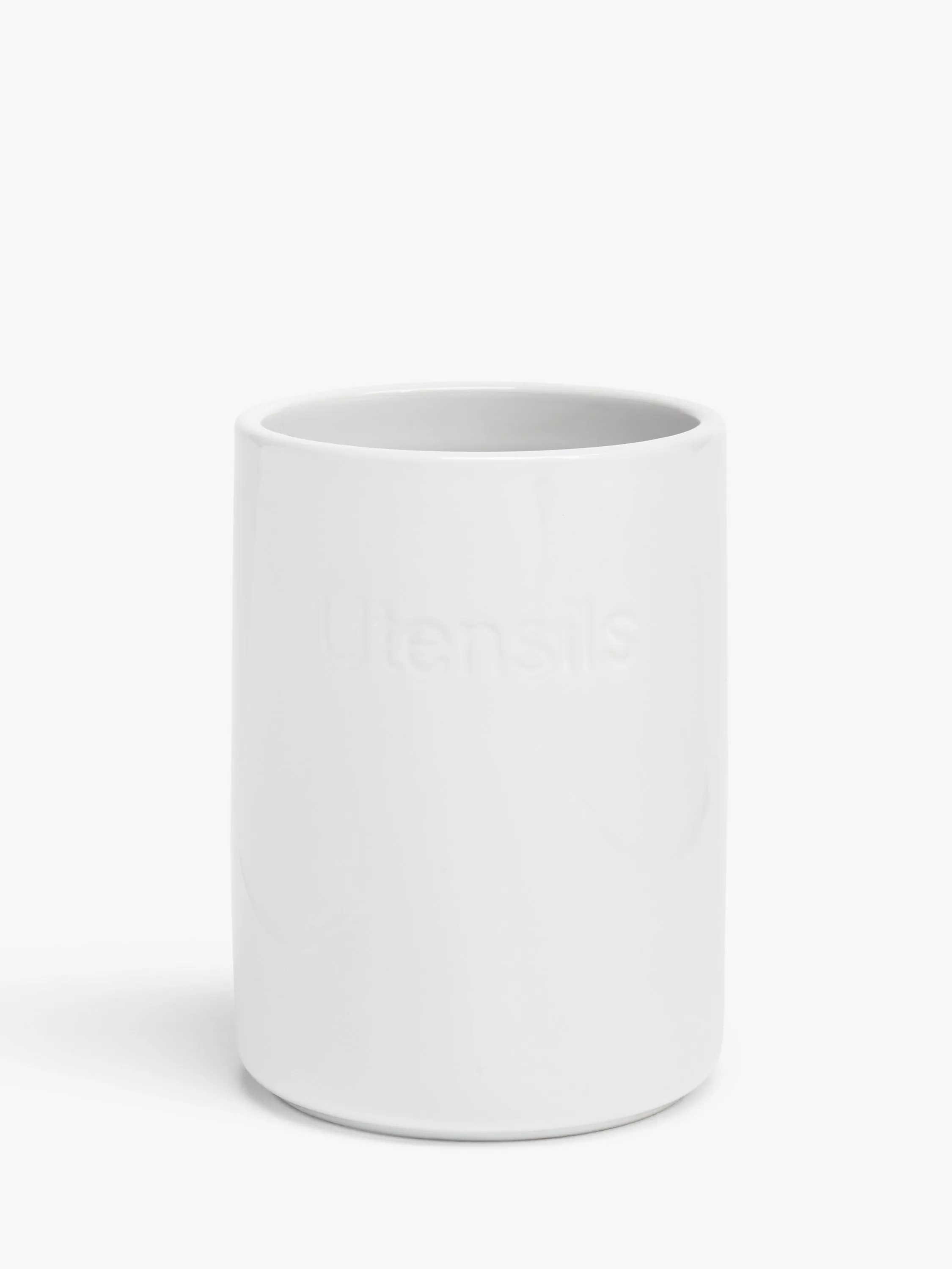 Keep kitchen utensils all together in this stoneware holder with 'Utensils' debossed on its side. Finish in a white glaze, this jar suits contemporary and traditional kitchens.